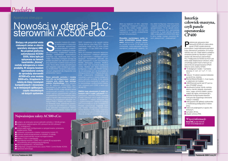 Produkty Aparatura sterująca Bieżący rok przyniósł wiele ciekawych zmian w ofercie aparatury sterującej ABB. Na przykład platforma automatyzacji AC500/ S500, która była już opisywana na łamach kwartalnika „Dzisiaj”, została wzbogacona o nowe produkty. W sierpniu bowiem wprowadzone zostały do sprzedaży sterowniki AC500-eCo oraz moduły S500-eCo. Urządzenia te należą do klasy rozwiązań kompaktowych i stosowane są w mniejszych aplikacjach, często niezależnych od dużych systemów. S terowniki i moduły eCo znajdują zastosowanie w maszynach dla przemysłu spożywczego, w oczyszczalniach i przepompowniach, instalacjach energetyki odnawialnej, urządzeniach transportu bliskiego, rozdzielnicach nowoczesnych budynków oraz niezliczonej ilości innych miejsc. Od tej klasy rozwiązań wymaga się przede wszystkim jak najniższych kosztów przy zachowaniu możliwie dużej funkcjonalności. Nowa oferta została zaprojektowana jako integralna część istniejącej już platformy AC500/S500. Oznacza to wiele bardzo cennych udogodnień dla integratorów oraz producentów maszyn. Nowe jednostki centralne i moduły serii eCo są konfigurowane i programowane przy użyciu tego samego pakietu inżynierskiego, który używany jest dla większych AC500/S500. Oprogramowanie to nosi nazwę PS501 Control Builder AC500, a jego aktualna wersja oznaczona jest numerami 1.3.2. Kolejnym bardzo ważnym udogodnieniem jest pełna kompatybilność CPU oraz modułów wejść/ wyjść w ramach całej rozszerzonej obecnie platformy. Do modułowych jednostek centralnych PM571, PM58x oraz PM59x można dostawiać nowe, połówkowej szerokości moduły I/O serii S500-eCo i odwrotnie, tj. do jednostek kompaktowych PM554, PM564 można dostawiać moduły I/O serii Najważniejsze zalety AC500-eCo: nw ydajne, ale atrakcyjne cenowo jednostki centralne z 128 kB pamięci, n z integrowane wejścia/wyjścia: 8/6 cyfrowych lub 6/6 cyfrowych + 2/1 analogowych, n funkcje wejść/wyjść konfigurowane w oprogramowaniu: przerwania, szybkie liczniki, PWM, n możliwość rozszerzenia o lokalne i rozproszone moduły I/O, n wtykowe zaciski przyłączeniowe w modułach: 3 rodzaje, n do podtrzymania pamięci nie jest wymagana bateria, n Modbus i CS31 w standardzie, n optymalizacja kosztów: COM2, RTC i czytnik SD są opcjonalne i nie podnoszą ceny podstawowej konfiguracji, n pełna kompatybilność z AC500/S500, n konfiguracja i programowanie przy użyciu PS501 Control Builder AC500, n najnowsza technologia. 30 Dzisiaj Październik 2009 S500. Uzupełniona w ten sposób rodzina oferuje obecnie cztery klasy CPU – łącznie szesnaście modeli oraz 22 różne moduły wejść/wyjść – 12 typu S500 oraz 10 typu S500-eCo. Mimo że omawiane sterowniki dedykowane są maszynom i mniejszym aplikacjom, to nie zapomniano o interfejsach komunikacyjnych. Kompaktowe jednostki centralne wyposażono w port komunikacyjny RS485 obsługujący protokoły Modbus, ASCII, CS31 oraz oczywiście podłączenie on-line. Możliwe jest także rozszerzenie konfiguracji o kolejny port RS485 różniący się od pierwszego tym, że nie posiada on obsługi protokołu CS31. Odbywa się to poprzez umieszczenie miniaturowej karty rozszerzeń w jednym z dwóch dostępnych slotów jednostki centralnej. W ten sposób sterownik można wyposażyć w: zegar czasu rzeczywistego z podtrzymaniem bateryjnym, omówiony port COM2, a także czytnik kart SD. Wszystkie wyróżniające cechy rodziny AC500/S500 zostały zachowane: elastyczność i łatwość rozbudowy, montaż na szynie TH-35 bądź płycie montażowej, zoptymalizowane wymiary zewnętrzne, przejrzystość systemu i ła- PM554 mają wbudowane 8 wejść cyfrowych oraz 6 wyjść cyfrowych tranzystorowych, natomiast PM564 posiadają 6 wejść cyfrowych oraz 6 wyjść cyfrowych i dodatkowo 2 wejścia analogowe oraz 1 wyjście analogowe. Lokalnie do każdego CPU można dołączyć aż do 7 modułów I/O. Ponadto wykorzystując magistralę CS31 oraz moduły interfejsowe DC551-CS31 można stworzyć konfigurację z rozproszonymi wejściami/wyjściami S500 i S500-eCo. Obecnie dostępne sterowniki serii eCo za- twy dobór konfiguracji, minimalne koszty i wygoda użytkowania dzięki wspólnemu oprogramowaniu. W ten sposób ekonomiczne rozwiązania eCo wprowadzają użytkownika w świat techniki sterującej ABB, a cała platforma AC500/S500 dzięki temu nadaje nowego znaczenia słowom „elastyczność” i „skalowalność”. P odobnie jak opisywane obok sterowniki AC500-eCo także oferta paneli CP400 została starannie przemyślana i zoptymalizowana pod kątem liczby oferowanych produktów, ich funkcjonalności oraz cen. Dzięki takiemu podejściu omawiane panele są naturalnym uzupełnieniem dla oferowanych sterowników PLC. Podłączenie do AC500 lub AC31 jest łatwe dzięki dedykowanym driverom, które umożliwiają szybki import zmiennych ze sterownika do oprogramowania CPSoft. Główne cechy rodziny CP400: n 13 dostępnych modeli, 7 rozmiarów ekranów: 3”, 3,5”, 4,7”, 5,7”, 7”, 7,5”, 10,4”, n matryce: 16 odcieni szarości/niebieskiego lub 64 tys. kolorów, n RS232/RS422/RS485 (1, 2 lub 3 porty w zależności od modelu), n USB/Ethernet/czytnik kart CF (od modelu CP430BP wzwyż), n wbudowane funkcje: trendy, wykresy, alarmy, mierniki, bargrafy, wysuwane menu, zegar, ochrona hasłem, przesuwające się napisy, animowane gif-y… n dowolnie konfigurowalne klawisze funkcyjne dla wygodnego sterowania maszyn i instalacji, n wiele języków dla aplikacji użytkownika z możliwością przełączania w trakcie pracy, n makra lub podprogramy w języku drabinkowym, n symulator off-line, n stopień ochrony IP65. Więcej informacji: Michał Wilk, tel. 032 79 09 236 e-mail: [email protected] Fot. na kolumnach: Arch. ABB Nowości w ofercie PLC: sterowniki AC500-eCo silane są napięciem 24 VDC, natomiast w najbliższych miesiącach w ofercie pojawią się dwa kolejne modele zasilane napięciem z zakresu 100…
