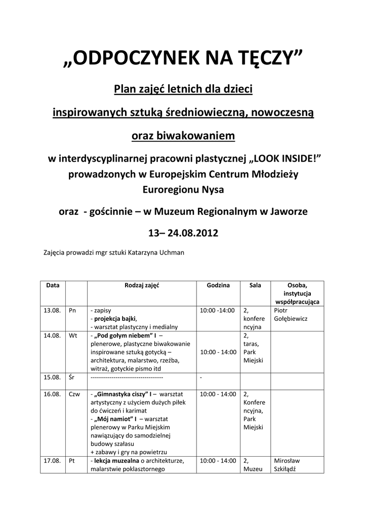 „ODPOCZYNEK NA TĘCZY” Plan zajęć letnich dla dzieci inspirowanych sztuką średniowieczną, nowoczesną oraz biwakowaniem w interdyscyplinarnej pracowni plastycznej „LOOK INSIDE!” prowadzonych w Europejskim Centrum Młodzieży Euroregionu Nysa oraz - gościnnie – w Muzeum Regionalnym w Jaworze 13– 24.08.2012 Zajęcia prowadzi mgr sztuki Katarzyna Uchman Data 13.08. Pn 14.08. Wt 15.08. Śr 16.08. Czw 17.08. Pt Rodzaj zajęć Godzina Sala - zapisy - projekcja bajki, - warsztat plastyczny i medialny - „Pod gołym niebem” I – plenerowe, plastyczne biwakowanie inspirowane sztuką gotycką – architektura, malarstwo, rzeźba, witraż, gotyckie pismo itd ----------------------------------- 10:00 -14:00 2, konfere ncyjna 2, taras, Park Miejski - „Gimnastyka ciszy” I – warsztat artystyczny z użyciem dużych piłek do ćwiczeń i karimat - „Mój namiot” I – warsztat plenerowy w Parku Miejskim nawiązujący do samodzielnej budowy szałasu + zabawy i gry na powietrzu - lekcja muzealna o architekturze, malarstwie poklasztornego 10:00 - 14:00 2, Konfere ncyjna, Park Miejski 10:00 - 14:00 2, Muzeu 10:00 - 14:00 Osoba, instytucja współpracująca Piotr Gołębiewicz - Mirosław Szkiłądź 20.08. Pn 21.08. Wt 22.08. Śr 23.08. Czw 24.08. Pt muzealnego kompleksu, codziennym życiu średniowiecznych franciszkanów, piśmie gotyckim - „za klauzurą” - zabawa terenowa korzystająca ze zdobytej wiedzy o zabytku i tajemniczym życiu mnichów - projekcja bajki, - warsztat plastyczny i medialny m Muzeum Regional Regionalne w ne Jaworze 10:00 - 14:00 2, konfere ncyjna 2, taras, Park Miejski, Muzeu m Regional ne - „Pod gołym niebem” II – plenerowe, plastyczne biwakowanie inspirowane sztuką gotycką – architektura, malarstwo, rzeźba, witraż, gotyckie pismo itd. - lekcja muzealna o freskach w przyklasztornym kościele - „warsztat tęczowy” – zajęcia plastyczne inspirowane odsłoniętymi przez ASP w Krakowie (od 1976 do lat 90-tych XX w) freskami na łuku tęczowym i ścianach Galerii Śląskiej Sztuki Sakralnej -------------------------------------- 10:00 - 14:00 - „Gimnastyka ciszy” II – warsztat artystyczny z użyciem dużych piłek do ćwiczeń i karimat - „Mój namiot” II – warsztat plenerowy w Parku Miejskim + zabawy i gry na powietrzu - Wyjście na Rynek Miejski – plener akcyjny - „Biwak pod tęczą” - zakończenie programu dla dzieci w Ecmen 10:00 - 14:00 2, Konfere ncyjna, Park Miejski 10:00 - 14:00 2, Rynek, taras, kawiarni a Piotr Gołębiewicz Anna Grynszpan Muzeum Regionalne w Jaworze - O PROGRAMIE: „ODPOCZYNEK NA TĘCZY” to cykl dwutygodniowych (od poniedziałku do piątku) zajęć dla dzieci, gdzie dominują warsztaty artystyczne inspirowane współczesnymi bajkami (np. Disney’a), sztuką średniowieczną i nowoczesną oraz wakacyjnymi formami odpoczynku - biwakowaniem itp. W ramach warsztatów dzieci zapoznają się z nowoczesnymi technikami artystycznymi – body art., happening, performance, film, fotografia, instalacja i wideo instalacja oraz będą się uczyć metod i środków wyrażania własnych myśli poprzez sztukę. Dodatkowym wyzwaniem będzie wprowadzenie elementów związanych ze sztuką średniowieczną – włącznie z lekcją muzealną na temat zabytków średniowiecznych i codzienności Bernardynów i działaniami artystycznymi na terenie Muzeum Regionalnego w Jaworze. Zadaniem uczestników będzie więc min. dokonywanie trafnych syntez międzyepokowych. W program wpisane są również inne atrakcyjne wydarzenia: projekcje bajek, gry, zabawy na świeżym powietrzu, wspólne herbatki i akcje artystyczne.