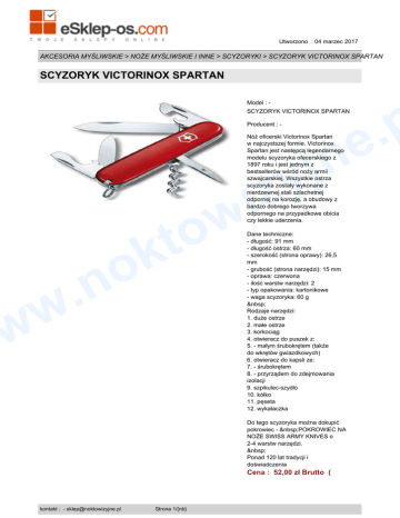 w Utworzono : 04 marzec 2017 AKCESORIA MYŚLIWSKIE > NOŻE MYŚLIWSKIE I INNE > SCYZORYKI > SCYZORYK VICTORINOX SPARTAN SCYZORYK VICTORINOX SPARTAN p . e Model : SCYZORYK VICTORINOX SPARTAN Producent : - n j y iz Nóż oficerski Victorinox Spartan w najczystszej formie. Victorinox Spartan jest następcą legendarnego modelu scyzoryka ofecerskiego z 1897 roku i jest jednym z bestsellerów wśród noży armii szwajcarskiej. Wszystkie ostrza scyzoryka zostały wykonane z nierdzewnej stali szlachetnej odpornej na korozję, a obudowy z bardzo dobrego tworzywa odpornego na przypadkowe obicia czy lekkie uderzenia. w o t k o .n Dane techniczne: - długość: 91 mm - długość ostrza: 60 mm - szerokość (strona oprawy): 26,5 mm - grubość (strona narzędzi): 15 mm - oprawa: czerwona - ilość warstw narzędzi: 2 - typ opakowania: kartonikowe - waga scyzoryka: 60 g Rodzaje narzędzi: 1. duże ostrze 2. małe ostrze 3. korkociąg 4. otwieracz do puszek z: 5. - małym śrubokrętem (także do wkrętów gwiazdkowych) 6. otwieracz do kapsli ze: 7. - śrubokrętem 8. - przyrządem do zdejmowania izolacji 9. szpikulec-szydło 10. kółko 11. pęseta 12. wykałaczka w w Do tego scyzoryka można dokupić pokrowiec - POKROWIEC NA NOŻE SWISS ARMY KNIVES o 2-4 warstw narzędzi. Ponad 120 lat tradycji i doświadczenia Cena : 52,00 zł Brutto ( kontakt : - [email protected] Strona 1/{nb} w Utworzono : 04 marzec 2017 AKCESORIA MYŚLIWSKIE > NOŻE MYŚLIWSKIE I INNE > SCYZORYKI > SCYZORYK VICTORINOX SPARTAN SCYZORYK VICTORINOX SPARTAN p . e 42,28 zł Netto) n j y iz w o t k o .n Dostępność: Produkt dostępny w naszym sklepie od 06 grudzień 2011 w w kontakt : - [email protected] Strona 2/{nb}