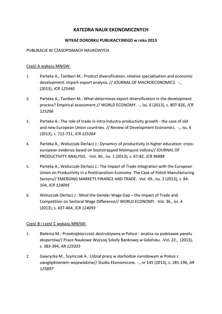 KATEDRA NAUK EKONOMICZNYCH WYKAZ DOROBKU PUBLIKACYJNEGO w roku 2013 PUBLIKACJE W CZASOPISMACH NAUKOWYCH Część A wykazu MNiSW: 1. Parteka A., Tamberi M.: Product diversification, relative specialisation and economic development: import-export analysis. // JOURNAL OF MACROECONOMICS. -., (2013), JCR 125440 2. Parteka A., Tamberi M.: What determines export diversification in the development process? Empirical assessment.// WORLD ECONOMY. -., iss. 6 (2013), s. 807-826, JCR 125266 3. Parteka A.: The role of trade in intra industry productivity growth - the case of old and new European Union countries. // Review of Development Economics. -., iss. 4 (2013), s. 712-731, JCR 125264 4. Parteka A., Wolszczak-Derlacz J.: Dynamics of productivity in higher education: crosseuropean evidence based on bootstrapped Malmquist indices// JOURNAL OF PRODUCTIVITY ANALYSIS. -Vol. 40., iss. 1 (2013), s. 67-82, JCR 96888 5. Parteka A., Wolszczak-Derlacz J.: The Impact of Trade Integration with the European Union on Productivity in a Posttransition Economy: The Case of Polish Manufacturing Sectors// EMERGING MARKETS FINANCE AND TRADE. -Vol. 49., iss. 3 (2013), s. 84104, JCR 124095 6. Wolszczak-Derlacz J.: Mind the Gender Wage Gap – the Impact of Trade and Competition on Sectoral Wage Difference// WORLD ECONOMY. -Vol. 36., iss. 4 (2013), s. 437-464, JCR 124093 Część B i część C wykazu MNiSW: 1. Bielenia M.: Przedsiębiorczość destruktywna w Polsce - analiza na podstawie panelu ekspertów// Prace Naukowe Wyższej Szkoły Bankowej w Gdańsku. -Vol. 22., (2013), s. 383-394, AR 125025 2. Gawrycka M., Szymczak A.: Udział pracy w dochodzie narodowym w Polsce z uwzględnieniem województw// Studia Ekonomiczne. -., nr 145 (2013), s. 185-196, AR 125897 3. Gawrycka M., Szymczak A.: ZMIANA STRUKTURY DOCHODÓW W POLSCE W RELACJI KAPITAŁ–PRACA Z UWZGLĘDNIENIEM SEKTORÓW GOSPODARKI NARODOWEJ// Ekonomia. Prace Naukowe Uniwersytetu Ekonomicznego we Wrocławiu. -., nr 305 (2013), s. 163-173, AR 127079 4. Gawrycka M., Szymczak A.: Zmiany udziału pracy w dochodzie narodowym a nierówności społeczne na przykładzie państw Grupy Wyszehradzkiej// Studia Ekonomiczne. Zeszyty Naukowe Uniwersytetu Ekonomicznego w Katowicach.-., nr 145 (2013), s. 103-111, AR 125895 5. Gawrycka M., Szymczak A.: ZNACZENIE CZYNNIKA PRACY W DOCHODZIE NARODOWYM // Studia Ekonomiczne. -., nr 160 (2013), s. 83-91, AR 126802 6. Gawrycka M., Szymczak A.: ZRÓŻNICOWANIE RYNKÓW PRACY NA PRZYKŁADZIE KRAJÓW GRUPY WYSZEHRADZKIEJ // Studia Ekonomiczne. -., nr 160 (2013), s. 73-82, AR 126800 7. Kaszubowski M.: MODELE PŁAC TYPU MINCERA NA PRZYKŁADZIE PRACOWNIKÓW NAUKOWO-DYDAKTYCZNYCH POLSKICH WYŻSZYCH UCZELNI PUBLICZNYCH// Metody ilościowe w badaniach ekonomicznych. -Vol. XIV., nr 3 (2013), s. 39-50, AR 127460 8. Kaszubowski M.: Płaca progowa pracowników naukowo-dydaktycznych polskich wyższych uczelni publicznych w warunkach hipotetycznego kontraktu// Nierówności społeczne a wzrost gospodarczy. -., nr 31 (2013), s. 239-257, AR 127459 9. Kot S. , Adamkiewicz-Drwiłło H.: Rekonstrukcja światowego rozkładu dochodów na podstawie minimalnej informacji statystycznej// Śląski Przegląd Statystyczny. -Vol. 11., nr 17 (2013), s. 179-200, AR 126034 10. Kot S. , Słaby T.: Ocena jakości życia wschodzącej klasy wyższej w Polsce// Śląski Przegląd Statystyczny. -Vol. 11., nr 17 (2013), s. 209-227, AR 126038 11. Lechman E.: New Technologies Adoption and Diffusion Patterns in Developing Countries. An Empirical Study for the Period 2000-2011// EQUILIBRIUM. -Vol. 8., iss. 4 (2013), s. 79-106, AR 125843 12. Lechman E.: Zróżnicowanie gospodarek pod względem poziomu wdrożenia nowoczesnych technologii. Analiza empiryczna// Studia Ekonomiczne. Zeszyty Naukowe Uniwersytetu Ekonomicznego w Katowicach. -Vol. 139., (2013), s. 155-164, AR 123715 13. Marszk A.: Economic significance of initial public offerings in China and India// Journal of Economy, Business and Financing. -Vol. 1., nr 1 (2013), s. 24-31, AR 124413 14. Marszk A.: Funkcje sektora bankowego w gospodarce: przypadek Indii// Ekonomia. Prace Naukowe Uniwersytetu Ekonomicznego we Wrocławiu. -., nr 1 (22) (2013), s. 110-126, AR 124412 15. Mikulska A.: PRZEDSIĘBIORCZE PODEJŚCIE DO ZARZĄDZANIA ORGANIZACJĄ// Prace Naukowe Wyższej Szkoły Bankowej w Gdańsku. -., (2013), s. 407-420, AR 125101 16. Nikulin D.: Analiza poziomu i dynamiki płac na przykładzie Polski i Niemiec// Studia Ekonomiczne. Zeszyty Naukowe Uniwersytetu Ekonomicznego w Katowicach. -., nr 160 (2013), s. 223-232, AR 127447 17. Parteka A.: The evolving structure of Polish exports (1994-2010) - diversification of products and trade partners. // Bank i Kredyt. -., iss. 5 (2013), s. 435-466, AR 125728 18. Parteka A.: Trade differentiation and the characteristics of new imported and exported products - international panel data analysis// Roczniki Kolegium Analiz Ekonomicznych. -Vol. 30., (2013), s. 203-217, AR 126043 19. Parteka A.: Trade diversity and stages of development - evidence on EU countries. // Ekonomia. Rynek, gospodarka, społeczeństwo. -., nr 30 (2013), s. 23-44, AR 125268 20. Sobiechowska-Ziegert A., Mikulska A.: MEASURE OF THE LEVEL OF SOCIO-ECONOMIC DEVELOPMENT IN PROVINCES// Metody ilościowe w badaniach ekonomicznych. -Vol. XIV., nr 2 (2013), s. 200-209, AR 126292 21. Wolszczak-Derlacz J.: Kształcić czy propwadzić badania naukowe? Analiza efektywności kształcenia i efektywności naukowej na przykładzie wybranych publicznych szkół wyższych w Polsce// Edukacja. -., nr 2 (122) (2013), s. 20-33, AR 124091 22. Wolszczak-Derlacz J.: The impact of gender wage gap on sectoral economic growth – cross-country approach// EQUILIBRIUM. -Vol. 8., iss. 3 (2013), s. 103-122, AR 126363 23. Parteka A., Wolszczak-Derlacz J.: Integrated Sectors - Diversified Earnings: The (Missing) Impact of Offshoring on Wages and Wage Convergence in the EU27// Institute for Research on Labor and Employment Working Paper Series, I