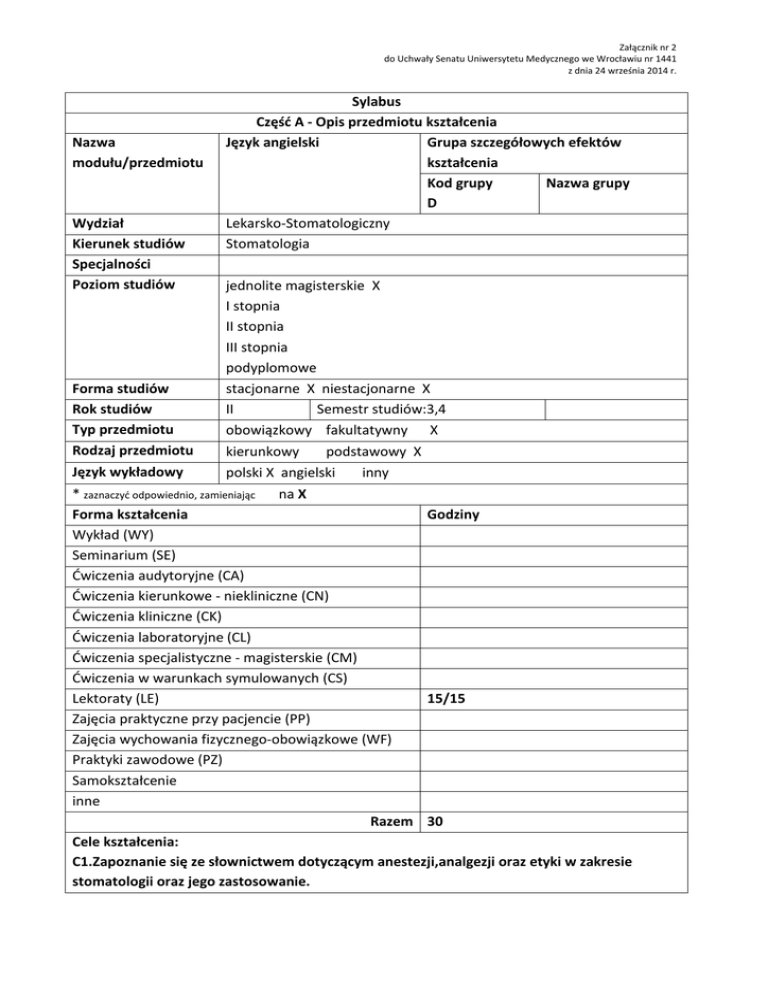 Załącznik nr 2 do Uchwały Senatu Uniwersytetu Medycznego we Wrocławiu nr 1441 z dnia 24 września 2014 r. Nazwa modułu/przedmiotu Wydział Kierunek studiów Specjalności Poziom studiów Forma studiów Rok studiów Typ przedmiotu Rodzaj przedmiotu Język wykładowy Sylabus Część A - Opis przedmiotu kształcenia Język angielski Grupa szczegółowych efektów kształcenia Kod grupy Nazwa grupy D Lekarsko-Stomatologiczny Stomatologia jednolite magisterskie X I stopnia II stopnia III stopnia podyplomowe stacjonarne X niestacjonarne X II Semestr studiów:3,4 obowiązkowy fakultatywny X podstawowy X kierunkowy inny polski X angielski * zaznaczyć odpowiednio, zamieniając na X Forma kształcenia Godziny Wykład (WY) Seminarium (SE) Ćwiczenia audytoryjne (CA) Ćwiczenia kierunkowe - niekliniczne (CN) Ćwiczenia kliniczne (CK) Ćwiczenia laboratoryjne (CL) Ćwiczenia specjalistyczne - magisterskie (CM) Ćwiczenia w warunkach symulowanych (CS) Lektoraty (LE) 15/15 Zajęcia praktyczne przy pacjencie (PP) Zajęcia wychowania fizycznego-obowiązkowe (WF) Praktyki zawodowe (PZ) Samokształcenie inne Razem 30 Cele kształcenia: C1.Zapoznanie się ze słownictwem dotyczącym anestezji,analgezji oraz etyki w zakresie stomatologii oraz jego zastosowanie. C2.Wykształcenie umiejętności formułowania pisemnych i ustnych wypowiedzi naukowych. C3.Wykształcenie umiejętności prezentacji ustnej. Macierz efektów kształcenia dla modułu/przedmiotu w odniesieniu do metod weryfikacji zamierzonych efektów kształcenia oraz formy realizacji zajęć: Numer efektu kształcenia przedmiotowego Numer efektu kształcenia kierunkowego Student, który zaliczy moduł/przedmiot wie/umie/potrafi U 01 D.U.18 U 01 D.U.19 Student potrafi w języku angielskim,porozumieć się z pacjentem , określić charakter zmian postępowanie w przypadku chorób z dziedziny stomatologii,umie zdefiniować problemy etyczno prawne dotyczące stomatologii Student analizuje piśmiennictwo w jęz. \ angielskim z zakresu stomatologii, wyciąga i formułuje wnioski, potrafi skonstruować artykuł fachowy i opis przypadku Metody weryfikacji osiągnięcia zamierzonych efektów kształcenia (formujące i podsumowujące) Forma zajęć dydaktycznych Test cząstkowy odpowiedź ustna prezentacja LE Odpowiedź ustna wypowiedź pisemna w formie streszczenia/artykułu/op isu przypadku LE ** wpisz symbol ** WY - wykład; SE - seminarium; CA - ćwiczenia audytoryjne; CN - ćwiczenia kierunkowe (niekliniczne); CK - ćwiczenia kliniczne; CL -ćwiczenia laboratoryjne; CM – ćwiczenia specjalistyczne (mgr); CS - ćwiczenia w warunkach symulowanych; LE - lektoraty; zajęcia praktyczne przy pacjencie - PP; WF - zajęcia wychowania fizycznego (obowiązkowe); PZ- praktyki zawodowe; SK samokształcenie Proszę oznaczyć krzyżykami w skali 1-3 jak powyższe efekty lokują państwa zajęcia w działach: przekaz wiedzy, umiejętności czy kształtowanie postaw np.: Wiedza + Umiejętności + ++ Postawy Nakład pracy studenta (bilans punktów ECTS): Forma nakładu pracy studenta Obciążenie studenta (h) (udział w zajęciach, aktywność, przygotowanie sprawdzenie, itp.) 1. Godziny kontaktowe 30 2. Czas pracy własnej studenta 15 Sumaryczne obciążenie pracy studenta 45 Punkty ECTS za moduł/przedmiotu 0,5/0,5 Uwagi Treść zajęć: (proszę wpisać hasłowo tematykę poszczególnych zajęć z podziałem na formę zajęć dydaktycznych, pamiętając, aby przekładała się ona na zamierzone efekty kształcenia) Wykłady 1. 2. 3. Seminaria 1. 2. 3. Ćwiczenia 1.Błędy przy zbieraniu wywiadu stomatologicznego (szczególne uwzględnienie pacjenta trudnego) 2.Sposoby radzenia sobie z bólem 3.Ból zęba-środki przeciwbólowe 4.Anestezja w stomatologii 5.Trauma związana z zabiegami stomatologicznymi 6.Odontologia sądowa 7.Etyczne i prawne aspekty pracy stomatologa 8.Stomatologia w mediach i reklamie 9.Idiomy,symbole i skróty używane w stomatologii 10.Analiza przykładu oryginalnego artykułu/opisu przypadku z dziedziny stomatologii. 11.Ćwiczenia praktyczne w ustnym i pisemnym referowaniu analizy danych (grafy, diagramy, tabele) 13.Konstruowanie poprawnego streszczenia ,artykułu naukowego,opisu przypadku. 14.Podstawy dobrej prezentacji. 15.Zaliczenie w formie prezentacji z dziedzin: anestezji ,analgezji lub etyki. Inne 1. 2. 3. itd…. Literatura podstawowa: (wymienić wg istotności, nie więcej niż 3 pozycje) 1.Open Your English Wide0K.Studzińska-Pasieka, Marcin Otto 2. 3. Literatura uzupełniająca i inne pomoce: (nie więcej niż 3 pozycje) 1.Materiały i opracowania należące do SJO 2. 3. Wymagania dotyczące pomocy dydaktycznych: (np. laboratorium, rzutnik multimedialny, inne…) rzutnik multimedialny Warunki wstępne: (minimalne warunki, jakie powinien student spełnić przed przystąpieniem do modułu/przedmiotu) Znajomość jęz.angielskiego na poziomie B2 Warunki uzyskania zaliczenia przedmiotu: (określić formę i warunki zaliczenia zajęć wchodzących w zakres modułu/przedmiotu, zasady dopuszczenia do egzaminu końcowego teoretycznego i/lub praktycznego, jego formę oraz wymagania jakie student powinien spełnić by go zdać, a także kryteria na poszczególne oceny) 1.Obecność na zajęciach. Maximum 10% nieusprawiedliwionych zajęć. 2.Zaliczenie testów cząstkowych. 3.Aktywny udział w zajęciach. 4.Zaliczenie w formie prezentacji. Ocena: Bardzo dobra (5,0) Ponad dobra (4,5) Dobra (4,0) Dość dobra (3,5) Dostateczna (3,0) Kryteria oceny: (tylko dla przedmiotów/modułów kończących się egzaminem, ) Nazwa i adres jednostki prowadzącej moduł/przedmiot, kontakt: tel. i adres email …STUDIUM JĘZYKÓW OBCYCH, ul.Mikulicza Radeckiego 7, tel:71 784 14 82 e mail: [email protected] Wykaz osób prowadzących poszczególne zajęcia: Imię i Nazwisko, stopień/tytuł naukowy lub zawodowy, dziedzina naukowa, wykonywany zawód, forma prowadzenia zajęć . mgr Dagmara Drozd Data opracowania sylabusa Sylabus opracował(a) ……………