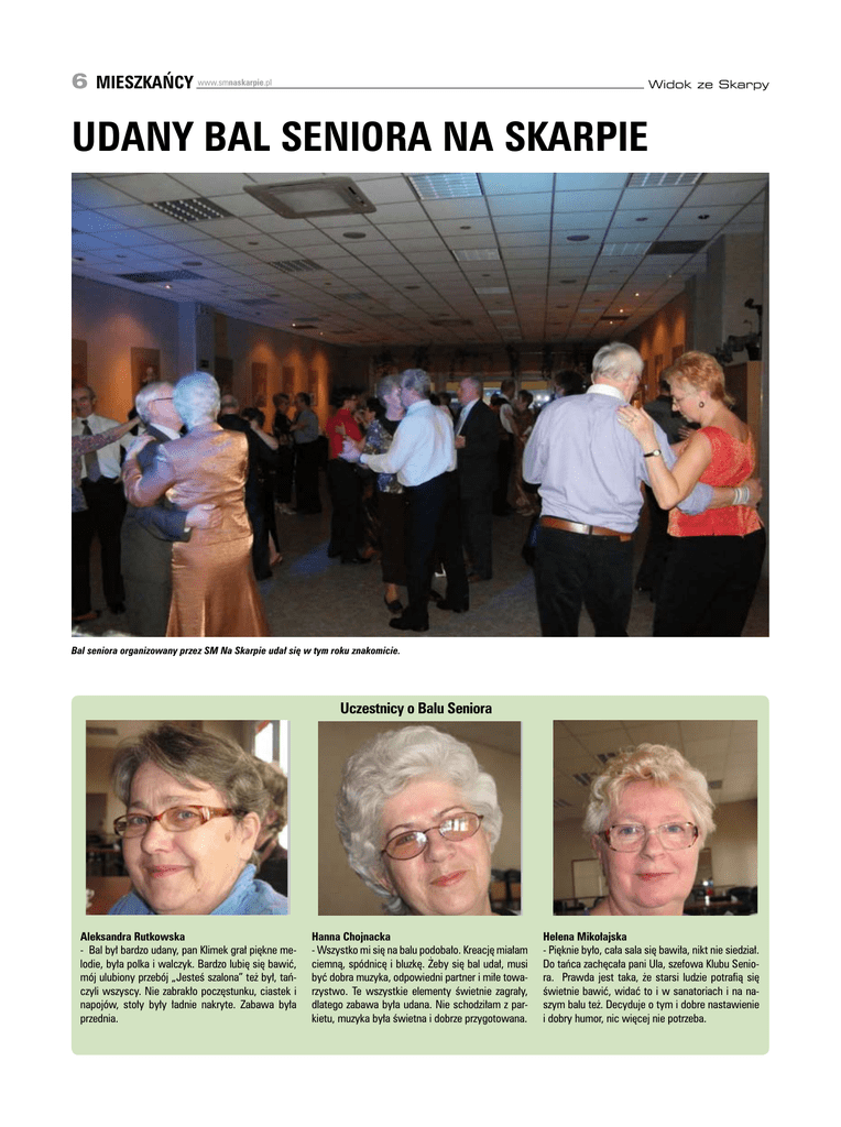 6 mieszkańcy www.smnaskarpie.pl Widok ze Skarpy Udany bal Seniora Na Skarpie Bal seniora organizowany przez SM Na Skarpie udał się w tym roku znakomicie. Uczestnicy o Balu Seniora Aleksandra Rutkowska - Bal był bardzo udany, pan Klimek grał piękne melodie, była polka i walczyk. Bardzo lubię się bawić, mój ulubiony przebój „Jesteś szalona” też był, tańczyli wszyscy. Nie zabrakło poczęstunku, ciastek i napojów, stoły były ładnie nakryte. Zabawa była przednia. Hanna Chojnacka - Wszystko mi się na balu podobało. Kreację miałam ciemną, spódnicę i bluzkę. Żeby się bal udał, musi być dobra muzyka, odpowiedni partner i miłe towarzystwo. Te wszystkie elementy świetnie zagrały, dlatego zabawa była udana. Nie schodziłam z parkietu, muzyka była świetna i dobrze przygotowana. Helena Mikołajska - Pięknie było, cała sala się bawiła, nikt nie siedział. Do tańca zachęcała pani Ula, szefowa Klubu Seniora. Prawda jest taka, że starsi ludzie potrafią się świetnie bawić, widać to i w sanatoriach i na naszym balu też. Decyduje o tym i dobre nastawienie i dobry humor, nic więcej nie potrzeba.