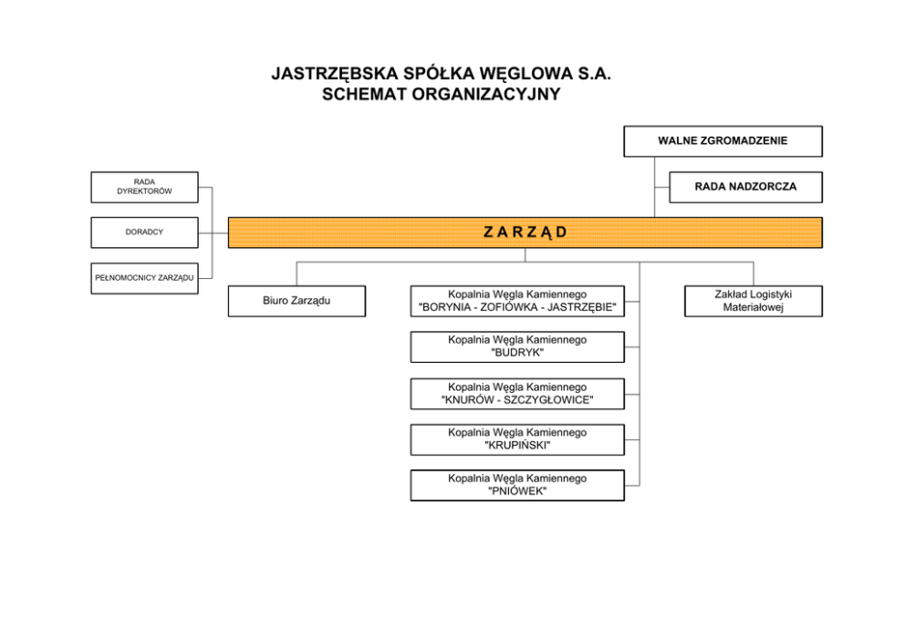 JASTRZĘBSKA SPÓŁKA WĘGLOWA S.A. SCHEMAT ORGANIZACYJNY WALNE ZGROMADZENIE RADA DYREKTORÓW RADA NADZORCZA ZARZĄD DORADCY PEŁNOMOCNICY ZARZĄDU Biuro Zarządu Kopalnia Węgla Kamiennego "BORYNIA - ZOFIÓWKA - JASTRZĘBIE" Kopalnia Węgla Kamiennego "BUDRYK" Kopalnia Węgla Kamiennego "KNURÓW - SZCZYGŁOWICE" Kopalnia Węgla Kamiennego "KRUPIŃSKI" Kopalnia Węgla Kamiennego "PNIÓWEK" Zakład Logistyki Materiałowej