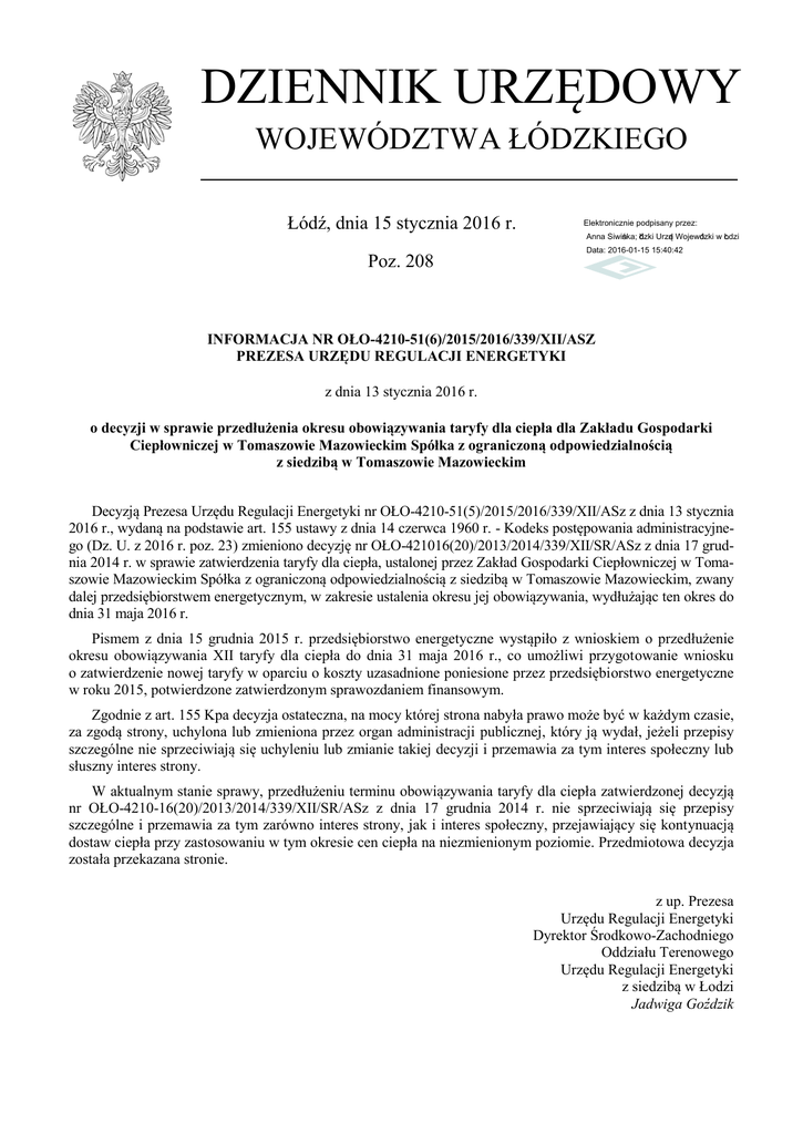 DZIENNIK URZĘDOWY WOJEWÓDZTWA ŁÓDZKIEGO Łódź, dnia 15 stycznia 2016 r. Elektronicznie podpisany przez: Anna Siwińska; Łódzki Urząd Wojewódzki w Łodzi Poz. 208 Data: 2016-01-15 15:40:42 INFORMACJA NR OŁO-4210-51(6)/2015/2016/339/XII/ASZ PREZESA URZĘDU REGULACJI ENERGETYKI z dnia 13 stycznia 2016 r. o decyzji w sprawie przedłużenia okresu obowiązywania taryfy dla ciepła dla Zakładu Gospodarki Ciepłowniczej w Tomaszowie Mazowieckim Spółka z ograniczoną odpowiedzialnością z siedzibą w Tomaszowie Mazowieckim Decyzją Prezesa Urzędu Regulacji Energetyki nr OŁO-4210-51(5)/2015/2016/339/XII/ASz z dnia 13 stycznia 2016 r., wydaną na podstawie art. 155 ustawy z dnia 14 czerwca 1960 r. - Kodeks postępowania administracyjnego (Dz. U. z 2016 r. poz. 23) zmieniono decyzję nr OŁO-421016(20)/2013/2014/339/XII/SR/ASz z dnia 17 grudnia 2014 r. w sprawie zatwierdzenia taryfy dla ciepła, ustalonej przez Zakład Gospodarki Ciepłowniczej w Tomaszowie Mazowieckim Spółka z ograniczoną odpowiedzialnością z siedzibą w Tomaszowie Mazowieckim, zwany dalej przedsiębiorstwem energetycznym, w zakresie ustalenia okresu jej obowiązywania, wydłużając ten okres do dnia 31 maja 2016 r. Pismem z dnia 15 grudnia 2015 r. przedsiębiorstwo energetyczne wystąpiło z wnioskiem o przedłużenie okresu obowiązywania XII taryfy dla ciepła do dnia 31 maja 2016 r., co umożliwi przygotowanie wniosku o zatwierdzenie nowej taryfy w oparciu o koszty uzasadnione poniesione przez przedsiębiorstwo energetyczne w roku 2015, potwierdzone zatwierdzonym sprawozdaniem finansowym. Zgodnie z art. 155 Kpa decyzja ostateczna, na mocy której strona nabyła prawo może być w każdym czasie, za zgodą strony, uchylona lub zmieniona przez organ administracji publicznej, który ją wydał, jeżeli przepisy szczególne nie sprzeciwiają się uchyleniu lub zmianie takiej decyzji i przemawia za tym interes społeczny lub słuszny interes strony. W aktualnym stanie sprawy, przedłużeniu terminu obowiązywania taryfy dla ciepła zatwierdzonej decyzją nr OŁO-4210-16(20)/2013/2014/339/XII/SR/ASz z dnia 17 grudnia 2014 r. nie sprzeciwiają się przepisy szczególne i przemawia za tym zarówno interes strony, jak i interes społeczny, przejawiający się kontynuacją dostaw ciepła przy zastosowaniu w tym okresie cen ciepła na niezmienionym poziomie. Przedmiotowa decyzja została przekazana stronie. z up. Prezesa Urzędu Regulacji Energetyki Dyrektor Środkowo-Zachodniego Oddziału Terenowego Urzędu Regulacji Energetyki z siedzibą w Łodzi Jadwiga Goździk