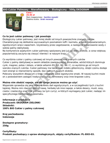Informacje o produkcie Utworzono 04-03-2017 BIO Cukier Palmowy - Nierafinowany - Ekologiczny - 500g EKOGRAM Cena : 25.95 zł Stan magazynowy : bardzo wysoki Średnia ocena : brak recenzji m .p l Co to jest cukier palmowy i jak powstaje Ekologiczny cukier palmowy, jest mniej słodki od innych powszechnie znanych cukrów. Charakteryzuje się delikatnie wyczuwalnym posmakiem toffi i karmelu, a także niepowtarzalnym, egzotycznym wręcz zapachem. Uzyskiwany przez zagotowanie, a następnie odparowanie wody z soków palmy daktylowej. Na kontynencie azjatyckim cukier palmowy spożywany jest już od wielu wieków, a coraz większą popularnością zaczyna się cieszyć również i w naszym kraju. es is .c o Co wyróżnia cukier z palmy cukrowej od innych powszechnie znanych cukrów Cukier z palmy daktylowej w swoim składzie zawiera szereg minerałów, wśród których dominuje cynk, magnez, potas i żelazo, a także witamin B1, B2, B3, B6 i C, co wyróżnia go od innych szeroko znanych cukrów. Cukier palmowy ma także niski indeks glikemiczny, dzięki czemu dodaje nam energii w równomierny sposób, bez żadnych nagłych skoków. Polecany wszystkim dbającym o linię i ceniącym sobie egzotyczne smaki. W naszej kuchni może on z powodzeniem zastąpić tradycyjny cukier rafinowany oraz inne brązowe cukry. de Można nim słodzić napoje, ale do czego jeszcze można go użyć Wspaniale sprawdza się jako składnik wielu dań egzotycznych, a w szczególności tych z kuchni tajskiej. Można nim również słodzić kawę, herbatę lub inne napoje, a także desery, musli, sosy, ciasta i ciasteczka oraz inne potrawy (w tym curry), w których wymagany jest cukier, nadając im specyficznego karmelowego posmaku. Informacje o produkcie Producent: EKOGRAM ZIELONKI Składniki: 100% BIO Cukier z palmy cukrowej Kraj pochodzenia: Indonezja Dostępne gramatury: 250g Certyfikaty: Produkt pochodzący z upraw ekologicznych, objęty certyfikatem: PL-EKO-03. Wygenerowano w programie www.oscGold.com Alergeny: Produkt może zawierać śladowe ilości glutenu, orzechów ziemnych i innych orzechów, sezamu, soi oraz mleka, ze względu na konfekcjonowanie w zakładzie, gdzie pakowane są produkty zawierające wspomniane alergeny. Termin przydatności: Wszystkie produkty pochodzą z regularnych dostaw. Cukier palmowy wartości odżywcze Wartość odżywcza w 100g produktu: ● ● ● Sól 0 g m .p l ● .c o ● Wartość energetyczna 1620 kJ / 387 kcal Tłuszcz < 0,2 g w tym kwasy tłuszczowe nasycone < 0,2 g Węglowodany 93,4 g w tym cukry 93,1 g Białko 1,66 g es is ● de ●