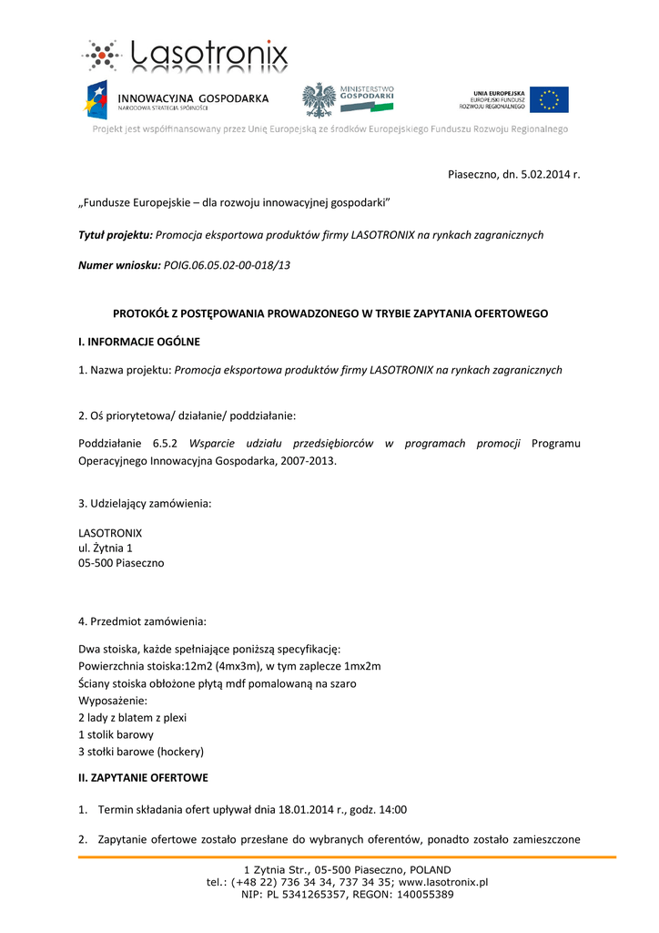 Piaseczno, dn. 5.02.2014 r. „Fundusze Europejskie – dla rozwoju innowacyjnej gospodarki” Tytuł projektu: Promocja eksportowa produktów firmy LASOTRONIX na rynkach zagranicznych Numer wniosku: POIG.06.05.02-00-018/13 PROTOKÓŁ Z POSTĘPOWANIA PROWADZONEGO W TRYBIE ZAPYTANIA OFERTOWEGO I. INFORMACJE OGÓLNE 1. Nazwa projektu: Promocja eksportowa produktów firmy LASOTRONIX na rynkach zagranicznych 2. Oś priorytetowa/ działanie/ poddziałanie: Poddziałanie 6.5.2 Wsparcie udziału przedsiębiorców w programach promocji Programu Operacyjnego Innowacyjna Gospodarka, 2007-2013. 3. Udzielający zamówienia: LASOTRONIX ul. Żytnia 1 05-500 Piaseczno 4. Przedmiot zamówienia: Dwa stoiska, każde spełniające poniższą specyfikację: Powierzchnia stoiska:12m2 (4mx3m), w tym zaplecze 1mx2m Ściany stoiska obłożone płytą mdf pomalowaną na szaro Wyposażenie: 2 lady z blatem z plexi 1 stolik barowy 3 stołki barowe (hockery) II. ZAPYTANIE OFERTOWE 1. Termin składania ofert upływał dnia 18.01.2014 r., godz. 14:00 2. Zapytanie ofertowe zostało przesłane do wybranych oferentów, ponadto zostało zamieszczone 1 Zytnia Str., 05-500 Piaseczno, POLAND tel.: (+48 22) 736 34 34, 737 34 35; www.lasotronix.pl NIP: PL 5341265357, REGON: 140055389 na stronie internetowej www.lasotronix.pl oraz w siedzibie firmy : LASOTRONIX ul. Żytnia 1 05-500 Piaseczno 3. Odebrane odpowiedzi: F-box ul. Albańska 8/4 60-123 Poznań Art-Co Okrężna 5, 05-091 Ząbki 4. Streszczenie metody oceny oferty: Wybrano ofertę F-Box. Spełnia ona wszystkie formalne oraz merytoryczne wymagania zamawiającego i uzyskała maksymalną liczbę punktów według kryteriów wyboru. Wybrany oferent był najtańszy. 5. Postępowanie przeprowadził: Łukasz Konarski – Inżynier Produktu podpis osoby/ osób upoważnionych pieczątka firmowa 1 Zytnia Str., 05-500 Piaseczno, POLAND tel.: (+48 22) 736 34 34, 737 34 35; www.lasotronix.pl NIP: PL 5341265357, REGON: 140055389