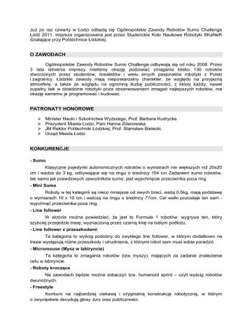 Już po raz czwarty w Łodzi odbędą się Ogólnopolskie Zawody Robotów Sumo Challenge Łódź 2011. Impreza organizowana jest przez Studenckie Koło Naukowe Robotyki SKaNeR działające przy Politechnice Łódzkiej. O ZAWODACH Ogólnopolskie Zawody Robotów Sumo Challenge odbywają się od roku 2008. Przez 3 lata istnienia imprezy mieliśmy okazję podziwiać zmagania blisko 130 robotów stworzonych przez studentów, licealistów i wielu innych pasjonatów robotyki z Polski i zagranicy. Łódzkie zawody mają niepowtarzalny charakter, ze względu na przyjazną atmosferę, a także ze względu na ogromną liczbę publiczności, z której każdy, nawet zupełny laik w dziedzinie robotyki poza obserwowaniem zmagań najlepszych robotów, ma okazję samemu je programować i budować. PATRONATY HONOROWE Minister Nauki i Szkolnictwa Wyższego, Prof. Barbara Kudrycka Prezydent Miasta Łodzi, Pani Hanna Zdanowska JM Rektor Politechniki Łódzkiej, Prof. Stanisław Bielecki. Urząd Miasta Łodzi KONKURENCJE - Sumo Klasyczne pojedynki autonomicznych robotów o wymiarach nie większych niż 20x20 cm i wadze do 3 kg, odbywające się na ringu o średnicy 154 cm Zadaniem sumo robotów, tak samo jak prawdziwych zawodników sumo, jest wypchnięcie przeciwnika poza ring. - Mini Sumo Roboty w tej kategorii są nieco mniejsze od swych braci, ważą 0,5kg, mają podstawę o wymiarach 10 x 10 cm i walczą na ringu o średnicy 77cm. Cel walki pozostaje ten sam wypchnąć przeciwnika poza ring. - Line follower W skrócie można powiedzieć, że jest to Formuła 1 robotów: wygrywa ten, który szybciej przejedzie trasę, wyznaczoną przez czarną linię na białym podłożu. - Line follower z przeszkodami Ta kategoria to wyścig podobny do zwykłego line follower, w którym dodatkowo na trasie występują różne przeszkody i utrudnienia, z którymi robot sam musi sobie poradzić. - Micromouse (Mysz w labiryncie) Ta kategoria to zmagania robotów (tzw. myszy), mających za zadanie znalezienie celu w labiryncie. - Roboty kroczące Na zawodach będzie można zobaczyć tzw. humanoid sprint – czyli wyścig robotów dwunożnych. - Freestyle Konkurs na najbardziej ciekawą i oryginalną konstrukcję robotyczną, w którym o zwycięstwie decydują głosy Jury oraz publiczności. MIEJSCE I CZAS Centrum Handlowe MANUFAKTURA – ul. Karskiego 5 5. listopada 2011 r., w godzinach 10:00 - 21:00 wstęp i udział w zawodach – bezpłatny Impreza odbywa się na terenie jednego z największych centrów handlowo-usługoworozrywkowych w Europie Środkowej - Manufaktury - która powstała w centrum Łodzi na terenie dawnych zakładów Izraela Poznańskiego, jednego z czołowych fabrykantów łódzkich. Na terenie Manufaktury znajduje się ok. 260 sklepów (w tym 2 hipermarkety). Część usługowa zajmuje 12 000 m² powierzchni biurowych, w tym bank. W Manufakturze poza sklepami znajdują się m. in.: centrum rozrywki i rekreacji (w tym kino, arena do jazdy na rolkach, kręgielnia, sztuczna ściana wspinaczkowa, fitness klub i skate park) kompleks kulturalny (oddział Muzeum Sztuki, Kinderplaneta, Muzeum Historii Miasta Łodzi, Muzeum Fabryki, Experymentarium – zalążek muzeum techniki, a także Międzynarodowe Centrum Promocji Mody) kompleks ok. 60 restauracji i kawiarni centrum samochodowe Kompleks obejmuje również Rynek (miejsce wielu wydarzeń kulturalnych) oraz wiele bezpłatnych parkingów. Więcej informacji o Manufakturze: www.manufaktura.com Jak dojechać do Manufaktury? tramwaje linii 2, 3, 6, 11, 15, 16/16A, 46 autobusy dzienne linii nr 59, 65/65A, 78/78A, 95, 99/99A autobusy nocne linii nr N1, N2, N5, N6 Mapka: Miejsce realizacji imprezy: galeria handlowa w centrum Manufaktura, trzy miejsca: rotunda (R) gdzie rozgrywają się wszystkie konkurencje – tu mieści się scena główna, stanowiska do prezentacji robotów Freestyle, zawody Swept Away oraz prezentacje gości – oglądanie wydarzeń dziejących się w rotundzie możliwe jest także z balkonów na pierwszym piętrze, przy głównym wejściu do galerii handlowej (P) – tu ma miejsce rejestracja, turniej programowania robotów –oglądanie wydarzeń dziejących się przy wejściu możliwe jest także z balkonów na pierwszym piętrze, strefa techniczna (T) – miejsce dla zarejestrowanych drużyn na ostatnie poprawki w robotach – mieści się na pierwszym piętrze Celem zwiększenia wygody zawodników na terenie Rotundy zostanie wydzielone kilka ławek, na których bez potrzeby wracania do strefy serwisowej będą mogli wprowadzić drobne poprawki lub przeprogramować robota (swoista „mini strefa serwisowa”). Z racji ograniczonej liczby ławek prosimy jednak o dzielenie się strefą z innymi zawodnikami oraz zostawienie niepotrzebnych rzeczy w strefie serwisowej (T) pod opieką organizatorów. DOJAZD W związku z gruntowną przebudową z użytku wyłączony został Dworzec Łódź Fabryczna. Z tego powodu większość ruchu kolejowego i autobusowego przejęły Dworzec Łódź Kaliska oraz Dworzec Łódź Widzew. Dworzec Łódź Kaliska: To największy w Łodzi dworzec kolejowy oraz tymczasowo główny dworzec autobusowy. Położony jest na zachód od centrum miasta. W pobliżu dworca kursują tramwaje linii: nr 8 – al. Włókniarzy (pod estakadą) nr 10, 12, 14 – al. Bandurskiego (między wiaduktami) oraz autobusy MPK Łódź: nr 6, 50/50A, 52, 65/65A, 80, 86, 97, 98, 99/99A oraz nocny N2. Dworzec Łódź Widzew: W związku z przebudową Dworca Fabrycznego przejął część połączeń kolejowych. Położony na wschód od centrum miasta. W pobliżu dworca kursują tramwaje linii nr 3, 8, 9, 10 oraz autobusy MPK Łódź: nr 64, 69/69A/69B, 77, 85/85A, 90, 91/91A/91B, D1, N1 Więcej informacji o dojazdach można znaleźć na stronie http://mpk.lodz.pl/ oraz na wyszukiwarkach połączeń, m.in. na http://lodz.jakdojade.pl/ ZAKWATEROWANIE Bezpośrednio na terenie Manufaktury znajduję się hotel o wysokim standardzie (4 gwiazdki), a więc i 