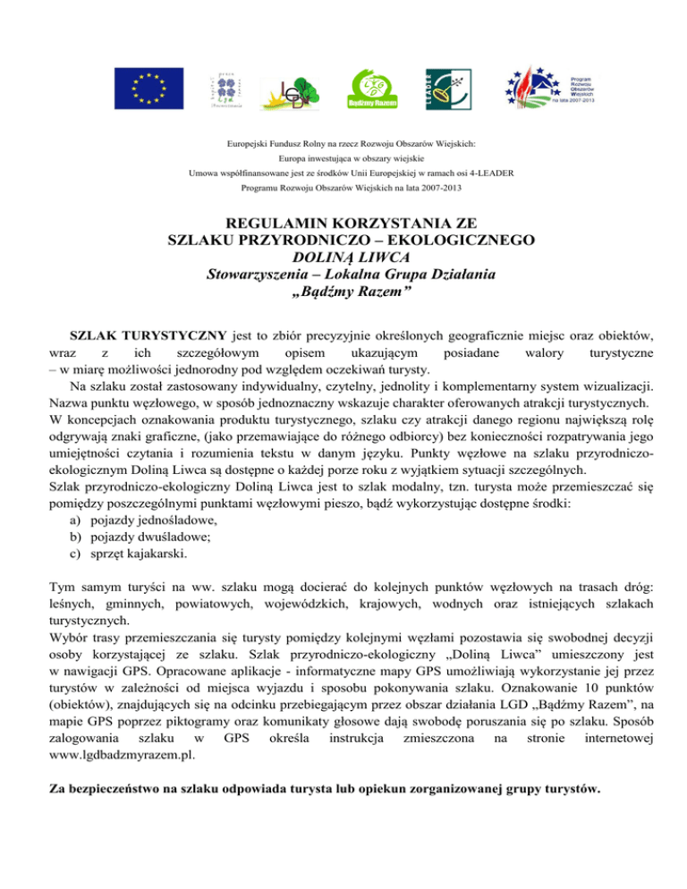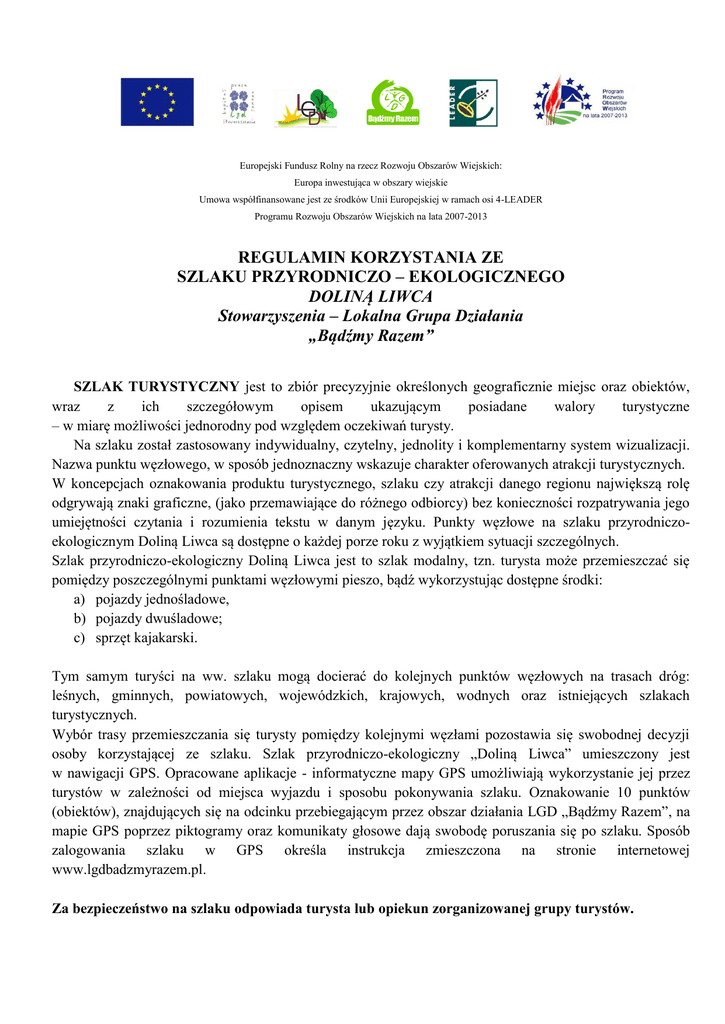 Europejski Fundusz Rolny na rzecz Rozwoju Obszarów Wiejskich: Europa inwestująca w obszary wiejskie Umowa współfinansowane jest ze środków Unii Europejskiej w ramach osi 4-LEADER Programu Rozwoju Obszarów Wiejskich na lata 2007-2013 REGULAMIN KORZYSTANIA ZE SZLAKU PRZYRODNICZO – EKOLOGICZNEGO DOLINĄ LIWCA Stowarzyszenia – Lokalna Grupa Działania „Bądźmy Razem” SZLAK TURYSTYCZNY jest to zbiór precyzyjnie określonych geograficznie miejsc oraz obiektów, wraz z ich szczegółowym opisem ukazującym posiadane walory turystyczne – w miarę możliwości jednorodny pod względem oczekiwań turysty. Na szlaku został zastosowany indywidualny, czytelny, jednolity i komplementarny system wizualizacji. Nazwa punktu węzłowego, w sposób jednoznaczny wskazuje charakter oferowanych atrakcji turystycznych. W koncepcjach oznakowania produktu turystycznego, szlaku czy atrakcji danego regionu największą rolę odgrywają znaki graficzne, (jako przemawiające do różnego odbiorcy) bez konieczności rozpatrywania jego umiejętności czytania i rozumienia tekstu w danym języku. Punkty węzłowe na szlaku przyrodniczoekologicznym Doliną Liwca są dostępne o każdej porze roku z wyjątkiem sytuacji szczególnych. Szlak przyrodniczo-ekologiczny Doliną Liwca jest to szlak modalny, tzn. turysta może przemieszczać się pomiędzy poszczególnymi punktami węzłowymi pieszo, bądź wykorzystując dostępne środki: a) pojazdy jednośladowe, b) pojazdy dwuśladowe; c) sprzęt kajakarski. Tym samym turyści na ww. szlaku mogą docierać do kolejnych punktów węzłowych na trasach dróg: leśnych, gminnych, powiatowych, wojewódzkich, krajowych, wodnych oraz istniejących szlakach turystycznych. Wybór trasy przemieszczania się turysty pomiędzy kolejnymi węzłami pozostawia się swobodnej decyzji osoby korzystającej ze szlaku. Szlak przyrodniczo-ekologiczny „Doliną Liwca” umieszczony jest w nawigacji GPS. Opracowane aplikacje - informatyczne mapy GPS umożliwiają wykorzystanie jej przez turystów w zależności od miejsca wyjazdu i sposobu pokonywania szlaku. Oznakowanie 10 punktów (obiektów), znajdujących się na odcinku przebiegającym przez obszar działania LGD „Bądźmy Razem”, na mapie GPS poprzez piktogramy oraz komunikaty głosowe dają swobodę poruszania się po szlaku. Sposób zalogowania szlaku w GPS określa instrukcja zmieszczona na stronie internetowej www.lgdbadzmyrazem.pl. Za bezpieczeństwo na szlaku odpowiada turysta lub opiekun zorganizowanej grupy turystów.