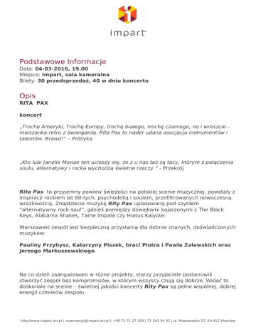 Podstawowe Informacje Data: 04-03-2016, 19.00 Miejsce: Impart, sala kameralna Bilety: 30 przedsprzedaż, 40 w dniu koncertu Opis RITA PAX koncert „Trochę Ameryki, Trochę Europy, trochę białego, trochę czarnego, no i wreszcie mieszanka retro z awangardą. Rita Pax to nader udana asocjacja instrumentów i talentów. Brawo!” – Polityka „Kto lubi Janelle Monae ten ucieszy się, że z u nas też są tacy, którym z połączenia soulu, alternatywy i rocka wychodzą świetne rzeczy.” - Przekrój Rita Pax to przyjemny powiew świeżości na polskiej scenie muzycznej, powstały z inspiracji rockiem lat 60-tych, psychodelią i soulem, przefiltrowanych nowoczesną wrażliwością. Znajdziecie muzykę Rity Pax uplasowaną pod szyldem “alternatywny rock-soul”, gdzieś pomiędzy dźwiękami kojarzonymi z The Black Keys, Alabama Shakes, Tame Impala czy Hiatus Kaiyote. Warszawski zespół jest bezpieczną przystanią dla dobrze znanych, doświadczonych muzyków: Pauliny Przybysz, Katarzyny Piszek, braci Piotra i Pawła Zalewskich oraz Jerzego Markuszewskiego. Na co dzień zaangażowani w różne projekty, starzy przyjaciele postanowili stworzyć zespół bez kompromisów, w którym wszyscy czują się dobrze. Widać to doskonale na scenie – świetnej jakości koncerty Rity Pax są pełne wspólnej, dobrej energii członków zespołu. http://www.impart.art.pl | [email protected] | +48 71 71 27 100 | 71 341 94 32 | ul. Mazowiecka 17, 50-412 Wrocław W 2013 roku został wydany znakomicie przyjęty debiutancki album zespołu, zatytułowany po prostu: „RiTa Pax”. Dwa lata później Rita Pax wraca z nową płytą, „Old Transport Wonders". Muzycznie, drugi krążek jest bardziej dojrzały i kompletny od debiutu. Tymczasem w tekstach Pauliny Przybysz realne problemy przeplatają się z retro-futurystycznym science-fiction, a poważne sprawy potraktowane są z nutką ironii. Dajcie się zabrać w tę podróż! „Urok tego krążka bierze się z jego wewnętrznych sprzeczności. Raz Rita Pax sięga do tradycji The Beatles, (…) kiedy indziej brzmi po zappowsku, jak Moloko, a za chwilę jej dźwięki kojarzą się z barokowym popem. Za każdym razem brawurowi członkowie grupy pokazują, że rewelacyjny warsztat może iść w parze z niesztampowym spojrzeniem na muzykę.” - Bartek Chaciński więcej: JAAA! // Rita Pax // Paulina Przybysz TELEDYSKI: „INDEED” (premiera 15.12.2015) „DEAD BLEEDING PRIDE” http://www.impart.art.pl | [email protected] | +48 71 71 27 100 | 71 341 94 32 | ul. Mazowiecka 17, 50-412 Wrocław Powered by TCPDF (www.tcpdf.org)