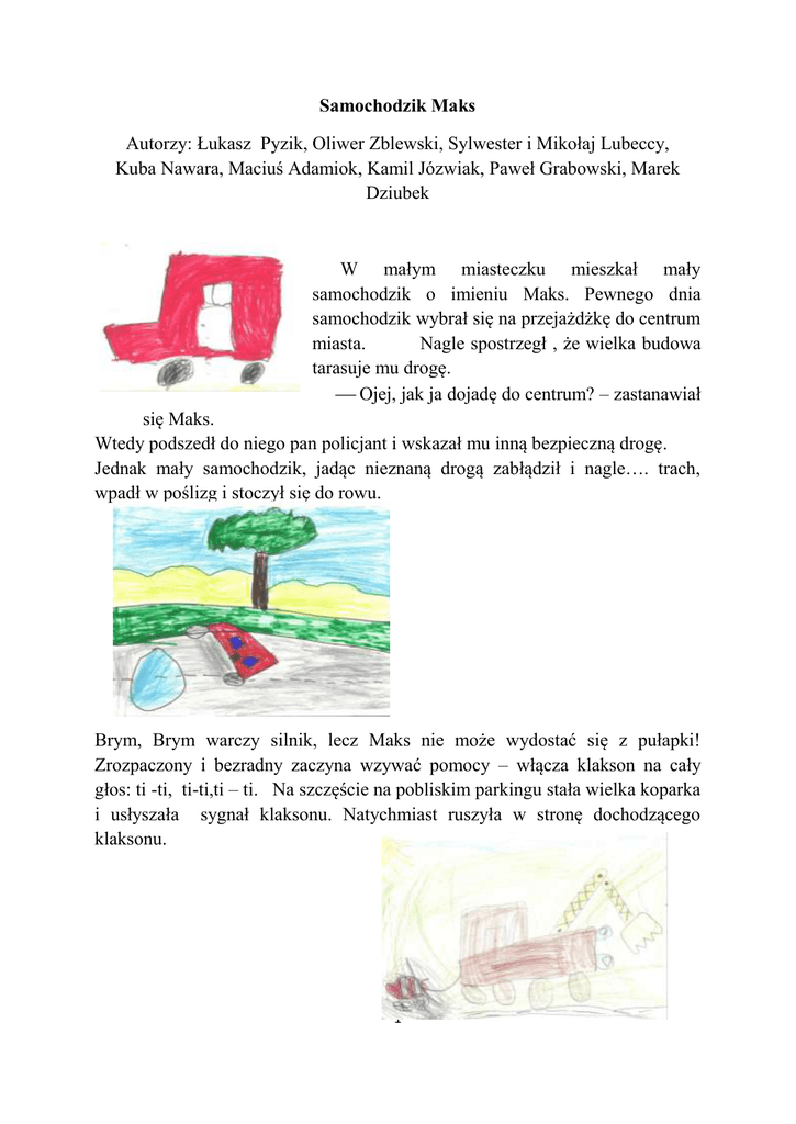 Samochodzik Maks Autorzy: Łukasz Pyzik, Oliwer Zblewski, Sylwester i Mikołaj Lubeccy, Kuba Nawara, Maciuś Adamiok, Kamil Józwiak, Paweł Grabowski, Marek Dziubek W małym miasteczku mieszkał mały samochodzik o imieniu Maks. Pewnego dnia samochodzik wybrał się na przejażdżkę do centrum miasta. Nagle spostrzegł , że wielka budowa tarasuje mu drogę. Ojej, jak ja dojadę do centrum? – zastanawiał się Maks. Wtedy podszedł do niego pan policjant i wskazał mu inną bezpieczną drogę. Jednak mały samochodzik, jadąc nieznaną drogą zabłądził i nagle…. trach, wpadł w poślizg i stoczył się do rowu. Brym, Brym warczy silnik, lecz Maks nie może wydostać się z pułapki! Zrozpaczony i bezradny zaczyna wzywać pomocy – włącza klakson na cały głos: ti -ti, ti-ti,ti – ti. Na szczęście na pobliskim parkingu stała wielka koparka i usłyszała sygnał klaksonu. Natychmiast ruszyła w stronę dochodzącego klaksonu. 1 Koparka pomogła małemu Maksowi wydostać się na drogę. Wtedy okazało się, że samochodzik ma stłuczone lusterko i lewy reflektor, a na przedniej szybie pojawiło się pęknięcie. Maksio musiał zostać przewieziony do szpitala dla samochodów. Mechanik Tomek starannie naprawił wszystkie usterki i Maks mógł bezpiecznie wrócić do domu. Samochodzik grzecznie podziękował koparce i mechanikowi Tomkowi za okazaną pomoc. Ponadto postanowił nauczyć czytać się plan miasta, by więcej nie zabłądzić. 2
