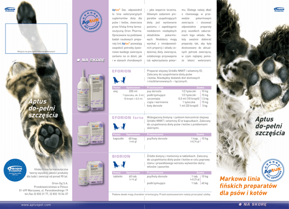 Miejsce na pieczątkę lekarza weterynarii l NA SKÓRE ´ Aptus® (łac. odpowiedni) to linia weterynaryjnych suplementów diety dla psów i kotów, stworzona przez fińską firmę farmaceutyczną Orion Pharma. Opracowane na podstawie badań naukowych preparaty linii Aptus® pozwalają zaspokoić potrzeby żywieniowe każdego zwierzęcia zarówno na co dzień, jak i w stanach chorobowych – jako wsparcie leczenia. Głównym zadaniem preparatów uzupełniających dietę jest wyrównanie poziomu i zapobieganie niedoborom niezbędnych składników pokarmowych. Niedobory mogą wynikać z nieodpowiednich proporcji i składu codziennej diety zwierzęcia, osłabionego przyswajania lub wykorzystania pokar- EFORION Preparat olejowy (źródło NNKT i witaminy E). Zalecany do u zupełniania diety psów i kotów. Niezbędny dodatek diet domowych i niezbilansowanych – łączonych. Postać Aptus do-pełni szczęścia olej Opakowanie psy dorosłe 1 łyżeczka, ok. 5 ml podtrzymująco 10 kropli = 0,5 ml szczenięta ciąża i karmienie koty dorosłe EFORION for te Postać kapsułki Opakowanie 60 kap. Orion Oyj S.A. Przedstawicielstwo w Polsce 01-699 Warszawa, ul. Parandowskiego 19 tel./fax 22 833 31 77, 22 832 10 36-37 www.aptuspet.com Postać tabletki Opakowanie 60 tab. Przeznaczenie psy/koty dorosłe 10 kg 15 kg 1,5 kg 15 kg 5 kg Dawka 1 kap. 10 kg Aptus do-pełni szczęścia (=0,74 g) Źródło biotyny i metioniny w tabletkach. Zalecany do uzupełniania diety psów i kotów w celu poprawy stanu i prawidłowego wzrostu wytworów skóry: włosów i pazurów. Przeznaczenie psy/koty dorosłe (=14 g) Dawka 1/2 łyżeczki 1/2 łyżeczki 0,5 ml (10 kropli) 1 łyżeczka 1 ml (20 kropli) Wzbogacony biotyną i cynkiem koncentrat olejowy (źródło NNKT i witaminy E) w kapsułkach. Zalecany do uzupełniania diety psów i kotów z problemami skórnymi. (=44 g) BIORION fińska firma farmaceutyczna tworzy wysokiej jakości produkty dla ludzi i zwierząt od ponad 90 lat. Przeznaczenie 200 ml mu. Dlatego należy dbać o równowagę w przewodzie pokarmowym zwierzęcia i stosować odpowiednie preparaty przy wszelkich zaburzeniach tego układu. Należy uważnie dobierać preparaty tak, aby były dostosowane do aktualnych potrzeb zwierzęcia, w czym najlepiej pomoże lekarz weterynarii. podtrzymująco Dawka 1 tab. 10 kg (=0,23 g) 1 tab. 40 kg Podane dawki mają charakter orientacyjny. Przed zastosowaniem należy przeczytać ulotkę. Markowa linia fińskich preparatów dla psów i kotów l NA SKÓRE ´ Dlaczego nienasycone kwasy są niezbędne? Niezbędne Nienasycone Kwasy Tłuszczowe (NNKT) są to substancje konieczne dla prawidłowego funkcjonowania układu odpornościowego, zdrowej skóry i pięknej sierści. Ponieważ NNKT nie są wytwarzane przez organizm psa czy kota, dlatego powinny być dodawane do codziennej diety. Zarówno niedobory jak i nadmiar czy nieprawidłowe proporcje NNKT, mogą prowadzić do zmian chorobowych. Szczególnie ważne jest to w okresie wzrostu i starzenia się zwierzęcia, bo wtedy organizm jest słabszy i bardziej narażony na skutki wszelkich niedoborów. Psom i kotom należy codziennie dostarczać kwasy z rodziny n-6 (kwas linolowy – LA) oraz n-3 (kwas linolenowy – ALA) wraz z długołańcuchowymi kwasami z rodziny n-3 (kwasem eikozapentaenowym – EPA i dokozaheksaenowym – DHA). Dwa ostatnie, występujące wyłącznie w oleju rybim, są niezbędne do prawidłowego rozwoju i funkcjonowania układu nerwowego, a także wykazują działanie przeciwnowotworowe. Ponieważ żaden naturalny pokarm nie zawiera idealnych proporcji NNKT, dlatego w uzupełnianiu diety najlepiej jest stosować mieszaniny najwyższej jakości olejów roślinnych i rybich, dodatkowo wzbogaconych składnikami takimi jak witamina E, cynk czy biotyna. Równolegle z NNKT należy zawsze podawać witaminę E, ponieważ podawanie tych kwasów prowadzi do jej Eforion olej – do codziennej suplementacji diety w NNKT Skóra zwierzęcia to pierwsza bariera dla czynników patogennych atakujących jego organizm. Dostarczanie składników wspomagających zarówno prawidłowe funkcjonowanie układu odpornościowego, jak i skóry jest możliwe dzięki codziennej suplementacji. Połączenie olejów rzepakowego, z wiesiołka, z olejem rybim wzbogacone witaminą E daje optymalne proporcje i skład NNKT dla psa i kota. Obecność kwasów EPA i DHA z rodziny n-3 (pochodzących z oleju rybiego) wspomaga produkcję cytokin przeciwzapalnych w organizmie zwierzęcia i dzięki temu wzmacnia jego odporność. Z kolei obecność kwasów z rodziny n-6, gwarantuje piękny wygląd okrywy włosowej i łagodzi problemy skórne. Uważa się, że w codziennej suplementacji stosunek kwasów n-6 do n-3 powinien być jak najbliższy. Dlatego preparat do codziennej suplementacji NNKT EFORION olej ma optymalny skład NNKT z rodziny n-6: n-3 czyli 2,5:1. Preparat zawiera też dodatkowo w składzie witaminę E, którą należy podawać równocześnie z NNKT, aby uniknąć jej niedoborów. Już po 3 tygodniach kuracji wzmacnia się mechanizmy przeciwzapalny i stabilizuje stan skóry oraz sierści, a po trzech miesiącach widocznie poprawia się funkcjonowanie całego organizmu zwierzęcia. Aby utrzymać ten stan, należy uzupełniać NNKT w odpowiednich proporcjach codziennie, przez całe życie zwierzęcia. niedoborów. Zarówno u psów jak i u kotów powinno się stosować NNKT z rodziny n-6 i n-3 w zbliżonych proporcjach. Większy udział kwasów NNKT z rodziny n-6 podaje się, aby wesprzeć funkcje Eforion forte – do suplementacji NNKT w problemach skórnych i przy matowej sierści skóry oraz odżywienie i intensywny wzrost włosów. Codzienne podawanie NNKT pozwala zapobiegać ich niedoborom, dzięki czemu wzmacniany jest układ odpornościowy, promowany rozwój i funkcje układu nerwowego oraz normalizowane funkcje skóry i polepszana jakość okrywy włosowej. Jednym z najbardziej korzystnych (w swoim naturalnym składzie) pod kątem piękn