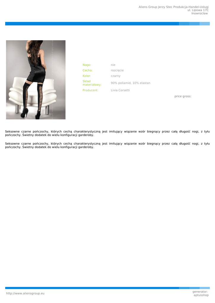 Aliens Group Jerzy Stec Produkcja-Handel-Usługi ul. Lipowa 17C Inowrocław Nago: nie Cecha: rozcięcie Kolor: czarny Skład materiałowy: 90% poliamid, 10% elastan Producent: Livia Corsetti price gross: Seksowne czarne pończochy, których cechą charakterystyczną jest imitujący wiązanie wzór biegnący przez całą długość nogi, z tyłu pończochy. Świetny dodatek do wielu konfiguracji garderoby. Seksowne czarne pończochy, których cechą charakterystyczną jest imitujący wiązanie wzór biegnący przez całą długość nogi, z tyłu pończochy. Świetny dodatek do wielu konfiguracji garderoby. http://www.aliensgroup.eu generator: aptusshop