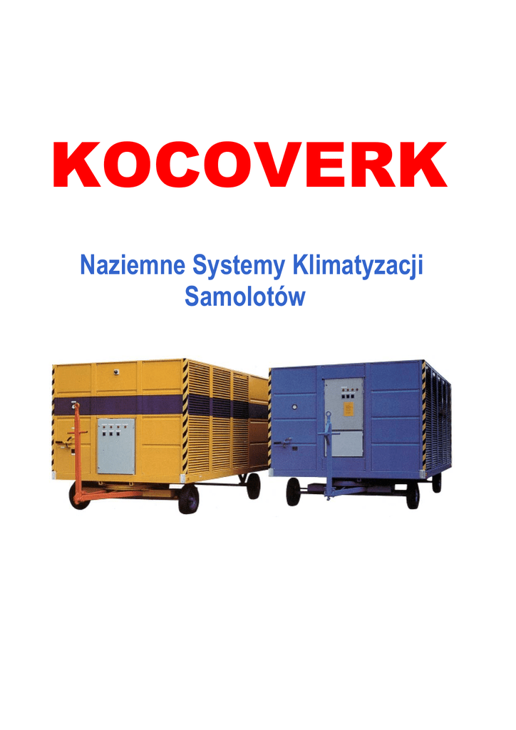 KOCOVERK Naziemne Systemy Klimatyzacji Samolotów KOCOVERK Naziemne Systemy Klimatyzacji Samolotów KOCOVERK system klimatyzacji samolotowej najbardziej ekonomiczne rozwiązanie na rynku Linia samolotowych klimatyzatorów KOCOVERK ACC została zaprojektowana z myślą o zapewnieniu pełnego komfortu podróży pasażerom wszystkich typów samolotów z napędem tłokowym jak i odrzutowym. Urządzenia te spełniają wszelkie wymagania eksploatacyjne niezależnie do wielkości floty czy lokalnych warunków klimatycznych. Zalety Medium zasilającym jest energia elektryczna, gdyż jest to uzasadnione względami wygody obsługi i obniżki kosztów. Koszty eksploatacyjne klimatyzatorów ACC są o wiele niższe w porównaniu z urządzeniami zasilanych silnikami Diesla lub stosowaniem APU (Auxiliary Power Unit) do celów klimatyzacji. Ważnym jest również, że urządzenia ACC ochładzając wnętrze samolotu nie zanieczyszczają środowiska spalinami. Następna z cennych zalet to niski poziom hałasu, gdyż rozmieszczenie dmuchaw i wentylatorów wewnątrz urządzenia zaprojektowano mając na uwagę zmniejszenie emisji hałasu i wibracji do minimum. Cechę tą docenia najlepiej personel obsługi naziemnej, a szczególnie wtedy, gdy urządzenia te pracują wewnątrz hangarów serwisowych. Urządzenia wykorzystują system chłodzenia typu “powietrze-powietrze”, co wyklucza możliwość pożaru. Ekonomika Podwójny system chłodzenia powietrza pozwala na pełne lub częściowe wykorzystanie możliwości urządzenia, zależnie od aktualnej potrzeby. Pozwala to na zminimalizowanie kosztów operacyjnych i serwisowych. Korzystanie z miejskiej energii elektrycznej pozwala na dalszą obniżkę kosztów w porównaniu do urządzeń opartych na silnikach Diesla. Urządzenia ACC zapewniają efektywną, ekonomiczną i bezawaryjną pracę w czasie najgorętszych dni lata. Obsługa_techniczna Klimatyzatory KOCOVERK ACC wykorzystują tylko energię elektryczną. Wentylator kondensatora, sprężarka i parownik z dmuchawą są napędzane silnikami elektrycznymi. W urządzeniu nie zastosowano mechanicznego systemu przeniesienia napędu z przekładniami i sprzęgłami wymagającymi serwisowania. Ilość podzespołów wymagających obsługi została zredukowana do minimum. Wszystkie bezpieczniki, silniki elektryczne, sprężarki i obwody elektryczne są łatwo dostępne poprzez odsuwane drzwiczki serwisowe. Koszty eksploatacyjne klimatyzatorów ACC wprost, jak i pośrednio koszty używana APU (Auxiliary Power Unit) zostały zredukowane do niezbędnego minimum. KOCOVERK Naziemne Systemy Klimatyzacji Samolotów KOCOVERK system klimatyzacji samolotowej do wykorzystania w hangarach podczas prac serwisowych Użytkowanie Jednym z najważniejszych wymogów w obsługi naziemnej samolotów jest niezawodność urządzeń, co ma zmniejszyć potrzebę wykonywania kosztownych napraw do niezbędnego minimum. Klimatyzatory ACC mogą być obsługiwane przez niewykwalifikowany personel, ponieważ dwustupniowa procedura włączania urządzenia jest niezwykle prosta. Cała obsługa przebiega automatycznie od uruchomienia, aż do wyłączenia klimatyzatora. Modele ACC mogą być szybko przemieszczane do samolotu do samolotu. Z chwilą zadziałania wyłącznika powietrze samoczynnie przestaje być tłoczone do kanałów wentylacyjnych samolotu. Po odłączeniu rękawa klimatyzator może być natychmiast przemieszczony do innego samolotu. Przyjazność_dla_środowiska Klimatyzatory KOCOVERK ACC zostały specjalnie zaprojektowane z myślą o bezpiecznej ich pracy wewnątrz budynków. Modele ACC EL (elektryczne) nie posiadając silnika spalinowego nie powodują hałasu, wycieków oleju czy paliwa i nie emitują spalin. Wydmuchiwane przez wentylator powietrze z kondensatora poprowadzono wraz z towarzyszącym temu hałasem pionowo do góry chroniąc przed nim personel naziemny. Wloty powietrza do urządzenia są specjalnie izolowane i zaopatrzone w maty wytłumiające. Dzięki tym cechom klimatyzatory KOCOVERK ACC nadają się idealne do użytkowania wewnątrz hangarów. Bezpieczeństwo Modele ACC zostały wyposażone w systemy zabezpieczeń, osłony i wzmocnione drzwiczki chroniące personel przed ewentualnymi zagrożeniami jak i chroniące samo urządzenie przed uszkodzeniami z zewnątrz. Dostęp do drzwi serwisowych może mieć tylko uprawniony personel dla wykonania inspekcji technicznej, czyszczenia, regulacji, napraw czy wymiany podzespołów. Opcje Klimatyzatory KOCOVERK ACC mogą być wyposażone opcjonalnie w: dowolny spalinowy agregat prądotwórczy na wypadek, gdy nie jest dostępna energia elektryczna z sieci, elektryczny podgrzewacz powietrza, rozgałęźnik “Y” przeznaczony do obsługi samolotów szerokokadłubowych, stacjonarne posadowienie na ramie, specjalny „kolorowy” schemat urządzenia itp.. Opis urządzenia ∗ Dwuobwodowy parownik zapewniający lepszą kontrolę nad temperaturą tłoczonego powietrza ∗ Wlot powietrza specjalnie wytłumiony matami dźwiękochłonnymi ∗ Dwa kondensatory z systemem powolnego przepływu powietrza dla dalszego wyciszenia pracy urządzenia. ∗ Podwójny kompresor ślimakowy Copeland dla obniżenia kosztów operacyjnych i podniesienia niezawodności ∗ Łatwo dostępne podzespoły wraz ze wskaźnikami i kontrolkami ∗ Prosta w obsłudze tablica sterowania całego klimatyzatora. ∗ Zgodne z wymogami bezpieczeństwa lampy ostrzegawcze, odblaski i reflektory ∗ Możliwość zamontowania klimatyzatora na podwoziu ciężarówki, ramie samonośnej lub na innym podwoziu. ∗ W zależności od potrzeb możliwość przełączania wydajności urządzenia w trzech trybach 100%, 66% i 33% ∗ Sterowanie ciśnieniem tłoczonego powietrza przez przełącznik na tablicy kontrolnej KOCOVERK Naziemne Systemy Klimatyzacji Samolotów PODSTAWOWE DANE TECHNICZNE PODSTAWOWE DANE: Przepływ powietrza Temperatura powietrza Ciśnienie powietrza Producent kompresora Czynnik chłodzący Możliwości ch