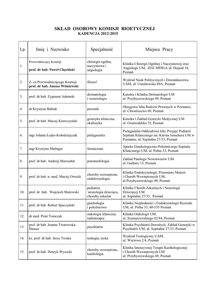 SKŁAD OSOBOWY KOMISJI BIOETYCZNEJ KADENCJA 2012-2015 Lp. Imię i Nazwisko Przewodniczący Komisji 1. prof. dr hab. Paweł Chęciński Specjalność chirurgia ogólna, naczyniowa i angiologia Miejsce Pracy Klinika Chirurgii Ogólnej i Naczyniowej oraz Angiologii UM, ZOZ MSWiA ul. Dojazd 34, Poznań 2. Z- ca Przewodniczącego Komisji prof. dr hab. Janusz Wiśniewski filozof Wydział Nauk Politycznych i Dziennikarstwa UAM, ul. Umultowska 89A, Poznań 3. prof. dr hab. Zygmunt Adamski dermatologia i wenerologia Katedra i Klinika Dermatologii UM ul. Przybyszewskiego 49, Poznań 4. dr Krystyna Babiak prawnik Okręgowa Izba Radców Prawnych w Poznaniu, ul. Chwaliszewo 69, Poznań 5. prof. dr hab. Maciej Krawczyński genetyka kliniczna, okulistyka Katedra i Zakład Genetyki Medycznej UM ul. Grunwaldzka 55, Poznań 6. mgr Jolanta Łojko-Kołodziejczak pielęgniarka Pielęgniarka Oddziałowa Izby Przyjęć Pediatrii Szpitala Klinicznego im. Karola Jonschera UM w Poznaniu, ul. Szpitalna 27/33, Poznań 7. mgr Krystyna Malinger farmaceuta Apteka Ginekologiczno-Położniczego Szpitala Klinicznego UM, ul. Polna 33, Poznań 8. prof. dr hab. Andrzej Marszałek patomorfologia Zakład Patologii Nowotworów UM ul. Garbary 15, Poznań 9. prof. dr hab. n. med. Maciej Owecki choroby wewnętrzne, endokrynologia Klinika Endokrynologii, Przemiany Materii i Chorób Wewnętrznych UM, ul.Przybyszewskiego 49, Poznań 10. prof. dr hab. Wojciech Służewski pediatria, neurologia dziecięca, choroby zakaźne Klinika Chorób Zakaźnych i Neurologii Dziecięcej UM ul. Szpitalna 27/33, Poznań 11. prof. dr hab. Robert Spaczyński ginekologia i położnictwo Klinika Niepłodności i Endokrynologii Rozrodu UM, ul. Polna 33, 60-535 Poznań 12. dr med. Piotr Tomczak onkologia kliniczna, radioterapia Klinika Onkologii UM, ul. Szamarzewskiego 82/84, Poznań 13. prof. dr hab. Joanna TwarowskaHauser psychiatria Klinika Psychiatrii Dorosłych, Zakład Genetyki w Psychiatrii UM, ul. Szpitalna 27/33, Poznań 14. ks. prof. dr hab. Jerzy Troska teologia, etyka Wydział Teologiczny UAM, ul. Wieżowa 2/4, Poznań 15. prof. dr hab. Henryk Wysocki choroby wewnętrzne, kardiologia Klinika Intensywnej Terapii Kardiologicznej i Chorób Wewnętrznych UM ul. Przybyszewskiego 49, Poznań