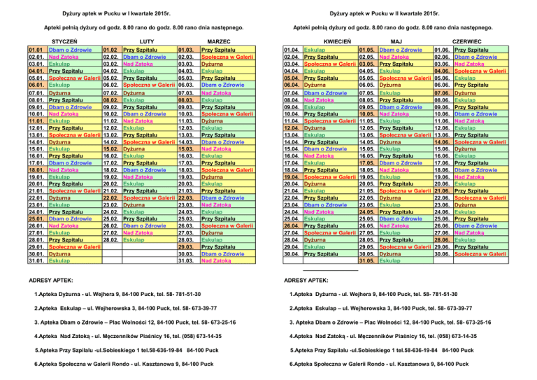 Dyżury aptek w Pucku w I kwartale 2015r. Dyżury aptek w Pucku w II kwartale 2015r. Apteki pełnią dyżury od godz. 8.00 rano do godz. 8.00 rano dnia następnego. STYCZEŃ 01.01 02.01. 03.01. 04.01. 05.01. 06.01. 07.01. 08.01. 09.01. 10.01. 11.01. 12.01. 13.01. 14.01. 15.01. 16.01. 17.01. 18.01. 19.01. 20.01. 21.01. 22.01. 23.01. 24.01. 25.01. 26.01. 27.01. 28.01. 29.01. 30.01. 31.01. Dbam o Zdrowie Nad Zatoką Eskulap Przy Szpitalu Społeczna w Galerii Rondo Eskulap Dyżurna Przy Szpitalu Dbam o Zdrowie Nad Zatoką Eskulap Przy Szpitalu Społeczna w Galerii Rondo Dyżurna Eskulap Przy Szpitalu Dbam o Zdrowie Nad Zatoką Eskulap Przy Szpitalu Społeczna w Galerii Rondo Dyżurna Eskulap Przy Szpitalu Dbam o Zdrowie Nad Zatoką Eskulap Przy Szpitalu Społeczna w Galerii Rondo Dyżurna Eskulap LUTY 01.02 02.02. 03.02. 04.02. 05.02. 06.02. 07.02. 08.02. 09.02. 10.02. 11.02. 12.02. 13.02. 14.02. 15.02. 16.02. 17.02. 18.02. 19.02. 20.02. 21.02. 22.02. 23.02. 24.02. 25.02. 26.02. 27.02. 28.02. Przy Szpitalu Dbam o Zdrowie Nad Zatoką Eskulap Przy Szpitalu Społeczna w Galerii Rondo Dyżurna Eskulap Przy Szpitalu Dbam o Zdrowie Nad Zatoką Eskulap Przy Szpitalu Społeczna w Galerii Rondo Dyżurna Eskulap Przy Szpitalu Dbam o Zdrowie Nad Zatoką Eskulap Przy Szpitalu Społeczna w Galerii Rondo Dyżurna Eskulap Przy Szpitalu Dbam o Zdrowie Nad Zatoką Eskulap Apteki pełnią dyżury od godz. 8.00 rano do godz. 8.00 rano dnia następnego. MARZEC 01.03. 02.03. 03.03. 04.03. 05.03. 06.03. 07.03. 08.03. 09.03. 10.03. 11.03. 12.03. 13.03. 14.03. 15.03. 16.03. 17.03. 18.03. 19.03. 20.03. 21.03. 22.03. 23.03. 24.03. 25.03. 26.03. 27.03. 28.03. 29.03. 30.03. 31.03. Przy Szpitalu Społeczna w Galerii Rondo Dyżurna Eskulap Przy Szpitalu Dbam o Zdrowie Nad Zatoką Eskulap Przy Szpitalu Społeczna w Galerii Rondo Dyżurna Eskulap Przy Szpitalu Dbam o Zdrowie Nad Zatoką Eskulap Przy Szpitalu Społeczna w Galerii Rondo Dyżurna Eskulap Przy Szpitalu Dbam o Zdrowie Nad Zatoką Eskulap Przy Szpitalu Społeczna w Galerii Rondo Dyżurna Eskulap Przy Szpitalu Dbam o Zdrowie Nad Zatoką ADRESY APTEK: KWIECIEŃ 01.04. 02.04. 03.04. 04.04. 05.04. 06.04. 07.04. 08.04. 09.04. 10.04. 11.04. 12.04. 13.04. 14.04. 15.04. 16.04. 17.04. 18.04. 19.04. 20.04. 21.04. 22.04. 23.04. 24.04. 25.04. 26.04. 27.04. 28.04. 29.04. 30.04. Eskulap Przy Szpitalu Społeczna w Galerii Rondo Eskulap Przy Szpitalu Dyżurna Dbam o Zdrowie Nad Zatoką Eskulap Przy Szpitalu Społeczna w Galerii Rondo Dyżurna Eskulap Przy Szpitalu Dbam o Zdrowie Nad Zatoką Eskulap Przy Szpitalu Społeczna w Galerii Rondo Dyżurna Eskulap Przy Szpitalu Dbam o Zdrowie Nad Zatoką Eskulap Przy Szpitalu Społeczna w Galerii Rondo Dyżurna Eskulap Przy Szpitalu MAJ 01.05. 02.05. 03.05. 04.05. 05.05. 06.05. 07.05. 08.05. 09.05. 10.05. 11.05. 12.05. 13.05. 14.05. 15.05. 16.05. 17.05. 18.05. 19.05. 20.05. 21.05. 22.05. 23.05. 24.05. 25.05. 26.05. 27.05. 28.05. 29.05. 30.05. 31.05. Dbam o Zdrowie Nad Zatoką Przy Szpitalu Eskulap Społeczna w Galerii Rondo Dyżurna Eskulap Przy Szpitalu Dbam o Zdrowie Nad Zatoką Eskulap Przy Szpitalu Społeczna w Galerii Rondo Dyżurna Eskulap Przy Szpitalu Dbam o Zdrowie Nad Zatoką Eskulap Przy Szpitalu Społeczna w Galerii Rondo Dyżurna Eskulap Przy Szpitalu Dbam o Zdrowie Nad Zatoką Eskulap Przy Szpitalu Społeczna w Galerii Rondo Dyżurna Eskulap CZERWIEC 01.06. 02.06. 03.06. 04.06. 05.06. 06.06. 07.06. 08.06. 09.06. 10.06. 11.06. 12.06. 13.06. 14.06. 15.06. 16.06. 17.06. 18.06. 19.06. 20.06. 21.06. 22.06. 23.06. 24.06. 25.06. 26.06. 27.06. 28.06. 29.06. 30.06. Przy Szpitalu Dbam o Zdrowie Nad Zatoką Społeczna w Galerii Rondo Eskulap Przy Szpitalu Dyżurna Eskulap Przy Szpitalu Dbam o Zdrowie Nad Zatoką Eskulap Przy Szpitalu Społeczna w Galerii Rondo Dyżurna Eskulap Przy Szpitalu Dbam o Zdrowie Nad Zatoką Eskulap Przy Szpitalu Społeczna w Galerii Rondo Dyżurna Eskulap Przy Szpitalu Dbam o Zdrowie Nad Zatoką Eskulap Przy Szpitalu Społeczna w Galerii Rondo ADRESY APTEK: 1.Apteka Dyżurna - ul. Wejhera 9, 84-100 Puck, tel. 58- 781-51-30 1.Apteka Dyżurna - ul. Wejhera 9, 84-100 Puck, tel. 58- 781-51-30 2.Apteka Eskulap – ul. Wejherowska 3, 84-100 Puck, tel. 58- 673-39-77 2.Apteka Eskulap – ul. Wejherowska 3, 84-100 Puck, tel. 58- 673-39-77 3. Apteka Dbam o Zdrowie – Plac Wolności 12, 84-100 Puck, tel. 58- 673-25-16 3. Apteka Dbam o Zdrowie – Plac Wolności 12, 84-100 Puck, tel. 58- 673-25-16 4.Apteka Nad Zatoką - ul. Męczenników Piaśnicy 16, tel. (058) 673-14-35 4.Apteka Nad Zatoką - ul. Męczenników Piaśnicy 16, tel. (058) 673-14-35 5.Apteka Przy Szpilalu -ul.Sobieskiego 1 tel.58-636-19-84 84-100 Puck 5.Apteka Przy Szpilalu -ul.Sobieskiego 1 tel.58-636-19-84 84-100 Puck 6.Apteka Społeczna w Galerii Rondo - ul. Kasztanowa 9, 84-100 Puck 6.Apteka Społeczna w Galerii Rondo - ul. Kasztanowa 9, 84-100 Puck Dyżury aptek w Pucku w III kwartale 2015 r. Dyżury aptek w Pucku w IV kwartale 2015 r. Apteki pełnią dyżury od godz. 8.00 rano do godz. 8.00 rano dnia następnego. Apteki pełnią dyżury od godz. 8.00 rano do godz. 8.00 rano dnia następnego. LIPIEC 01.07. 02.07. 03.07. 04.07. 05.07. 06.07. 07.07. 08.07. 09.07. 10.07. 11.07. 12.07. 13.07. 14.07. 15.07. 16.07. 17.07. 18.07. 19.07. 20.07. 21.07. 22.07. 23.07. 24.07. 25.07. 26.07. 27.07. 28.07. 29.07. 30.07. 31.08 Dyżurna Eskulap Przy Szpitalu Dbam o Zdrowie Nad Zatoką Eskulap Przy Szpitalu Społeczna w Galerii Rondo Dyżurna Eskulap Przy Szpitalu Dbam o Zdrowie Nad Zatoką Eskulap Przy Szpitalu Społeczna w Galerii Rondo Dyżurna Eskulap Przy Szpitalu Dbam o Zdrowie Nad Zatoką Eskulap Przy Szpitalu Społeczna w Galerii Rondo Dyżurna Eskulap Przy Szpitalu Dbam o Zdrowie Nad Zatoką Eskulap Przy Szpitalu SIERPIEŃ 01.08. 02.08. 03.08. 04.08. 05.08. 06.08. 07.08. 08.08. 09.08. 10.08. 11.08. 12.08. 13.08. 14.08. 15.08. 16.08. 17.08. 18.08. 19.08. 20.08. 21.08. 22.08. 23.08. 24.08. 25.08. 26.08. 27.08. 28.08. 29.08. 30.08. 31.08. Społeczna w Galerii R