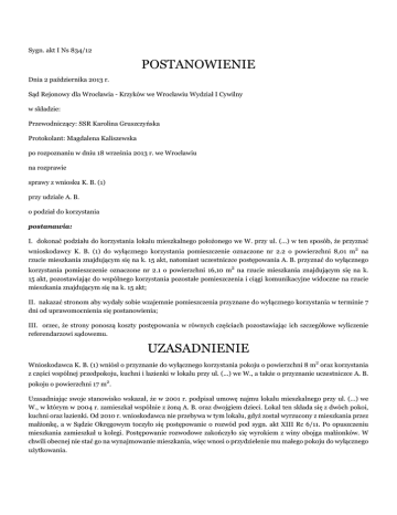 Sygn. akt I Ns 834/12 POSTANOWIENIE Dnia 2 października 2013 r. Sąd Rejonowy dla Wrocławia - Krzyków we Wrocławiu Wydział I Cywilny w składzie: Przewodniczący: SSR Karolina Gruszczyńska Protokolant: Magdalena Kaliszewska po rozpoznaniu w dniu 18 września 2013 r. we Wrocławiu na rozprawie sprawy z wniosku K. B. (1) przy udziale A. B. o podział do korzystania postanawia: I. dokonać podziału do korzystania lokalu mieszkalnego położonego we W. przy ul. (...) w ten sposób, że przyznać wnioskodawcy K. B. (1) do wyłącznego korzystania pomieszczenie oznaczone nr 2.2 o powierzchni 8,01 m2 na rzucie mieszkania znajdującym się na k. 15 akt, natomiast uczestniczce postępowania A. B. przyznać do wyłącznego korzystania pomieszczenie oznaczone nr 2.1 o powierzchni 16,10 m2 na rzucie mieszkania znajdującym się na k. 15 akt, pozostawiając do wspólnego korzystania pozostałe pomieszczenia i ciągi komunikacyjne widoczne na rzucie mieszkania znajdującym się na k. 15 akt; II. nakazać stronom aby wydały sobie wzajemnie pomieszczenia przyznane do wyłącznego korzystania w terminie 7 dni od uprawomocnienia się postanowienia; III. orzec, że strony ponoszą koszty postępowania w równych częściach pozostawiając ich szczegółowe wyliczenie referendarzowi sądowemu. UZASADNIENIE Wnioskodawca K. B. (1) wniósł o przyznanie do wyłącznego korzystania pokoju o powierzchni 8 m2 oraz korzystania z części wspólnej przedpokoju, kuchni i łazienki w lokalu przy ul. (...) we W., a także o przyznanie uczestniczce A. B. pokoju o powierzchni 17 m2. Uzasadniając swoje stanowisko wskazał, że w 2001 r. podpisał umowę najmu lokalu mieszkalnego przy ul. (...) we W., w którym w 2004 r. zamieszkał wspólnie z żoną A. B. oraz dwojgiem dzieci. Lokal ten składa się z dwóch pokoi, kuchni oraz łazienki. Od 2010 r. wnioskodawca nie przebywa w tym lokalu, gdyż został wyrzucony z mieszkania przez małżonkę, a w Sądzie Okręgowym toczyło się postępowanie o rozwód pod sygn. akt XIII Rc 6/11. Po opuszczeniu mieszkania zamieszkał u kolegi. Postępowanie rozwodowe zakończyło się wyrokiem z winy obojga małżonków. W chwili obecnej nie stać go na wynajmowanie mieszkania, więc wnosi o przydzielenie mu małego pokoju do wyłącznego użytkowania. W odpowiedzi na wniosek uczestniczka postępowania A. B. podniosła, że nie wyraża zgody na zaproponowany przez wnioskodawcę sposób korzystania z mieszkania przy ul. (...) we W.. Jest to mieszkanie spółdzielczo-lokatorskie o powierzchni 44,07 m2, nabyte w ramach współwłasności małżeńskiej. Mieszkanie składa się z dwóch pokoi (8,01 m2 i 16,10 m2), przedpokoju (6,35 m2), kuchni (9,55 m2) oraz łazienki (4 m2). Jest ono małe, pokoje są nieustawne, niepodzielne i sposób korzystania jest nie do przyjęcia. Wnioskodawca podkreślał to podczas orzekania separacji czy rozwodu i nie chciał orzekać o sposobie korzystania. Nieprawdą jest, że został on wyrzucony z mieszkania, gdyż opuścił je dobrowolnie. Strony od 13 lipca 2010 r. były w separacji, a w dniu 6 listopada 2012 r. Sąd Apelacyjny zmienił wyrok Sądu Okręgowego z dnia 9 sierpnia 2012 r., orzekając rozwód wyłącznie z winy wnioskodawcy. Ze względu na fakt, iż wnioskodawca stosuje przemoc wobec rodziny, toczy się postępowanie karne o przestępstwo znęcania się fizycznego i psychicznego nad rodziną. Nadto, wnioskodawca nie mieszka u kolegi, lecz u konkubiny we W. przy ul. (...). Może on również zamieszkiwać z matką w L., która dysponuje odpowiednimi warunkami bytowymi i mieszkaniowymi. Podczas wspólnego zamieszkiwania wnioskodawca utrudniał życie członkom rodziny i wprowadzał nerwową atmosferę. Wszczynał awantury, obrażał gości i zabraniał matce uczestniczki wejścia do domu. Miało to negatywny wpływ na samopoczucie i stan zdrowia członków rodziny. Córka stron jest pod stałą opieką lekarza psychologa i psychiatry ze względu na leczone tiki nerwowe. Uczestniczka również z takiej pomocy korzysta. Ma stwierdzoną nerwicę depresyjną i leczy się na tężyczkę. Wspólne zamieszkiwanie stron źle się odbije na psychice i stanie zdrowia członków rodziny. W piśmie procesowym z dnia 11 lipca 2013 r. wnioskodawca stwierdził, że w 2001 r. złożył do Spółdzielni Mieszkaniowej (...) we W. podanie o przydział przedmiotowego lokalu mieszkalnego, który został mu przydzielony. Warunkiem przydziału było stałe zatrudnienie, które spełniał tylko wnioskodawca, oraz wpłata wkładu mieszkaniowego w wysokości 30 % wartości mieszkania, które to uiścił wnioskodawca z odrębnego majątku, oraz darowizn od rodziców. Córka wnioskodawcy jest z nim zżyta. Nieprawdą jest, że wnioskodawca nie wnosił o sposób korzystania z mieszkania, gdyż w sprawie rozwodowej pełnomocnik wnioskodawcy wnosił w pozwie o ustalenie sposobu korzystania z mieszkania. Uczestniczka wszelkimi sposobami pragnie zagarnąć wspólny majątek stron i pozbyć się wnioskodawcy z mieszkania. Wnioskodawca nie mieszka u koleżanki i nie może mieszkać u matki. W dalszym toku postępowania strony pozostały przy swoich stanowiskach. Sąd ustalił następujący stan faktyczny: Wnioskodawca K. B. (1) oraz uczestniczka A. B. zawarli związek małżeński w dniu 16 września 2000 r. we W.. - bezsporne W dniu 9 czerwca 2004 r. na podstawie umowy ze Spółdzielnią Mieszkaniową (...) we W. wnioskodawca nabył spółdzielcze prawo do lokalu mieszkalnego przy ul. (...) we W.. Mieszkanie to składa się z dwóch pokoi o powierzchni 16,10 m2 i 8,01 m2, przedpokoju o powierzchni 6,35 m2, kuchni o powierzchni 9,55 m2 oraz łazienki o powierzchni 4 m2. Dowód: - umowa nr (...) z dnia 9 czerwca 2004 r. - kserokopia rzutu mieszkania, k. 15 W mieszkaniu tym wraz z wnioskodawcą zamieszkała uczestniczka, ich małoletnia córka O. B., a także małoletni syn uczestniczki K. B. (2). Od 2007 r. relacje pomiędzy wnioskodawcą a uczestniczką uległy pogorszeni
