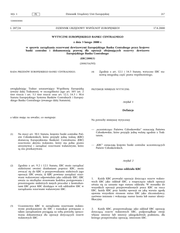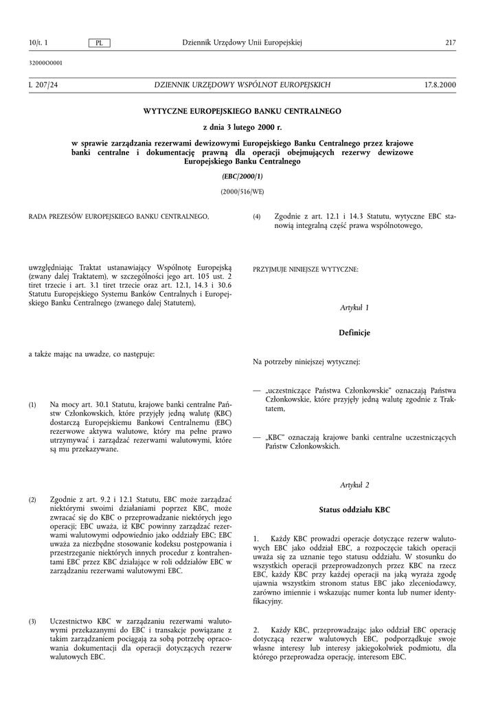 10/t. 1 Dziennik Urzędowy Unii Europejskiej PL 217 32000O0001 L 207/24 17.8.2000 DZIENNIK URZĘDOWY WSPÓLNOT EUROPEJSKICH WYTYCZNE EUROPEJSKIEGO BANKU CENTRALNEGO z dnia 3 lutego 2000 r. w sprawie zarządzania rezerwami dewizowymi Europejskiego Banku Centralnego przez krajowe banki centralne i dokumentację prawną dla operacji obejmujących rezerwy dewizowe Europejskiego Banku Centralnego (EBC/2000/1) (2000/516/WE) Zgodnie z art. 12.1 i 14.3 Statutu, wytyczne EBC stanowią integralną część prawa wspólnotowego, RADA PREZESÓW EUROPEJSKIEGO BANKU CENTRALNEGO, (4) uwzględniając Traktat ustanawiający Wspólnotę Europejską (zwany dalej Traktatem), w szczególności jego art. 105 ust. 2 tiret trzecie i art. 3.1 tiret trzecie oraz art. 12.1, 14.3 i 30.6 Statutu Europejskiego Systemu Banków Centralnych i Europejskiego Banku Centralnego (zwanego dalej Statutem), PRZYJMUJE NINIEJSZE WYTYCZNE: Artykul 1 Definicje a także mając na uwadze, co następuje: (1) Na mocy art. 30.1 Statutu, krajowe banki centralne Państw Czlonkowskich, które przyjęly jedną walutę (KBC) dostarczą Europejskiemu Bankowi Centralnemu (EBC) rezerwowe aktywa walutowe, który ma pelne prawo utrzymywać i zarządzać rezerwami walutowymi, które są mu przekazywane. Na potrzeby niniejszej wytycznej: — „uczestniczące Państwa Czlonkowskie” oznaczają Państwa Czlonkowskie, które przyjęly jedną walutę zgodnie z Traktatem, — „KBC” oznaczają krajowe banki centralne uczestniczących Państw Czlonkowskich. Artykul 2 (2) (3) Zgodnie z art. 9.2 i 12.1 Statutu, EBC może zarządzać niektórymi swoimi dzialaniami poprzez KBC, może zwracać się do KBC o przeprowadzanie niektórych jego operacji; EBC uważa, iż KBC powinny zarządzać rezerwami walutowymi odpowiednio jako oddzialy EBC; EBC uważa za niezbędne stosowanie kodeksu postępowania i przestrzeganie niektórych innych procedur z kontrahentami EBC przez KBC dzialające w roli oddzialów EBC w zarządzaniu rezerwami walutowymi EBC. Uczestnictwo KBC w zarządzaniu rezerwami walutowymi przekazanymi do EBC i transakcje powiązane z takim zarządzaniem pociągają za sobą potrzebę opracowania dokumentacji dla operacji dotyczących rezerw walutowych EBC. Status oddzialu KBC 1. Każdy KBC prowadzi operacje dotyczące rezerw walutowych EBC jako oddzial EBC, a rozpoczęcie takich operacji uważa się za uznanie tego statusu oddzialu. W stosunku do wszystkich operacji przeprowadzonych przez KBC na rzecz EBC, każdy KBC przy każdej operacji na jaką wyraża zgodę ujawnia wszystkim stronom status EBC jako zleceniodawcy, zarówno imiennie i wskazując numer konta lub numer identyfikacyjny. 2. Każdy KBC, przeprowadzając jako oddzial EBC operację dotyczącą rezerw walutowych EBC, podporządkuje swoje wlasne interesy lub interesy jakiegokolwiek podmiotu, dla którego przeprowadza operację, interesom EBC. 218 Dziennik Urzędowy Unii Europejskiej PL 3. Każdy KBC, poproszony przez kontrahenta EBC o dowód upoważnienia KBC do przeprowadzenia operacji dotyczących rezerw walutowych EBC jako oddzialu EBC, dostarczy tym kontrahentom dowód obowiązujących specyfikacji oddzialu. Artykul 3 Dokumentacja prawna 1. Wszystkie operacje dotyczące rezerw walutowych EBC są przeprowadzane z wykorzystaniem dokumentacji prawnej jakiej wymaga niniejszy artykul. 2. Dokument w formie dolączonej jako zalącznik 1 do niniejszych wytycznych jest zalączany i stanowi integralną część każdego standardowego porozumienia, w ramach którego prowadzone są operacje objęte zabezpieczeniem (w tym bez ograniczeń umowy odkupu, umowy odkupu wtórnego, umowy typu buy-sell/back, umowy typu sell/buy-back, umowy pożyczki papierów wartościowych oraz trójstronne porozumienia przejęcia) lub operacje na instrumentach pochodnych rynku pozagieldowego dotyczące rezerwowych aktywów walutowych EBC. 3. Z każdym kontrahentem podpisana jest Ramowa Umowa Kompensacyjna na jednym z formularzy zalączonych jako zalącznik 2 do niniejszych wytycznych. 4. Wszystkie operacje objęte zabezpieczeniem dotyczące rezerwowych aktywów walutowych EBC, obejmujące umowy odkupu, umowy odkupu wtórnego, umowy typu buy-sell/back, umowy typu sell/buy-back oraz operacje na instrumentach pochodnych rynku pozagieldowego dotyczące rezerw waluto- 10/t. 1 wych EBC są dokumentowane zgodnie ze standardowymi umowami, których wykaz znajduje się w zalączniku 3 do wytycznych, w takiej formie, jaka może być zatwierdzona lub zmieniona od czasu do czasu przez EBC. 5. Świadczenie uslug finansowych dotyczących rezerw walutowych EBC przez pośredników finansowych, w tym bez ograniczeń uslug bankowych, powierniczych i inwestycyjnych uzyskanych od korespondentów, powierników i depozytariuszy, organizacji rozliczeniowych oraz centralnych instytucji rozliczających instrumenty pochodne w obrocie gieldowym, jest dokumentowane w formie tak określonych umów, jakie mogą być zatwierdzane od czasu do czasu przez EBC. Artykul 4 Przepisy końcowe Niniejsze wytyczne skierowane są do krajowych banków centralnych uczestniczących Państw Czlonkowskich. Niniejsze wytyczne stają się skuteczne z dniem 3 lutego 2000 r. Niniejsze wytyczne zostają opublikowane w Dzienniku Urzędowym Wspólnot Europejskich. Sporządzono we Frankfurcie nad Menem, dnia 3 lutego 2000 r. W imieniu Rady Prezesów EBC Willem F. DUISENBERG 10/t. 1 PL Dziennik Urzędowy Unii Europejskiej ZALĄCZNIK 1 ZALĄCZNIK EBC (1) Przepisy niniejszego Zalącznika EBC mają być zalączone do i stanowić integralną część każdej standardowej umowy, w ramach której operacje objęte zabezpieczeniem (w tym bez ograniczeń umowy odkupu, umowy odkupu wtórnego, umowy typu buy-sell/back, umowy typu sell/buy-back) lub operacje na instrumentach pochodnych rynku pozagieldowego dotyczące rezerwowych aktywów walutowych w ramach wytycznych EBC w sprawie zarządzania rezerwowymi aktywami walutowymi Europejskiego Banku Centralnego przez krajowe banki centraln