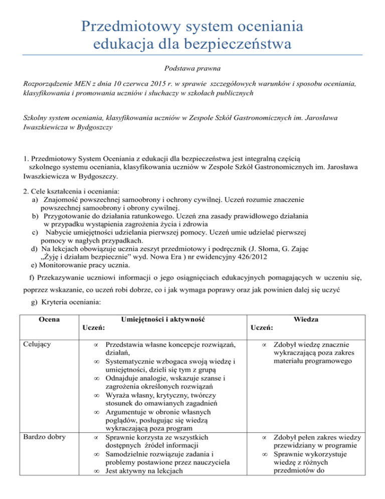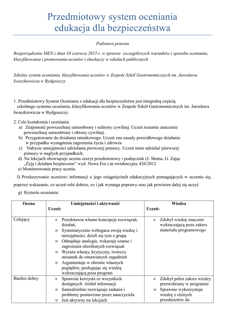Przedmiotowy system oceniania edukacja dla bezpieczeństwa Podstawa prawna Rozporządzenie MEN z dnia 10 czerwca 2015 r. w sprawie szczegółowych warunków i sposobu oceniania, klasyfikowania i promowania uczniów i słuchaczy w szkołach publicznych Szkolny system oceniania, klasyfikowania uczniów w Zespole Szkół Gastronomicznych im. Jarosława Iwaszkiewicza w Bydgoszczy 1. Przedmiotowy System Oceniania z edukacji dla bezpieczeństwa jest integralną częścią szkolnego systemu oceniania, klasyfikowania uczniów w Zespole Szkół Gastronomicznych im. Jarosława Iwaszkiewicza w Bydgoszczy. 2. Cele kształcenia i oceniania: a) Znajomość powszechnej samoobrony i ochrony cywilnej. Uczeń rozumie znaczenie powszechnej samoobrony i obrony cywilnej. b) Przygotowanie do działania ratunkowego. Uczeń zna zasady prawidłowego działania w przypadku wystąpienia zagrożenia życia i zdrowia c) Nabycie umiejętności udzielania pierwszej pomocy. Uczeń umie udzielać pierwszej pomocy w nagłych przypadkach. d) Na lekcjach obowiązuje ucznia zeszyt przedmiotowy i podręcznik (J. Słoma, G. Zając „Żyję i działam bezpiecznie” wyd. Nowa Era ) nr ewidencyjny 426/2012 e) Monitorowanie pracy ucznia. f) Przekazywanie uczniowi informacji o jego osiągnięciach edukacyjnych pomagających w uczeniu się, poprzez wskazanie, co uczeń robi dobrze, co i jak wymaga poprawy oraz jak powinien dalej się uczyć g) Kryteria oceniania: Ocena Umiejętności i aktywność Uczeń: Celujący • • • • • Bardzo dobry • • • Wiedza Uczeń: Przedstawia własne koncepcje rozwiązań, działań, Systematycznie wzbogaca swoją wiedzę i umiejętności, dzieli się tym z grupą Odnajduje analogie, wskazuje szanse i zagrożenia określonych rozwiązań Wyraża własny, krytyczny, twórczy stosunek do omawianych zagadnień Argumentuje w obronie własnych poglądów, posługując się wiedzą wykraczającą poza program Sprawnie korzysta ze wszystkich dostępnych źródeł informacji Samodzielnie rozwiązuje zadania i problemy postawione przez nauczyciela Jest aktywny na lekcjach • Zdobył wiedzę znacznie wykraczającą poza zakres materiału programowego • Zdobył pełen zakres wiedzy przewidziany w programie Sprawnie wykorzystuje wiedzę z różnych przedmiotów do • • • • Dobry • • • • • • Dostateczny • • • Bezbłędnie wykonuje czynności ratownicze, koryguje błędy kolegów Odpowiednio wykorzystuje sprzęt i środki ratownicze Sprawnie wyszukuje w różnych źródłach informacje o sposobach alternatywnego działania Samodzielnie korzysta ze wskazanych źródeł informacji Poprawnie rozumuje w kategoriach przyczynowo – skutkowych Samodzielnie wykonuje typowe zadania o niewielkim stopniu złożoności Podejmuje wybrane zadania dodatkowe Jest aktywny w czasie lekcji Poprawnie wykonuje czynności ratownicze, umie dobrać potrzebny sprzęt Pod kierunkiem nauczyciela wykorzystuje podstawowe źródła informacji Samodzielnie wykonuje proste zadania w trakcie zajęć Przejawia przeciętną aktywność rozwiązywania zadań z edukacji dla bezpieczeństwa • Opanował materiał programowy w stopniu zadowalającym • Opanował podstawowe elementy programu, pozwalające na podjęcie w otoczeniu działań ratowniczych i zabezpieczających Wykazuje braki w wiedzy, nie uniemożliwiają one jednak dalszej edukacji i mogą zostać usunięte Wykazuje braki w wiedzy, które uniemożliwiają dalszy rozwój w ramach przedmiotu Dopuszczający • Przy pomocy nauczyciela wykonuje proste polecenia, wykorzystując podstawowe umiejętności • Niedostateczny • Nie potrafi wykonać prostych poleceń, wymagających zastosowania podstawowych umiejętności • 3. Ocenie podlegają : • Prace klasowe, sprawdziany wiadomości i umiejętności po każdym zrealizowanym dziale, zapowiedziane tydzień wcześniej i z podanym zakresem • kartkówki bieżącego materiału (trzy ostatnie lekcję) ocenione prace są do wglądu u nauczyciela. • Praca na lekcji, wypowiedzi ustne, praca w grupie oraz ćwiczenia indywidualne • Aktywność, jakość i efektywność pracy - ocena pozytywna lub negatywna • Prace domowe • Prace nieobowiązkowe wykraczające poza przewidywane wymagania • Osiągnięcia w konkursach szkolnych i pozaszkolnych obejmujących zakres przedmiotu • Prowadzenie zeszytu 1. Jeżeli uczeń nie pisał pracy klasowej z powodu usprawiedliwionej nieobecności, zobowiązany jest do zaliczenia zaległej pracy w ciągu dwóch tygodni od dnia powrotu do szkoły, uczniowie nieobecni dłużej niż dwa tygodnie ustalą termin zaliczenia materiału indywidualnie z nauczycielem. 2. Uczeń, który pisał sprawdzian (test), pracę klasową i otrzymał ocenę niedostateczną ma prawo do jednorazowej poprawy oceny w terminie ustalonym przez nauczyciela. 3. Na koniec semestru nie przewiduje się końcowego sprawdzianu zaliczeniowego ani poprawiania ocen, które powinny być poprawiane systematycznie w trakcie semestru. 4. Oceny z kartkówek nie podlegają poprawie. 5. Uczeń może w semestrze zgłosić jeden raz nie przygotowanie do lekcji bez podania przyczyny (nie dotyczy zapowiedzianych prac pisemnych). 6. Dopuszcza się możliwość samooceny ucznia przy odpowiedzi ustnej i pracy zespołowej w celu kształtowania umiejętności w tym zakresie. 7. Sprawdzone ocenione i omówione prace pisemne są przekazywane uczniom do wglądu i przechowywane przez nauczyciela do końca roku szkolnego i udostępniane rodzicom na ich życzenie 4. W przypadku sprawdzianów pisemnych lub kartkówek przyjmuje się skalę punktową przeliczoną na oceny cyfrowe wg kryteriów: Procent punktów Ocena 91-100 + wykonanie dodatkowych zadań wskazanych przez nauczyciela 91-100 76-90 51-75 40-50 0-39 Celujący Bardzo dobry dobry dostateczny dopuszczający niedostateczny 5. Ewaluacja - W celu ewaluacji systemu jeden raz w roku nauczyciel przeprowadza rozmowę wśród rodziców i uczniów, wyciąga wnioski i wnosi po