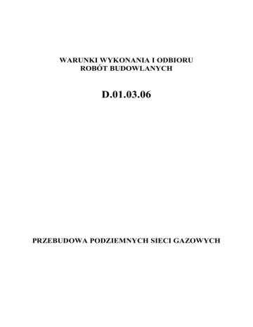WARUNKI WYKONANIA I ODBIORU ROBÓT BUDOWLANYCH D.01.03.06 PRZEBUDOWA PODZIEMNYCH SIECI GAZOWYCH WARUNKI WYKONANIA I ODBIORU ROBÓT BUDOWLANYCH D.01.03.06 1. Wstęp 1.1. Przedmiot WWiORB Przedmiotem niniejszych Warunków Wykonania i Odbioru Robót Budowlanych są wymagania dotyczące wykonania i odbioru przebudowy gazociągów w związku z budową obwodnicy Kościerzyny w ciągu drogi krajowej nr 20 Stargard Szczeciński - Gdynia. 1.2.Określenia podstawowe 1.2.1. sieć gazowa - gazociągi wraz ze stacjami gazowymi, układami pomiarowymi, tłoczniami gazu, magazynami gazu, połączone i współpracujące ze sobą służące do przesyłania i dystrybucji paliw gazowych, należące do przedsiębiorstwa gazowniczego 1.2.2. gazociąg - rurociąg wraz z wyposażeniem służący do przesyłania i rozdziału paliw gazowych, gazociągi dzieli się według: a) maksymalnego ciśnienia roboczego na: gazociągi niskiego ciśnienia do 10 kPa włącznie, gazociągi średniego ciśnienia powyżej 10 kPa do 0,5 MPa włącznie, gazociągi podwyższonego średniego ciśnienia powyżej 0,5 MPa do 1,6 MPa włącznie, gazociągi wysokiego ciśnienia powyżej 1,6 MPa do 10 MPa włącznie, b) stosowanych materiałów na: gazociągi stalowe, gazociągi z tworzyw sztucznych, 1.2.3. przyłącze - odcinek gazociągu od gazociągu zasilającego do kurka głównego włącznie, 1.2.4. kurek główny - urządzenie służące do odcięcia gazu przed wejściem do budynku, zlokalizowany w szafce wolnostojącej lub powieszonej na ścianie zewnętrznej budynku, 1.2.5. rura ochronna - rura o średnicy większej od gazociągu, usytuowana współosiowo z gazociągiem, służąca do zabezpieczenia gazociągu przed naciskami przenoszonymi z powierzchni terenu oraz do odprowadzania na bezpieczną odległość ewentualnych przecieków gazu spowodowanych drobnymi nieszczelnościami lub uszkodzeniami przewodów, 1.2.6. sączek węchowy - urządzenie służące do wykrywania nieszczelności w przewodach gazowych, 1.2.7. rura wydmuchowa - rura służąca do odprowadzenia z rury ochronnej na zewnątrz mniejszych przecieków gazu, a której zakończenie dla gazociągów o ciśnieniu do 0,5 MPa powinno być umieszczone w skrzynce ulicznej, zaś dla gazociągów powyżej 0,5 MPa w kolumnie wydmuchowej, 1.2.8. odległość podstawowa - dopuszczalna odległość osi gazociągu od obiektu terenowego (przeszkody terenowej) bez specjalnych zabezpieczeń gazociągu. 1.2.9. odległość bezpieczna - mierzona w płaszczyźnie poziomej, jest to najmniejsza dopuszczalna odległość między obrysem obiektu terenowego a osią gazociągu, WARUNKI WYKONANIA I ODBIORU ROBÓT BUDOWLANYCH D.01.03.06 1.2.10. strefy kontrolowane - to obszar wyznaczony po obu stronach osi gazociągu, w którym operator sieci gazowej podejmuje czynności w celu zapobieżenia działalności mogącej mieć wpływ na trwałość i prawidłową eksploatację gazociągu. Pozostałe określenia podstawowe w niniejszych WWiORB są zgodne z obowiązującymi odpowiednimi normami oraz D-M.00.00.00 „Wymagania ogólne”. 2. Materiały 2.1. Warunki ogólne stosowania materiałów podano w WWiORB D-M-00.00.00 „Wymagania ogólne”. Wszystkie zakupione przez Wykonawcę materiały, dla których normy PN i BN przewidują posiadanie zaświadczenia o jakości lub atestu, powinny być zaopatrzone przez producenta w taki dokument. Inne materiały powinny być wyposażone w takie dokumenty na życzenie Inżyniera. 2.2. Rury przewodowe Rodzaj rur i ich średnice dobrać odpowiednio do ciśnienia i natężenia przepływu gazu w oparciu o warunki techniczne wydane przez Operatora sieci. Do wykonania sieci gazowej stosuje się następujące materiały: gazociągi podwyższonego średniego i wysokiego ciśnienia rury stalowe zgodnie z PN-EN 10208-2+AC „Rury stalowe przewodowe dla mediów palnych .Rury o klasie wymogów B”, z wykonaną fabrycznie izolacją 3LP odpowiadającą wymaganiom normy DIN 30670, gazociągi średniego i niskiego ciśnienia rury stalowe zgodnie z PN-EN 10208-1+AC „Rury stalowe przewodowe dla mediów palnych .Rury o klasie wymogów A”, z wykonaną fabrycznie izolacją 3LP odpowiadającą wymaganiom normy DIN 30670, rury ciśnieniowe z polietylenu PE klasy PE 80 i PE 100 zgodnie z PN-EN 12007: 2004, PNEN 1555: 2003 spełniające ponadto wymagania lokalnego operatora sieci. 2.3. Rury ochronne Rury ochronne powinny mieć ściankę o grubości nie mniejszej niż grubość ścianki gazociągu. Zewnętrzna powierzchnia rury ochronnej stalowej powinna być zabezpieczona izolacją antykorozyjną wytrzymałą na przebicie prądem o napięciu min. 18 kV, a powierzchnia wewnętrzna przez pomalowanie. Należy unikać łączenia rur przewodowych w obrębie rury ochronnej. Jeżeli zachodzi taka konieczność, do wykonywania połączenia należy stosować wyłącznie mufy elektrooporowe. 2.3.1 Korpus rury ochronnej Do wykonania rur ochronnych należy stosować: rury z polietylenu zgodnie z PN-EN 12007: 2004, PN-EN 1555: 2003, rury stalowe zgodnie z PN-EN 10208-2+AC „Rury stalowe przewodowe dla mediów palnych .Rury o klasie wymogów B” z wykonaną fabrycznie izolacją 3LP WARUNKI WYKONANIA I ODBIORU ROBÓT BUDOWLANYCH D.01.03.06 odpowiadającą wymaganiom normy DIN 30670 w zakresie izolacji połączeń spawanych lub zgodnie z wymogiem operatora sieci. Gatunek stali należy ustalać na podstawie obliczeń wytrzymałościowych. Na żądanie operatora sieci gazowej mogą być stosowane rury o zabezpieczonej zewnętrznie powierzchni z potrójną przekładką z włókna szklanego. Rury ochronne stalowe nie mogą posiadać wewnątrz powłoki bitumicznej. Należy zastosować wewnątrz rury powłokę malarską (3 x chlorokauczuk). Wszelkie roboty spawalnicze na rurze ochronnej wykonywać przed osadzeniem rury przewodowej z PE. W zależności od typu przeszkody terenowej, zarówno w przypadku rury ochronnej stalowej jak i polietylenowej - w sytuacjach wymagających izolacji termicznej, w