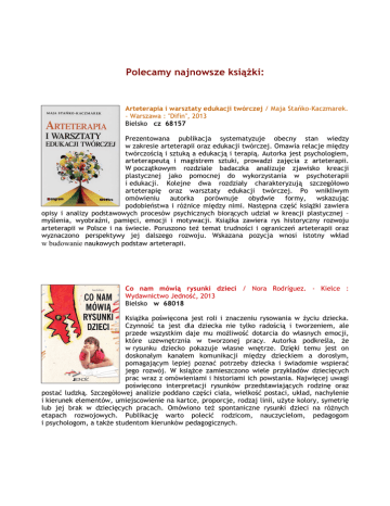 Polecamy najnowsze książki: Arteterapia i warsztaty edukacji twórczej / Maja Stańko-Kaczmarek. - Warszawa : "Difin", 2013 Bielsko cz 68157 Prezentowana publikacja systematyzuje obecny stan wiedzy w zakresie arteterapii oraz edukacji twórczej. Omawia relacje między twórczością i sztuką a edukacją i terapią. Autorka jest psychologiem, arteterapeutą i magistrem sztuki, prowadzi zajęcia z arteterapii. W początkowym rozdziale badaczka analizuje zjawisko kreacji plastycznej jako pomocnej do wykorzystania w psychoterapii i edukacji. Kolejne dwa rozdziały charakteryzują szczegółowo arteterapię oraz warsztaty edukacji twórczej. Po wnikliwym omówieniu autorka porównuje obydwie formy, wskazując podobieństwa i różnice między nimi. Następna część książki zawiera opisy i analizy podstawowych procesów psychicznych biorących udział w kreacji plastycznej – myślenia, wyobraźni, pamięci, emocji i motywacji. Książka zawiera rys historyczny rozwoju arteterapii w Polsce i na świecie. Poruszono też temat trudności i ograniczeń arteterapii oraz wyznaczono perspektywy jej dalszego rozwoju. Wskazana pozycja wnosi istotny wkład w budowanie naukowych podstaw arteterapii. Co nam mówią rysunki dzieci / Nora Rodríguez. - Kielce : Wydawnictwo Jedność, 2013 Bielsko w 68018 Książka poświęcona jest roli i znaczeniu rysowania w życiu dziecka. Czynność ta jest dla dziecka nie tylko radością i tworzeniem, ale przede wszystkim daje mu możliwość dotarcia do własnych emocji, które uzewnętrznia w tworzonej pracy. Autorka podkreśla, że w rysunku dziecko pokazuje własne wnętrze. Dzięki temu jest on doskonałym kanałem komunikacji między dzieckiem a dorosłym, pomagającym lepiej poznać potrzeby dziecka i świadomie wspierać jego rozwój. W książce zamieszczono wiele przykładów dziecięcych prac wraz z omówieniami i historiami ich powstania. Najwięcej uwagi poświęcono interpretacji rysunków przedstawiających rodzinę oraz postać ludzką. Szczegółowej analizie poddano części ciała, wielkość postaci, układ, nachylenie i kierunek elementów, umiejscowienie na kartce, proporcje, rodzaj linii, użyte kolory, symetrię lub jej brak w dziecięcych pracach. Omówiono też spontaniczne rysunki dzieci na różnych etapach rozwojowych. Publikację warto polecić rodzicom, nauczycielom, pedagogom i psychologom, a także studentom kierunków pedagogicznych. Eksperymenty są super! : sekrety chemii, biologii, fizyki... / il. doświadczeń Matthieu Roussel, il. nauk. Corinne Gosset ; teksty Gwenaëlle Aznar [et al.] ; tł. Agnieszka Dziarmaga-Czajkowska. Warszawa : Arkady, cop. 2012 Bielsko w 68163 Książka edukacyjna dla dzieci, opisuje 50 prostych doświadczeń, dzięki którym dziecko pozna sekrety chemii, biologii i fizyki oraz zainteresuje się naukowym poznaniem świata. Pierwsza część książki zawiera tematycznie pogrupowane omówienia eksperymentów. Uporządkowana, identyczna dla każdego doświadczenia budowa opisu zapewnia przejrzystość i łatwość w korzystaniu przez dziecko. Każdy opis zawiera: listę potrzebnych przedmiotów, kolejne kroki postępowania, a także dokładne wyjaśnienie opisywanego prawa natury. Druga część publikacji to Naukowe ABC, zawierające dodatkowe informacje pogłębiające wiedzę na temat badanych zjawisk. Dodatkową zachętą do korzystania z książki są dowcipne, kolorowe ilustracje przyciągające uwagę małego czytelnika. Książka zawiera ostrzeżenie o konieczności nadzoru dorosłych przy niektórych eksperymentach. Krótka historia młodzieżowej subkulturowości / Witold Wrzesień. Warszawa : Wydawnictwo Naukowe PWN, 2013 Bielsko cz 68201 Autorem niniejszej publikacji jest socjolog, profesor UAM w Poznaniu, którego zainteresowania badawcze koncentrują się wokół socjologii młodzieży i kultury młodzieżowej. Praca systematyzuje dotychczasową wiedzę o świecie młodzieżowych subkultur oraz prezentuje najważniejsze subkulturowe wydarzenia począwszy od lat 50. XX wieku. Książkę otwierają rozważania na temat młodzieży jako kategorii społecznej oraz zjawiska młodości, która jest cechą pożądaną współcześnie również w świecie dorosłych. Następnie autor analizuje pojęcia subkultury i subkulturowości, łącząc je z kategorią tożsamości pokoleniowej. Po rozważaniach teoretycznych autor analizuje, jak wskazane cechy zaznaczały swoją obecność w kolejnych wcieleniach kultury młodzieżowej. Prezentację rozpoczyna od pierwszych form subkulturowości, tj. od hipstersów, beatników i bikiniarzy poprzez rockersów, hipisów i skinheadów z lat 60., punków i heavymetalowców z lat 70. i 80. aż po gotów, new romantic czy emo z przełomu wieków. W podsumowaniu autor pyta o perspektywy dalszego rozwoju młodzieżowej subkulturowości. Badacz wysuwa tezę, że ten typ młodzieżowej wrażliwości znika na naszych oczach, stając się historią kultury młodzieżowej. Raj na ziemi czyli Rady nie od parady II / Małgorzata Strzałkowska ; il. Marcin Bruchnalski. - Warszawa : Wydawnictwo Czarna Owca, 2011 Bielsko w 68210 „Rady nie od parady” to zbiór wierszy Małgorzaty Strzałkowskiej dobrze znany dziecięcemu czytelnikowi. Kolejny tom poezji nosi nazwę „Raj na Ziemi”, gdyż utwory tematycznie związane są z problemem poszanowania środowiska naturalnego. Mowa jest zarówno o zwierzętach i roślinach, jak i o czystości wód i powietrza. Pomimo poważnego tematu nie ma tu mowy o nudnym moralizatorstwie. Poezja ta w ciekawy i zabawny sposób poszerza wiedzę małego czytelnika z zakresu edukacji ekologicznej, np. na temat zdrowej żywności. Każdy wiersz zamyka rymujący się morałprzysłowie, znajdujący się na oddzielnej stronicy i wyróżniony graficznie, co sprzyja lepszemu zapamiętaniu mądrej wskazówki. Dzięki dowcipowi i znakomitemu kunsztowi literackiemu lektura powyższego tomiku może być prawdziwą przyjemnością nie tylko dla dzie
