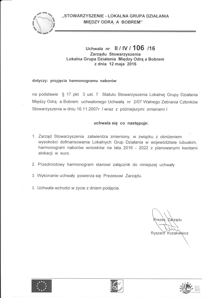 Uchwała Nr II/IV/106/16 Zarządu Stowarzyszenia Lokalna Grupa
