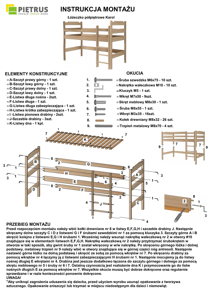 INSTRUKCJA MONTAŻU Łóżeczko półpiętrowe Karol OKUCIA ELEMENTY KONSTRUKCYJNE • • • • • • • • • • • A-Szczyt prawy górny - 1 szt. B-Szczyt lewy górny - 1 szt. C-Szczyt prawy dolny - 1 szt. D-Szczyt lewy dolny - 1 szt. E-Listwa długa nośna - 2szt. F-Listwa długa - 1 szt. G-Listwa długa zabezpieczająca - 1 szt. H-Listwa krótka zabezpieczająca - 1 szt. I -Listwa pionowa drabiny - 2szt. J-Szczeble drabiny - 3szt. K-Listwy dna - 1 kpl. 1. 2. • Śruba szwedzka M6x75 - 10 szt. • Nakrętka wałeczkowa M10 - 10 szt. 3. • Kluczyk M5 - 1 szt. 4. • Wkręt M7x50 - 9szt. 5. • Skręt meblowy M8x30 - 1 szt. 6. • Śruba M6x55 - 1 szt. 7. • Wkręt M3x35 - 16szt. 8. • Kołek drewniany M8x32 - 26 szt. 9. • Trzpień metalowy M8x70 - 4 szt. 7 7 K 7 9 B 3 2 G 8 2 H 1 E 6 8 D 2 A 3 5 4 1 F 2 4 J 1 C 8 2 1 3 I PRZEBIEG MONTAŻU 9 8 1 3 7 4 Przed rozpoczęciem montażu należy wbić kołki drewniane nr 8 w listwy E,F,G,H i szczeble drabiny J. Następnie skręcamy dolne szczyty C i D z listwami G i F śrubami szwedzkimi nr 1 za pomocą kluczyka 3. Szczyty górne A i B skręcić kolejno z listwami E,G i H śrubami 1. Wcześniej należy wsunąć nakrętkę wałeczkową nr 2 w otwory #10 znajdujące się w elementach listwach E,F,G,H. Nakrętkę wałeczkową nr 2 należy przytrzymać śrubokrętem w otworze w taki sposób, aby gwint śruby nr 1 został wkręcony w w/w nakrętkę. Po skręceniu górnego łóżka i dolnej podstawy, metalowy trzpień nr 9 należy wbić w otwory znajdujące się w górnej części nóg antresoli. Następnie nastawić górne łóżko na dolną podstawę i skręcić ze sobą za pomocą wkrętów nr 7. Po skręceniu drabiny za pomocą wkrętów nr 4 łączymy ją z listwami zabezpieczającymi H śrubami nr 1. Następnie mocujemy ją do listwy nośnej długiej E wkrętami nr 4. Drabina jest jeszcze dodatkowo łączona do szczytu górnego i dolnego za pomocą skrętu meblowego nr 5 i śruby nr 6 i 7. Ostatną czynnością jest rozłożenie dna K i przymocowanie go do listw nośnych długich E za pomocą wkrętów nr 7. Wszystkie okucia muszą być dobrze dokręcone oraz regularnie sprawdzane i w razie konieczności ponownie dokręcone. UWAGA! "Aby uniknąć zagrożenia uduszenia się dziecka, przed użyciem wyrobu usunąć opakowanie z tworzywa sztucznego. Opakowanie zniszczyć lub trzymać w miejscu niedostępnym dla dzieci i niemowląt.