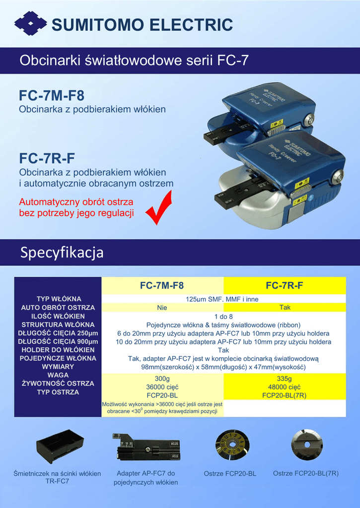 SUMITOMO ELECTRIC Obcinarki światłowodowe serii FC-7 FC-7M-F8 Obcinarka z podbierakiem włókien FC-7R-F Obcinarka z podbierakiem włókien i automatycznie obracanym ostrzem Automatyczny obrót ostrza bez potrzeby jego regulacji Specyfikacja FC-7M-F8 TYP WŁÓKNA AUTO OBRÓT OSTRZA ILOŚĆ WŁÓKIEN STRUKTURA WŁÓKNA DŁUGOŚĆ CIĘCIA 250µm DŁUGOŚĆ CIĘCIA 900µm HOLDER DO WŁÓKIEN POJEDYŃCZE WŁÓKNA WYMIARY WAGA ŻYWOTNOŚĆ OSTRZA TYP OSTRZA FC-7R-F 125µm SMF, MMF i inne Tak Nie 1 do 8 Pojedyncze włókna & taśmy światłowodowe (ribbon) 6 do 20mm przy użyciu adaptera AP-FC7 lub 10mm przy użyciu holdera 10 do 20mm przy użyciu adaptera AP-FC7 lub 10mm przy użyciu holdera Tak Tak, adapter AP-FC7 jest w komplecie obcinarką światłowodową 98mm(szerokość) x 58mm(długość) x 47mm(wysokość) 300g 36000 cięć FCP20-BL 335g 48000 cięć FCP20-BL(7R) Możliwość wykonania >36000 cięć jeśli ostrze jest 0 obracane <30 pomiędzy krawędziami pozycji Śmietniczek na ścinki włókien TR-FC7 Adapter AP-FC7 do pojedynczych włókien Ostrze FCP20-BL Ostrze FCP20-BL(7R)