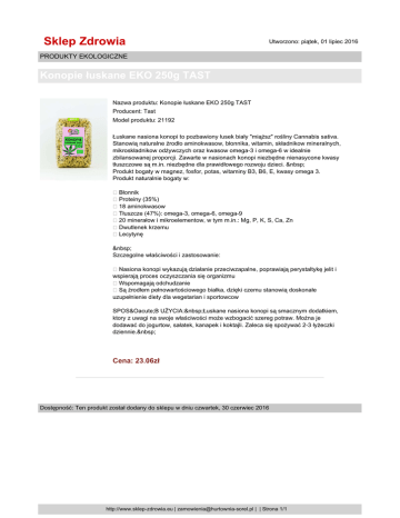 Sklep Zdrowia Utworzono: piątek, 01 lipiec 2016 PRODUKTY EKOLOGICZNE Konopie łuskane EKO 250g TAST Nazwa produktu: Konopie łuskane EKO 250g TAST Producent: Tast Model produktu: 21192 Łuskane nasiona konopi to pozbawiony łusek biały "miąższ" rośliny Cannabis sativa. Stanowią naturalne źrodło aminokwasow, błonnika, witamin, składnikow mineralnych, mikroskładnikow odżywczych oraz kwasow omega-3 i omega-6 w idealnie zbilansowanej proporcji. Zawarte w nasionach konopi niezbędne nienasycone kwasy tłuszczowe są m.in. niezbędne dla prawidłowego rozwoju dzieci. Produkt bogaty w magnez, fosfor, potas, witaminy B3, B6, E, kwasy omega 3. Produkt naturalnie bogaty w: Błonnik Proteiny (35%) 18 aminokwasow Tłuszcze (47%): omega-3, omega-6, omega-9 20 minerałow i mikroelementow, w tym m.in.: Mg, P, K, S, Ca, Zn Dwutlenek krzemu Lecytynę Szczegolne właściwości i zastosowanie: Nasiona konopi wykazują działanie przeciwzapalne, poprawiają perystaltykę jelit i wspierają proces oczyszczania się organizmu Wspomagają odchudzanie Są źrodłem pełnowartościowego białka, dzięki czemu stanowią doskonałe uzupełnienie diety dla wegetarian i sportowcow SPOSÓB UŻYCIA: Łuskane nasiona konopi są smacznym dodatkiem, ktory z uwagi na swoje właściwości może wzbogacić szereg potraw. Można je dodawać do jogurtow, sałatek, kanapek i koktajli. Zaleca się spożywać 2-3 łyżeczki dziennie. Cena: 23.06zł Dostępność: Ten produkt został dodany do sklepu w dniu czwartek, 30 czerwiec 2016 http://www.sklep-zdrowia.eu | [email protected] | | Strona 1/1