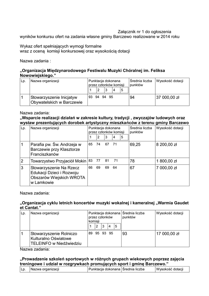 Załącznik nr 1 do ogłoszenia wyników konkursu ofert na zadania własne gminy Barczewo realizowane w 2014 roku Wykaz ofert spełniających wymogi formalne wraz z oceną komisji konkursowej oraz wysokością dotacji Nazwa zadania : „Organizacja Międzynarodowego Festiwalu Muzyki Chóralnej im. Feliksa Nowowiejskiego.” Lp. Nazwa organizacji Punktacja dokonana przez członków komisji 1 2 3 4 5 Średnia liczba punktów Wysokość dotacji 1 Stowarzyszenie Inicjatyw Obywatelskich w Barczewie 93 94 94 95 94 37 000,00 zł Nazwa zadania: „Wsparcie realizacji działań w zakresie kultury, tradycji , zwyczajów ludowych oraz wystaw prezentujących dorobek artystyczny mieszkańców z terenu gminy Barczewo Lp. Nazwa organizacji Punktacja dokonana przez członków komisji 1 2 3 4 5 Średnia liczba punktów Wysokość dotacji 1 Parafia pw. Św. Andrzeja w Barczewie przy Klasztorze Franciszkanów 65 74 67 71 69,25 8 200,00 zł 2 Towarzystwo Przyjaciół Mokin 83 77 81 71 78 1 800,00 zł 3 66 69 Stowarzyszenie Na Rzecz Edukacji Dzieci i Rozwoju Obszarów Wiejskich WROTA w Lamkowie 69 64 67 7 000,00 zł Nazwa zadania: „Organizacja cyklu letnich koncertów muzyki wokalnej i kameralnej „Warmia Gaudet et Cantat.” Lp. Nazwa organizacji 1 Stowarzyszenie Rolniczo Kulturalno Oświatowe TELEINFO w Niedźwiedziu Nazwa zadania: Punktacja dokonana Średnia liczba przez członków punktów komisji 1 2 3 4 5 Wysokość dotacji 89 95 93 95 17 000,00 zł 93 „Prowadzenie szkoleń sportowych w różnych grupach wiekowych poprzez zajęcia treningowe i udział w rozgrywkach promujących sport i gminę Barczewo.” Lp. Nazwa organizacji Punktacja dokonana Średnia liczba Wysokość dotacji przez członków komisji punktów 1 65 65 65 65 Stowarzyszenie Na Rzecz Edukacji Dzieci i Rozwoju Obszarów Wiejskich WROTA w Lamkowie 65 8 000,00 zł 2 Gminny Klub Sportowy PISA w Barczewie 65 65 65 65 65 90 000,00 zł 3 Uczniowski Klub Sportowy BUKS Barczewo 65 65 65 65 65 13 000,00 zł 4 Klub Sportowy Niedźwiedź Ramsowo 65 65 65 65 65 19 400,00 zł 65 65 65 65 5 Klub Sportowy Łęgajny 65 9 600,00 zł Uczniowski Klub Sportowy GALA Barczewo nie spełnił wymogów formalny i nie została przyznana dotacja. Nazwa zadania: „Organizacja integracyjnych imprez sportowych , rekreacyjnych lub szkoleniowych o zasięgu lokalnym lub ponad lokalnym promujących gminę Barczewo i jej walory turystyczne.” Lp. Nazwa organizacji Punktacja dokonana Średnia liczba przez członków punktów komisji 1 2 3 4 5 Wysokość dotacji 1 Stowarzyszenie Kulturalno Oświatowe Pojezierze 73 73 73 73 73 2 285,00 zł 2 Stowarzyszenie Inicjatyw Obywatelskich w Barczewie 60 60 61 61 60,5 1 739,56 zł 3 Klub Sportowy Niedźwiedź Ramsowo 71 71 71 71 71 1 975,00 zł 4 Związek Stowarzyszeń „Razem w Olsztynie” 61 61 61 61 61 4 250,00 zł 5 Stowarzyszenie Inicjatyw Obywatelskich w Barczewie 71 71 71 71 70,25 2 350,44 zł 6 Stowarzyszenie Wiejskie „Nasze Skajboty „ 69 71 71 70 70,25 2 400,00 zł
