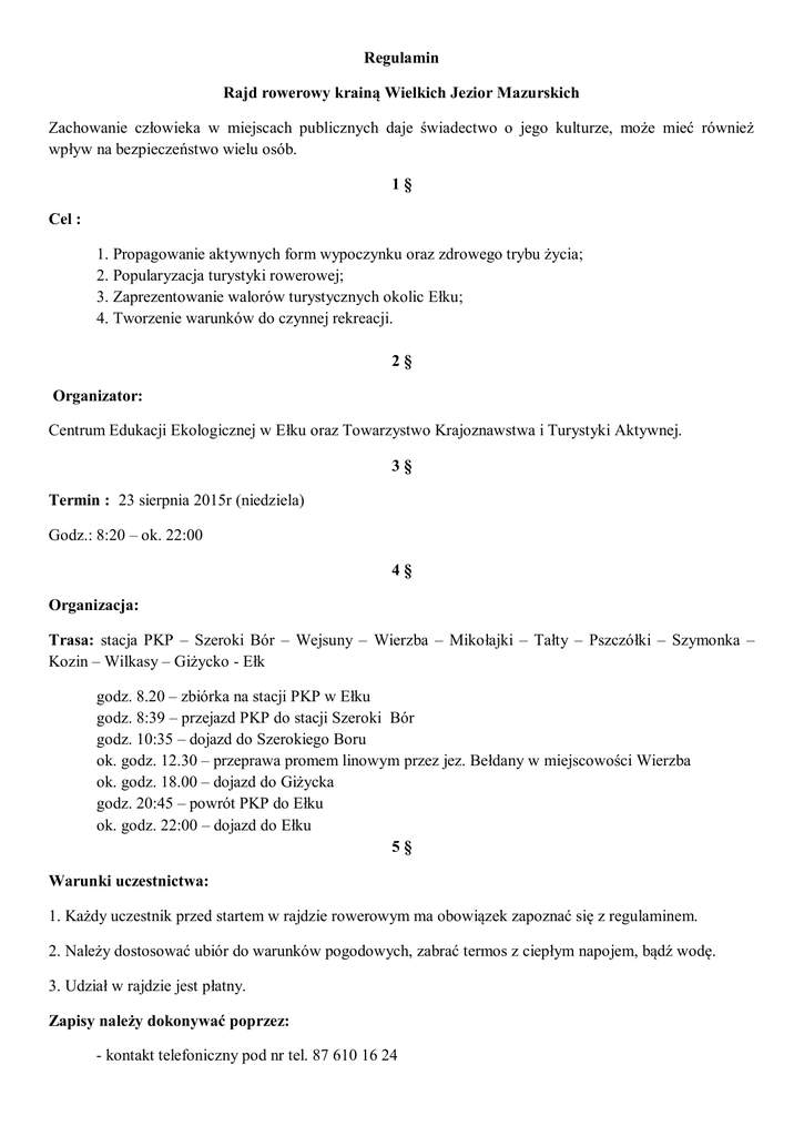 Regulamin Rajd rowerowy krainą Wielkich Jezior Mazurskich Zachowanie człowieka w miejscach publicznych daje świadectwo o jego kulturze, może mieć również wpływ na bezpieczeństwo wielu osób. 1§ Cel : 1. Propagowanie aktywnych form wypoczynku oraz zdrowego trybu życia; 2. Popularyzacja turystyki rowerowej; 3. Zaprezentowanie walorów turystycznych okolic Ełku; 4. Tworzenie warunków do czynnej rekreacji. 2§ Organizator: Centrum Edukacji Ekologicznej w Ełku oraz Towarzystwo Krajoznawstwa i Turystyki Aktywnej. 3§ Termin : 23 sierpnia 2015r (niedziela) Godz.: 8:20 – ok. 22:00 4§ Organizacja: Trasa: stacja PKP – Szeroki Bór – Wejsuny – Wierzba – Mikołajki – Tałty – Pszczółki – Szymonka – Kozin – Wilkasy – Giżycko - Ełk godz. 8.20 – zbiórka na stacji PKP w Ełku godz. 8:39 – przejazd PKP do stacji Szeroki Bór godz. 10:35 – dojazd do Szerokiego Boru ok. godz. 12.30 – przeprawa promem linowym przez jez. Bełdany w miejscowości Wierzba ok. godz. 18.00 – dojazd do Giżycka godz. 20:45 – powrót PKP do Ełku ok. godz. 22:00 – dojazd do Ełku 5§ Warunki uczestnictwa: 1. Każdy uczestnik przed startem w rajdzie rowerowym ma obowiązek zapoznać się z regulaminem. 2. Należy dostosować ubiór do warunków pogodowych, zabrać termos z ciepłym napojem, bądź wodę. 3. Udział w rajdzie jest płatny. Zapisy należy dokonywać poprzez: - kontakt telefoniczny pod nr tel. 87 610 16 24 - osobiście w CEE w Ełku, ul. Parkowa 12, 19-300 Ełk, w godz. 8.00-16.00 - kontakt e-mailowy: [email protected] 4. Zapisy prowadzone są do 18 sierpnia 2015r. 5. Przy zapisach decyduje kolejność zgłoszeń. 6. Opłatę organizacyjną w kwocie: 60zł/osoba należy uiścić w CEE, ul. Parkowa 12. W przypadku rezygnacji wpisowe nie podlega zwrotowi. 7. W rajdzie mogą wziąć udział wszyscy posiadający rower, którzy złożą zgłoszenie w terminie. 8. W przypadku chęci uczestnictwa osób niepełnoletnich wymagany jest opiekun dorosły. 9. W przypadku uczestnictwa małych dzieci rodzice lub opiekunowie zobowiązani są do zapewnienia im fotelika rowerowego. 10. W przypadku rezygnacji z rajdu organizator prosi o informację telefoniczną o rezygnacji, dzięki czemu możliwe będzie uczestnictwo innych potencjalnych osób, których udział nie był możliwy z powodu wyczerpania limitu miejsc. 11. W trakcie trwania rajdu obowiązuje całkowity zakaz spożywania napojów alkoholowych. Organizator zastrzega sobie możliwość niedopuszczenia osoby, której stan wskazuje na jego spożycie, do uczestnictwa w warsztatach. 12. Z różnych przyczyn od nas niezależnych można opłacić rajd rowerowy w niedzielę przed wyruszeniem na rajd. 13. Organizatorzy w ramach wpisowego zapewniają: ubezpieczenie uczestników rajdu; apteczkę pierwszej pomocy; bilety PKP i na prom linowy 6§ Zasady zachowania uczestników: Każdy uczestnik powinien: 1. Przestrzegać regulaminu oraz poleceń prowadzących i organizatora. 2. Przed wyruszeniem prowadzący omówi trasę z uwzględnieniem miejsc niebezpiecznych, stwarzających zagrożenie. 3.Uczestnicy są zobowiązani do przestrzegania przepisów prawa drogowego, ochrony przyrody oraz karty turysty. 7§ Na trasie zabrania się: 1. Zaśmiecania trasy rajdu oraz miejsc przyległych; 2. Głośnego zachowywania się; 3. Zbaczania z trasy bez zgody organizatora. 8§ Odpowiedzialność organizatora: 1. Organizatorzy nie przyjmują odpowiedzialności za wypadki i szkody wynikłe w czasie rajdu zarówno wobec uczestników jak i osób trzecich. 2. Udział w rajdzie rowerowym jest dobrowolny. 3. Organizator nie ponosi odpowiedzialności za rzeczy zgubione podczas imprezy i za szkody wyrządzone przez uczestników. 4. Organizator nie zapewnia miejsca do przechowywania rzeczy uczestników. 9§ Postanowienia końcowe: 1. Wszyscy uczestnicy startując w rajdzie wyrażają zgodę na publikację ich wizerunków w relacjach w przebiegu wędrówki, zamieszczonych w mediach. 2. Udział w rajdzie jest równoznaczny z zapoznaniem się i akceptacją niniejszego regulaminu. 3. Ostateczna interpretacja regulaminu należy do organizatora. W sprawach spornych decyzja organizatora jest decyzją ostateczną.
