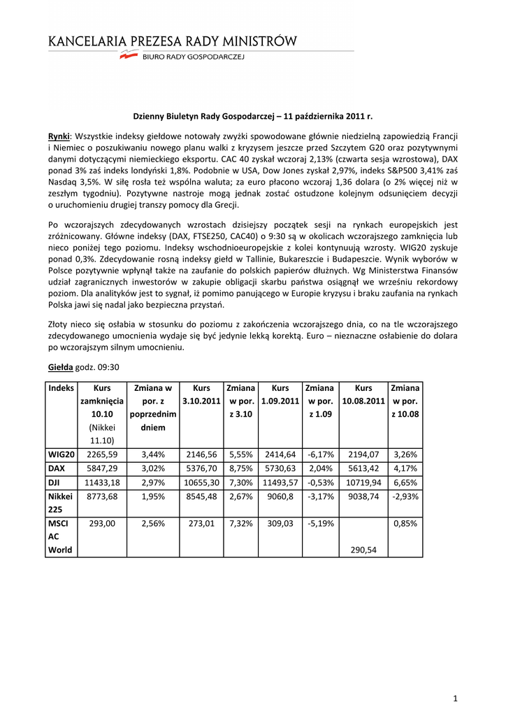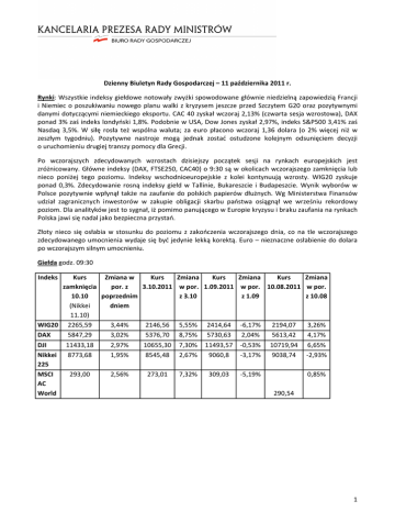 Dzienny Biuletyn Rady Gospodarczej – 11 października 2011 r. Rynki: Wszystkie indeksy giełdowe notowały zwyżki spowodowane głównie niedzielną zapowiedzią Francji i Niemiec o poszukiwaniu nowego planu walki z kryzysem jeszcze przed Szczytem G20 oraz pozytywnymi danymi dotyczącymi niemieckiego eksportu. CAC 40 zyskał wczoraj 2,13% (czwarta sesja wzrostowa), DAX ponad 3% zaś indeks londyński 1,8%. Podobnie w USA, Dow Jones zyskał 2,97%, indeks S&P500 3,41% zaś Nasdaq 3,5%. W siłę rosła też wspólna waluta; za euro płacono wczoraj 1,36 dolara (o 2% więcej niż w zeszłym tygodniu). Pozytywne nastroje mogą jednak zostać ostudzone kolejnym odsunięciem decyzji o uruchomieniu drugiej transzy pomocy dla Grecji. Po wczorajszych zdecydowanych wzrostach dzisiejszy początek sesji na rynkach europejskich jest zróżnicowany. Główne indeksy (DAX, FTSE250, CAC40) o 9:30 są w okolicach wczorajszego zamknięcia lub nieco poniżej tego poziomu. Indeksy wschodnioeuropejskie z kolei kontynuują wzrosty. WIG20 zyskuje ponad 0,3%. Zdecydowanie rosną indeksy giełd w Tallinie, Bukareszcie i Budapeszcie. Wynik wyborów w Polsce pozytywnie wpłynął także na zaufanie do polskich papierów dłużnych. Wg Ministerstwa Finansów udział zagranicznych inwestorów w zakupie obligacji skarbu państwa osiągnął we wrześniu rekordowy poziom. Dla analityków jest to sygnał, iż pomimo panującego w Europie kryzysu i braku zaufania na rynkach Polska jawi się nadal jako bezpieczna przystań. Złoty nieco się osłabia w stosunku do poziomu z zakończenia wczorajszego dnia, co na tle wczorajszego zdecydowanego umocnienia wydaje się być jedynie lekką korektą. Euro – nieznaczne osłabienie do dolara po wczorajszym silnym umocnieniu. Giełda godz. 09:30 Indeks Kurs Zmiana w Kurs zamknięcia por. z 3.10.2011 10.10 poprzednim (Nikkei dniem 11.10) WIG20 2265,59 3,44% 2146,56 DAX 5847,29 3,02% 5376,70 DJI 11433,18 2,97% 10655,30 Nikkei 8773,68 1,95% 8545,48 225 MSCI 293,00 2,56% 273,01 AC World Zmiana Kurs Zmiana Kurs Zmiana w por. 1.09.2011 w por. 10.08.2011 w por. z 3.10 z 1.09 z 10.08 5,55% 8,75% 7,30% 2,67% 2414,64 5730,63 11493,57 9060,8 -6,17% 2,04% -0,53% -3,17% 7,32% 309,03 -5,19% 2194,07 5613,42 10719,94 9038,74 3,26% 4,17% 6,65% -2,93% 0,85% 290,54 1 Waluty (09:30) Zmiana Zmiana Zmiana Zmiana Kurs Kurs Kurs Waluty Kurs w por. w por. w por. dzienna 3.10.2011 1.9.2011 2.8.2011 z 3.10 z 1.09 z 2.08 CHF3,50 0,34% 3,6212 -3,37% 3,65 -4,14% 3,70 -5,45% PLN EUR4,32 0,40% 4,3944 -1,72% 4,14 4,25% 4,02 7,40% PLN USD3,3162 -4,72% 2,90 8,79% 2,82 12,13% 3,16 0,36% PLN EUR1,23 0,12% 1,2143 1,66% 1,13 8,91% 1,09 13,61% CHF EUR1,37 0,26% 1,3190 3,65% 1,43 -4,12% 1,42 -3,65% USD CHF1,11 0,14% 1,0861 1,98% 1,26 1,30 USD 11,96% 14,87% CHF7,37 -0,04% 7,5304 -2,14% 8,06 -8,59% 8,38 SEK 12,06% UE: Decyzja o uruchomieniu drugiej transzy pomocy dla Grecji kolejny raz przesunięta. Herman van Rompuy przesunął termin nadzwyczajnego szczytu eurogrupy na 23 października, dając tym samym więcej czasu Francji i Niemcom na wypracowanie wspólnego stanowiska w sprawie dokapitalizowania europejskich banków. Premier Wielkiej Brytanii David Cameron zachęcał w weekend Francję i Niemcy do przyjęcia ambitnego planu, który jak „wielka bazooka” rozwiąże wszystkie problemy strefy euro. Jego zdaniem szefowie strefy euro muszą skończyć z zasadą „zbyt mało, zbyt późno”. Zagrożony bankructwem z powodu kryzysu w strefie euro francusko-belgijski bank Dexia zostanie podzielony. Środki na dokapitalizowanie banku wyasygnują rządy Belgii (60,5% gwarancji), Francji (36,5%) oraz Luksemburga (3%). Dzięki temu belgijskie państwo przejmie 100% udziałów belgijskiej części banku. We Francji, gdzie Dexia zajmowała się głównie finansowaniem samorządów, miast i społeczności lokalnych, zostanie prawdopodobnie wchłonięta przez francuską Bank Pocztowy lub rządowy fundusz inwestycyjny. Premier Słowacji Iveta Radicova walczy o poparcie parlamentu podczas wtorkowego głosowania nad wzmocnieniem Europejskiego Funduszu Stabilizacji Finansowej. Przeciw jest nadal koalicyjna partia Wolność i Solidarność Ryszarda Sulika. Premier Radicova zagroziła, iż odrzucenie decyzji przez Parlament uzna za wotum nieufności i poda rząd Słowacji do dymisji. Dane: W ujęciu odsezonowanym eksport z Niemiec wzrósł o 3,5% (m/m) do najwyższego poziomu w historii i osiągnął w sierpniu 90,5 mld euro. Pozytywne dane płyną także z Włoch i Francji. Produkcja przemysłowa we Francji niespodziewanie wzrosła w sierpniu 2011 r. o 0,5% (m/m), podczas gdy miesiąc wcześniej wzrosła o 1,8%, po korekcie. Produkcja przemysłowa we Włoszech w sierpniu 2011 r. niespodziewanie wzrosła aż o 4,3% (m/m), po spadku w lipcu o 0,3%, po korekcie. Natomiast produkcja przemysłowa Grecji spadła w sierpniu 2011 r. o 11,7% (r/r). 2 Inne: Thomas J. Sargent oraz Christofer A. Sims – tegoroczni laureaci nagrody Nobla z ekonomii – ogłosili, iż kryzys zadłużenia w strefie euro nie stanowi problemu ekonomicznego, a wyłącznie polityczny. Wzorzec rozwiązania, wg nich, leży w decyzji 13 stanów zjednoczonych dotkniętych poważnym kryzysem finansów publicznych w 1776 roku, które postanowiły połączyć swojego budżety uchwalając konstytucję federalną w 1787 roku. Współpraca: Departament Analiz Strategicznych KPRM i Departament Polityki Ekonomicznej MSZ 3