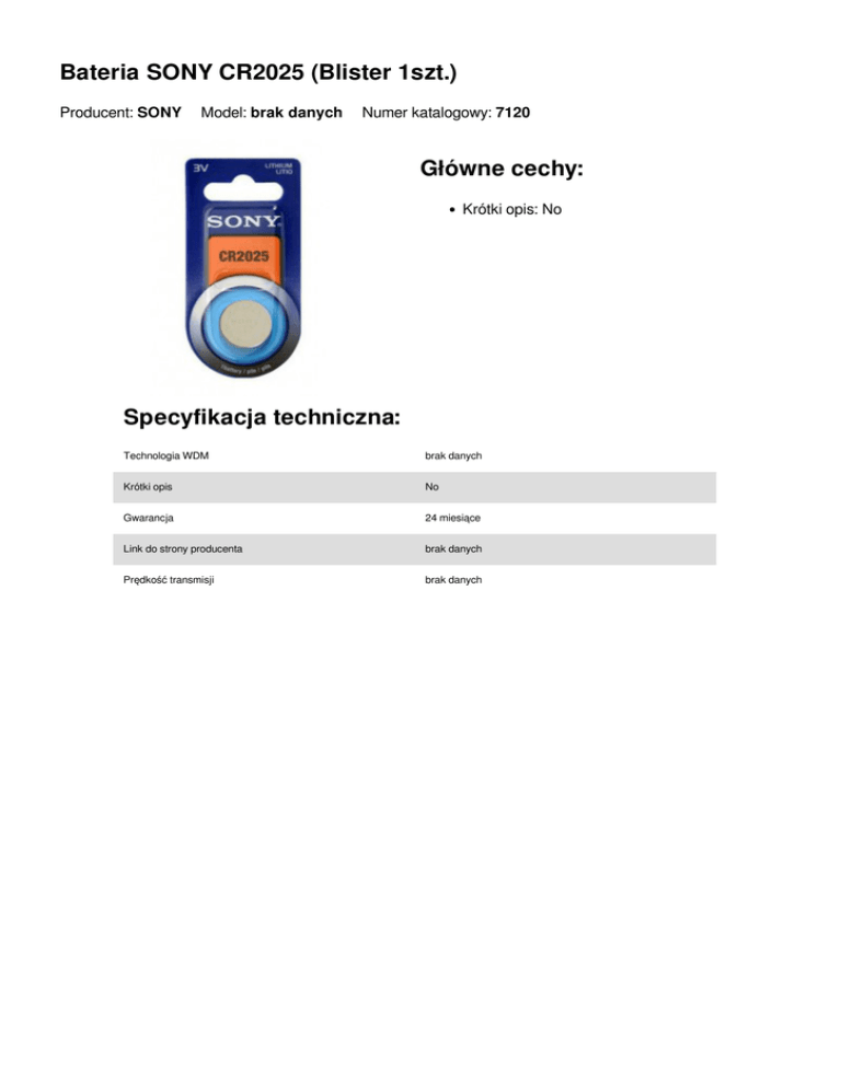 Bateria SONY CR2025 (Blister 1szt.) Producent: SONY Model: brak danych Numer katalogowy: 7120 Główne cechy: Krótki opis: No Specyfikacja techniczna: Technologia WDM brak danych Krótki opis No Gwarancja 24 miesiące Link do strony producenta brak danych Prędkość transmisji brak danych