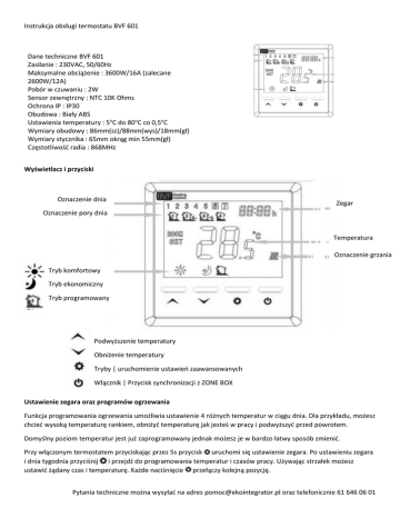 Instrukcja obsługi termostatu BVF 601 Dane techniczne BVF 601 Zasilanie : 230VAC, 50/60Hz Maksymalne obciążenie : 3600W/16A (zalecane 2600W/12A) Pobór w czuwaniu : 2W Sensor zewnętrzny : NTC 10K Ohms Ochrona IP : IP30 Obudowa : Biały ABS Ustawienia temperatury : 5oC do 80oC co 0,5oC Wymiary obudowy : 86mm(sz)/88mm(wys)/18mm(gł) Wymiary stycznika : 65mm okrąg min 55mm(gł) Częstotliwość radia : 868MHz Wyświetlacz i przyciski Oznaczenie dnia Zegar Oznaczenie pory dnia Temperatura Oznaczenie grzania Tryb komfortowy Tryb ekonomiczny Tryb programowany Podwyższenie temperatury Obniżenie temperatury Tryby | uruchomienie ustawień zaawansowanych Włącznik | Przycisk synchronizacji z ZONE BOX Ustawienie zegara oraz programów ogrzewania Funkcja programowania ogrzewania umożliwia ustawienie 4 różnych temperatur w ciągu dnia. Dla przykładu, możesz chcieć wysoką temperaturę rankiem, obniżyć temperaturę jak jesteś w pracy i podwyższyć przed powrotem. Domyślny poziom temperatur jest już zaprogramowany jednak możesz je w bardzo łatwy sposób zmienić. Przy włączonym termostatem przyciskając przez 5s przycisk uruchomi się ustawienie zegara. Po ustawieniu zegara i dnia tygodnia przyciśnij i przejdź do programowania temperatur i czasów pracy. Używając strzałek możesz ustawić żądany czas i temperaturę. Każde naciśnięcie przełączy kolejną pozycję. Pytania techniczne można wysyłać na adres [email protected] oraz telefonicznie 61 646 06 01 Instrukcja obsługi termostatu BVF 601 Ustawienie zaawansowane : Po wyłączeniu termostatu należy przez 5 sekundy przytrzymać przycisk pozycjami meny dokonujemy każdorazowo przez naciśnięcie . Menu 01 02 03 04 05 06 07 08 09 10 11 Opis Kalibracja temperatury Ustawienie maksymalnej temperatury Ustawienie minimalnej temperatury Wybór aktywnego czujnika temperatury Temperatura przeciw zamrożeniowa Temperatura podłogi Blokada temperatury podłogi Tryb komfortowy ograniczenie temperatury Tryb ekonomiczny ograniczenie temperatury Tryb programowania ograniczenie temperatury Reset ustawień termostatu oraz strzałkę w górę. Przejście pomiędzy Zakres -8 C do +8oC +5oC do +80oC +5oC do +80oC Pokój/Podłoga/Pokój i podłoga +5oC do +15oC Tylko odczyt +20oC do +80oC +5oC do +35oC +5oC do +35oC +5oC do +35oC YES/NO o Schemat podłączenia okablowania Czujnik temperatury Urządzenie grzewcze np. Caleo Zasilanie 230V Pytania techniczne można wysyłać na adres [email protected] oraz telefonicznie 61 646 06 01