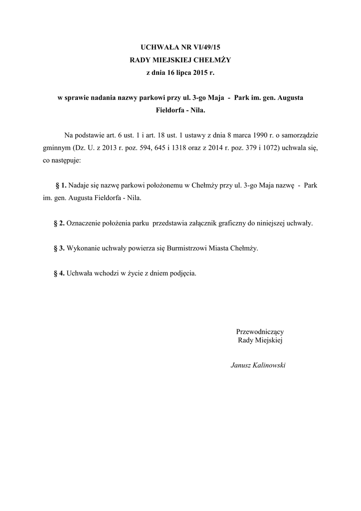 UCHWAŁA NR VI/49/15 RADY MIEJSKIEJ CHEŁMŻY z dnia 16 lipca 2015 r. w sprawie nadania nazwy parkowi przy ul. 3-go Maja - Park im. gen. Augusta Fieldorfa - Nila. Na podstawie art. 6 ust. 1 i art. 18 ust. 1 ustawy z dnia 8 marca 1990 r. o samorządzie gminnym (Dz. U. z 2013 r. poz. 594, 645 i 1318 oraz z 2014 r. poz. 379 i 1072) uchwala się, co następuje: § 1. Nadaje się nazwę parkowi położonemu w Chełmży przy ul. 3-go Maja nazwę - Park im. gen. Augusta Fieldorfa - Nila. § 2. Oznaczenie położenia parku przedstawia załącznik graficzny do niniejszej uchwały. § 3. Wykonanie uchwały powierza się Burmistrzowi Miasta Chełmży. § 4. Uchwała wchodzi w życie z dniem podjęcia. Przewodniczący Rady Miejskiej Janusz Kalinowski Uzasadnienie do uchwały nr VI/49/15 Rady Miejskiej Chełmży z dnia 16 lipca 2015 r. w sprawie nadania nazwy parkowi przy ul. 3-go Maja - Park im. gen. Augusta Fieldorfa - Nila. Na podstawie art. 18 ust. 1 ustawy z dnia 8 marca 1990 r. o samorządzie gminnym do właściwości rady gminy należą wszystkie sprawy pozostające w zakresie działania gminy, o ile ustawy nie stanowią inaczej. Uchwała o nadaniu nazwy parkowi przy ul. 3-go Maja w Chełmży - Park im. gen. Augusta Fieldorfa - Nila została wywołana z inicjatywy grupy mieszkańców miasta. Nadanie nazwy parkowi według wnioskodawców ma na celu uczczenie pamięci poległego za wolność i niepodległość, jednego z najodważniejszych i najbardziej zasłużonych Polaków XX wieku, generała Emila Augusta Fieldorfa ps. Nil. August Emil Fieldorf ps. Nil ur. 20 marca 1895 r. w Krakowie, zm. 24 lutego 1953 r. w Warszawie, bojownik o niepodległość Polski, generał brygady Wojska Polskiego, organizator i dowódca Kedywu Armii Krajowej, zastępca Komendanta Głównego AK, pośmiertnie odznaczony Orderem Orła Białego. Stosownie do powyższego podjęcie przedmiotowej uchwały o nadaniu parkowi przy ul. 3-go Maja w Chełmży, nazwy - Park im. gen. Augusta Fieldorfa - Nila jest zasadne.