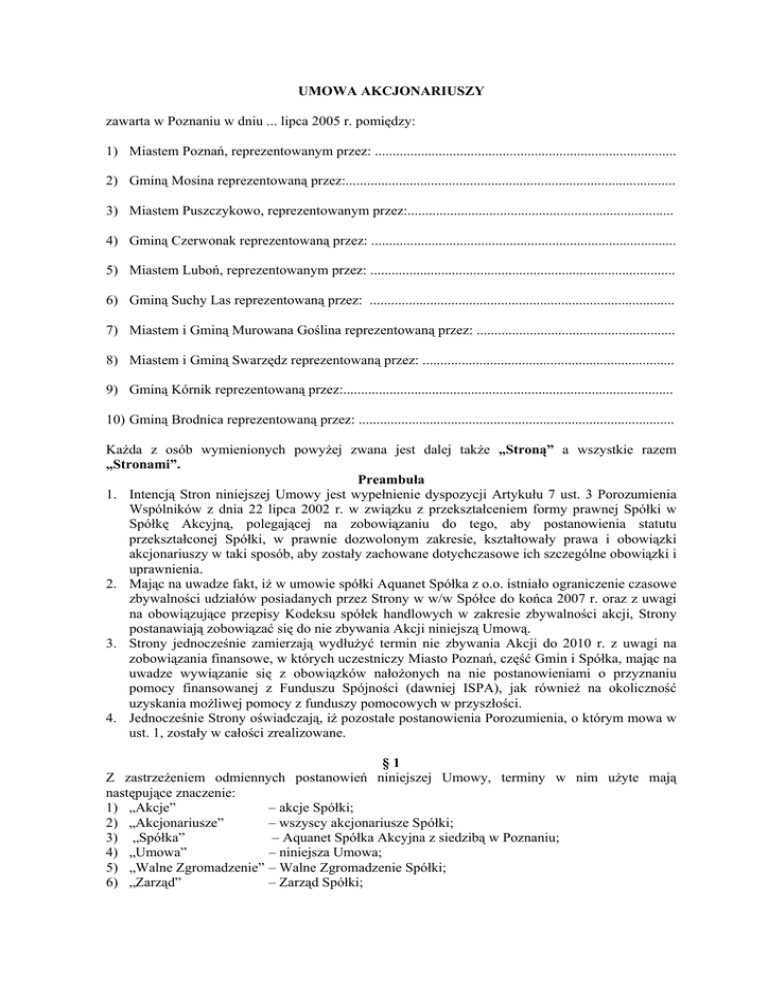 UMOWA AKCJONARIUSZY zawarta w Poznaniu w dniu ... lipca 2005 r. pomiędzy: 1) Miastem Poznań, reprezentowanym przez: ..................................................................................... 2) Gminą Mosina reprezentowaną przez:............................................................................................. 3) Miastem Puszczykowo, reprezentowanym przez:........................................................................... 4) Gminą Czerwonak reprezentowaną przez: ...................................................................................... 5) Miastem Luboń, reprezentowanym przez: ...................................................................................... 6) Gminą Suchy Las reprezentowaną przez: ...................................................................................... 7) Miastem i Gminą Murowana Goślina reprezentowaną przez: ........................................................ 8) Miastem i Gminą Swarzędz reprezentowaną przez: ....................................................................... 9) Gminą Kórnik reprezentowaną przez:............................................................................................. 10) Gminą Brodnica reprezentowaną przez: ......................................................................................... Każda z osób wymienionych powyżej zwana jest dalej także „Stroną” a wszystkie razem „Stronami”. Preambuła 1. Intencją Stron niniejszej Umowy jest wypełnienie dyspozycji Artykułu 7 ust. 3 Porozumienia Wspólników z dnia 22 lipca 2002 r. w związku z przekształceniem formy prawnej Spółki w Spółkę Akcyjną, polegającej na zobowiązaniu do tego, aby postanowienia statutu przekształconej Spółki, w prawnie dozwolonym zakresie, kształtowały prawa i obowiązki akcjonariuszy w taki sposób, aby zostały zachowane dotychczasowe ich szczególne obowiązki i uprawnienia. 2. Mając na uwadze fakt, iż w umowie spółki Aquanet Spółka z o.o. istniało ograniczenie czasowe zbywalności udziałów posiadanych przez Strony w w/w Spółce do końca 2007 r. oraz z uwagi na obowiązujące przepisy Kodeksu spółek handlowych w zakresie zbywalności akcji, Strony postanawiają zobowiązać się do nie zbywania Akcji niniejszą Umową. 3. Strony jednocześnie zamierzają wydłużyć termin nie zbywania Akcji do 2010 r. z uwagi na zobowiązania finansowe, w których uczestniczy Miasto Poznań, część Gmin i Spółka, mając na uwadze wywiązanie się z obowiązków nałożonych na nie postanowieniami o przyznaniu pomocy finansowanej z Funduszu Spójności (dawniej ISPA), jak również na okoliczność uzyskania możliwej pomocy z funduszy pomocowych w przyszłości. 4. Jednocześnie Strony oświadczają, iż pozostałe postanowienia Porozumienia, o którym mowa w ust. 1, zostały w całości zrealizowane. §1 Z zastrzeżeniem odmiennych postanowień niniejszej Umowy, terminy w nim użyte mają następujące znaczenie: 1) „Akcje” – akcje Spółki; 2) „Akcjonariusze” – wszyscy akcjonariusze Spółki; 3) „Spółka” – Aquanet Spółka Akcyjna z siedzibą w Poznaniu; 4) „Umowa” – niniejsza Umowa; 5) „Walne Zgromadzenie” – Walne Zgromadzenie Spółki; 6) „Zarząd” – Zarząd Spółki; §2 1. Strony postanawiają, że dołożą wszelkich starań, aby Spółka, co najmniej do 2010 r., była Spółką o charakterze komunalnym, spełniającą funkcję użyteczności publicznej na terenie Gmin-Stron Umowy i w tym zakresie podejmować będą wszelkie działania, aby taki charakter Spółki zachować, jak również go wzmacniać. 2. Na okoliczność, o której mowa w ust. 1, Strony zobowiązują się wzajemnie, że w okresie pięciu lat od dnia zawarcia niniejszej Umowy, nie zbędą Akcji Spółki na rzecz osób nie będących Stronami niniejszej Umowy, z zastrzeżeniem możliwości zbycia Akcji na rzecz Spółki w celu umorzenia. 3. Zobowiązanie powyższe może być anulowane tylko i wyłącznie zgodną wolą wszystkich Stron niniejszej Umowy. §3 1. Celem wzmacniania komunalnego charakteru Spółki Strony zobowiązują się do głosowania na Walnych Zgromadzeniach „za” wniesieniem przez którąkolwiek ze Stron niniejszej Umowy aportu na podwyższenie kapitału zakładowego Spółki, na który składać się może majątek wodociągowo-kanalizacyjny wytworzony przez Strony lub Związek Międzygminny „Puszcza Zielonka”, który przez Spółkę jest wykorzystywany lub który dotychczas przez Spółkę nie jest wykorzystywany, natomiast wg jej oświadczenia może być przydatny do efektywniejszego prowadzenia działalności zbiorowego zaopatrzenia w wodę i zbiorowego odprowadzania ścieków, lub Stronom służy roszczenie o zwrot nakładów poniesionych na wytworzenie takiego majątku. 2. Strony zobowiązują się wzajemnie do oddania na Walnych Zgromadzeniach głosu „za” uchwałą o rezygnacji w całości lub w części z prawa poboru do objęcia akcji nowej emisji. 3. Jeżeli okaże się to konieczne, Strony zobowiązane są niezwłocznie uzyskać prawem wymagane zgody na wniesienie aportów do Spółki. 4. Strony zobowiązują się do dochodzenia roszczeń, o których mowa w ust. 1, tylko i wyłącznie poprzez wnioskowanie o konwersję wierzytelności na podwyższenie kapitału zakładowego Spółki. §4 1. Strony umowy postanawiają każdorazowo powoływać Radę Nadzorczą Spółki w dziewięcioosobowym składzie. 2. Do czasu, gdy Miasto Poznań będzie posiadało akcje reprezentujące więcej niż 65,6 % udziału w kapitale zakładowym Spółki, będzie uprawnione do wskazywania pięciu kandydatów na członków Rady Nadzorczej Spółki, natomiast pozostałe Strony umowy będą uprawnione do wskazywania jednego kandydata na członka Rady Nadzorczej Spółki. 3. Kandydaci zaproponowani przez Miasto Poznań oraz osoby wybrane przez pracowników Spółki będą powoływani do składu Rady Nadzorczej Spółki n