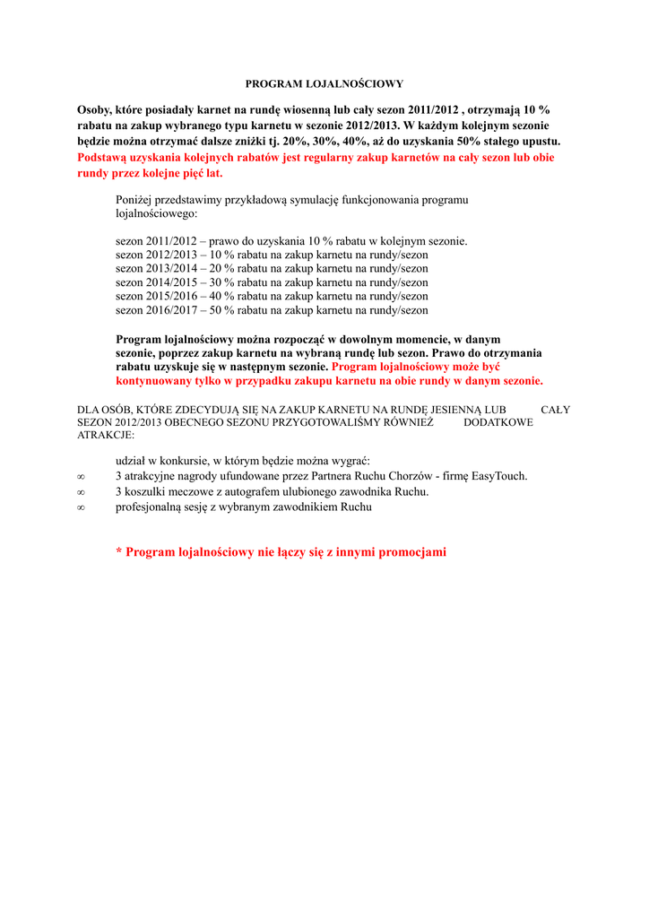 PROGRAM LOJALNOŚCIOWY Osoby, które posiadały karnet na rundę wiosenną lub cały sezon 2011/2012 , otrzymają 10 % rabatu na zakup wybranego typu karnetu w sezonie 2012/2013. W każdym kolejnym sezonie będzie można otrzymać dalsze zniżki tj. 20%, 30%, 40%, aż do uzyskania 50% stałego upustu. Podstawą uzyskania kolejnych rabatów jest regularny zakup karnetów na cały sezon lub obie rundy przez kolejne pięć lat. Poniżej przedstawimy przykładową symulację funkcjonowania programu lojalnościowego: sezon 2011/2012 – prawo do uzyskania 10 % rabatu w kolejnym sezonie. sezon 2012/2013 – 10 % rabatu na zakup karnetu na rundy/sezon sezon 2013/2014 – 20 % rabatu na zakup karnetu na rundy/sezon sezon 2014/2015 – 30 % rabatu na zakup karnetu na rundy/sezon sezon 2015/2016 – 40 % rabatu na zakup karnetu na rundy/sezon sezon 2016/2017 – 50 % rabatu na zakup karnetu na rundy/sezon Program lojalnościowy można rozpocząć w dowolnym momencie, w danym sezonie, poprzez zakup karnetu na wybraną rundę lub sezon. Prawo do otrzymania rabatu uzyskuje się w następnym sezonie. Program lojalnościowy może być kontynuowany tylko w przypadku zakupu karnetu na obie rundy w danym sezonie. DLA OSÓB, KTÓRE ZDECYDUJĄ SIĘ NA ZAKUP KARNETU NA RUNDĘ JESIENNĄ LUB CAŁY SEZON 2012/2013 OBECNEGO SEZONU PRZYGOTOWALIŚMY RÓWNIEŻ DODATKOWE ATRAKCJE: • • • udział w konkursie, w którym będzie można wygrać: 3 atrakcyjne nagrody ufundowane przez Partnera Ruchu Chorzów - firmę EasyTouch. 3 koszulki meczowe z autografem ulubionego zawodnika Ruchu. profesjonalną sesję z wybranym zawodnikiem Ruchu * Program lojalnościowy nie łączy się z innymi promocjami