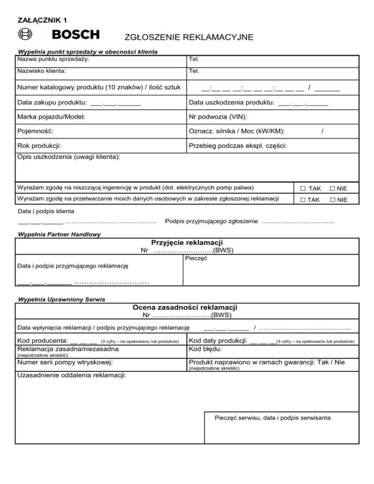 ZAŁĄCZNIK 1 ZGŁOSZENIE REKLAMACYJNE Wypełnia punkt sprzedaży w obecności klienta Nazwa punktu sprzedaży: Tel. Nazwisko klienta: Tel. Numer katalogowy produktu (10 znaków) / ilość sztuk __:__ __ __:__ __ __:__ __ __ / ______ Data zakupu produktu: ___.___.______ Data uszkodzenia produktu: ___.___.______ Marka pojazdu/Model: Nr podwozia (VIN): Pojemność: Oznacz. silnika / Moc (kW/KM): Rok produkcji: Przebieg podczas ekspl. części: / Opis uszkodzenia (uwagi klienta): Wyrażam zgodę na niszczącą ingerencję w produkt (dot. elektrycznych pomp paliwa) Wyrażam zgodę na przetwarzanie moich danych osobowych w zakresie zgłoszonej reklamacji □ TAK □ NIE □ TAK □ NIE Data i podpis klienta ___.___.______ …………………………………….. Podpis przyjmującego zgłoszenie …………………………….. Wypełnia Partner Handlowy Przyjęcie reklamacji Nr ……………………..(BWS) Pieczęć Data i podpis przyjmującego reklamację ___.___.______ ………………………… Wypełnia Uprawniony Serwis Ocena zasadności reklamacji Nr ……………………..(BWS) Data wpłynięcia reklamacji / podpis przyjmującego reklamację Kod producenta: __ __ __ (3 cyfry – na opakowaniu lub produkcie) Reklamacja zasadna/niezasadna ___.___.______ / …………………………………….. Kod daty produkcji: __ __ __(3 cyfry – na opakowaniu lub produkcie) Kod błędu: (niepotrzebne skreślić) Numer serii pompy wtryskowej: Produkt naprawiono w ramach gwarancji: Tak / Nie (niepotrzebne skreślić) Uzasadnienie oddalenia reklamacji: Pieczęć serwisu, data i podpis serwisanta