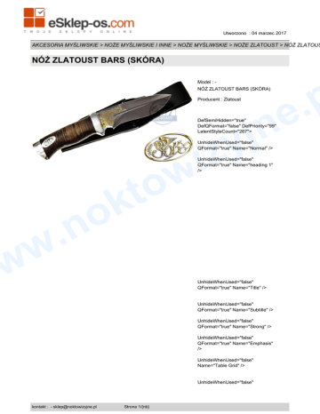 w Utworzono : 04 marzec 2017 AKCESORIA MYŚLIWSKIE > NOŻE MYŚLIWSKIE I INNE > NOŻE MYŚLIWSKIE > NOŻE ZLATOUST > NÓŻ ZLATOUS NÓŻ ZLATOUST BARS (SKÓRA) p . e Model : NÓŻ ZLATOUST BARS (SKÓRA) Producent : Zlatoust n j y iz DefSemiHidden="true" DefQFormat="false" DefPriority="99" LatentStyleCount="267"> UnhideWhenUsed="false" QFormat="true" Name="Normal" /> w o t k o .n UnhideWhenUsed="false" QFormat="true" Name="heading 1" /> w w UnhideWhenUsed="false" QFormat="true" Name="Title" /> UnhideWhenUsed="false" QFormat="true" Name="Subtitle" /> UnhideWhenUsed="false" QFormat="true" Name="Strong" /> UnhideWhenUsed="false" QFormat="true" Name="Emphasis" /> UnhideWhenUsed="false" Name="Table Grid" /> UnhideWhenUsed="false" kontakt : - [email protected] Strona 1/{nb} w Utworzono : 04 marzec 2017 AKCESORIA MYŚLIWSKIE > NOŻE MYŚLIWSKIE I INNE > NOŻE MYŚLIWSKIE > NOŻE ZLATOUST > NÓŻ ZLATOUS NÓŻ ZLATOUST BARS (SKÓRA) p . e QFormat="true" Name="No Spacing" /> UnhideWhenUsed="false" Name="Light Shading" /> n j y iz UnhideWhenUsed="false" Name="Light List" /> UnhideWhenUsed="false" Name="Light Grid" /> UnhideWhenUsed="false" Name="Medium Shading 1" /> w o t k o .n UnhideWhenUsed="false" Name="Medium Shading 2" /> UnhideWhenUsed="false" Name="Medium List 1" /> UnhideWhenUsed="false" Name="Medium List 2" /> UnhideWhenUsed="false" Name="Medium Grid 1" /> w w UnhideWhenUsed="false" Name="Medium Grid 2" /> UnhideWhenUsed="false" Name="Medium Grid 3" /> UnhideWhenUsed="false" Name="Dark List" /> UnhideWhenUsed="false" Name="Colorful Shading" /> UnhideWhenUsed="false" Name="Colorful List" /> UnhideWhenUsed="false" Name="Colorful Grid" /> UnhideWhenUsed="false" Name="Light Shading Accent 1" /> UnhideWhenUsed="false" Name="Light List Accent 1" /> UnhideWhenUsed="false" Name="Light Grid Accent 1" /> UnhideWhenUsed="false" kontakt : - [email protected] Strona 2/{nb} w Utworzono : 04 marzec 2017 AKCESORIA MYŚLIWSKIE > NOŻE MYŚLIWSKIE I INNE > NOŻE MYŚLIWSKIE > NOŻE ZLATOUST > NÓŻ ZLATOUS NÓŻ ZLATOUST BARS (SKÓRA) p . e Name="Medium Shading 1 Accent 1" /> UnhideWhenUsed="false" Name="Medium Shading 2 Accent 1" /> n j y iz UnhideWhenUsed="false" Name="Medium List 1 Accent 1" /> UnhideWhenUsed="false" QFormat="true" Name="List Paragraph" /> w o t k o .n UnhideWhenUsed="false" QFormat="true" Name="Quote" /> UnhideWhenUsed="false" QFormat="true" Name="Intense Quote" /> UnhideWhenUsed="false" Name="Medium List 2 Accent 1" /> UnhideWhenUsed="false" Name="Medium Grid 1 Accent 1" /> w w UnhideWhenUsed="false" Name="Medium Grid 2 Accent 1" /> UnhideWhenUsed="false" Name="Medium Grid 3 Accent 1" /> UnhideWhenUsed="false" Name="Dark List Accent 1" /> UnhideWhenUsed="false" Name="Colorful Shading Accent 1" /> UnhideWhenUsed="false" Name="Colorful List Accent 1" /> UnhideWhenUsed="false" Name="Colorful Grid Accent 1" /> UnhideWhenUsed="false" Name="Light Shading Accent 2" /> UnhideWhenUsed="false" Name="Light List Accent 2" /> UnhideWhenUsed="false" Name="Light Grid Accent 2" /> kontakt : - [email protected] Strona 3/{nb} w Utworzono : 04 marzec 2017 AKCESORIA MYŚLIWSKIE > NOŻE MYŚLIWSKIE I INNE > NOŻE MYŚLIWSKIE > NOŻE ZLATOUST > NÓŻ ZLATOUS NÓŻ ZLATOUST BARS (SKÓRA) p . e UnhideWhenUsed="false" Name="Medium Shading 1 Accent 2" /> n j y iz UnhideWhenUsed="false" Name="Medium Shading 2 Accent 2" /> UnhideWhenUsed="false" Name="Medium List 1 Accent 2" /> UnhideWhenUsed="false" Name="Medium List 2 Accent 2" /> w o t k o .n UnhideWhenUsed="false" Name="Medium Grid 1 Accent 2" /> UnhideWhenUsed="false" Name="Medium Grid 2 Accent 2" /> UnhideWhenUsed="false" Name="Medium Grid 3 Accent 2" /> UnhideWhenUsed="false" Name="Dark List Accent 2" /> w w UnhideWhenUsed="false" Name="Colorful Shading Accent 2" /> UnhideWhenUsed="false" Name="Colorful List Accent 2" /> UnhideWhenUsed="false" Name="Colorful Grid Accent 2" /> UnhideWhenUsed="false" Name="Light Shading Accent 3" /> UnhideWhenUsed="false" Name="Light List Accent 3" /> UnhideWhenUsed="false" Name="Light Grid Accent 3" /> UnhideWhenUsed="false" Name="Medium Shading 1 Accent 3" /> UnhideWhenUsed="false" Name="Medium Shading 2 Accent 3" /> UnhideWhenUsed="false" kontakt : - [email protected] Strona 4/{nb} w Utworzono : 04 marzec 2017 AKCESORIA MYŚLIWSKIE > NOŻE MYŚLIWSKIE I INNE > NOŻE MYŚLIWSKIE > NOŻE ZLATOUST > NÓŻ ZLATOUS NÓŻ ZLATOUST BARS (SKÓRA) p . e Name="Medium List 1 Accent 3" /> UnhideWhenUsed="false" Name="Medium List 2 Accent 3" /> n j y iz UnhideWhenUsed="false" Name="Medium Grid 1 Accent 3" /> UnhideWhenUsed="false" Name="Medium Grid 2 Accent 3" /> UnhideWhenUsed="false" Name="Medium Grid 3 Accent 3" /> w o t k o .n UnhideWhenUsed="false" Name="Dark List Accent 3" /> UnhideWhenUsed="false" Name="Colorful Shading Accent 3" /> UnhideWhenUsed="false" Name="Colorful List Accent 3" /> UnhideWhenUsed="false" Name="Colorful Grid Accent 3" /> w w UnhideWhenUsed="false" Name="Light Shading Accent 4" /> UnhideWhenUsed="false" Name="Light List Accent 4" /> UnhideWhenUsed="false" Name="Light Grid Accent 4" /> UnhideWhenUsed="false" Name="Medium Shading 1 Accent 4" /> UnhideWhenUsed="false" Name="Medium Shading 2 Accent 4" /> UnhideWhenUsed="false" Name="Medium List 1 Accent 4" /> UnhideWhenUsed="false" Name="Medium List 2 Accent 4" /> UnhideWhenUsed="false" Name="Medium Grid 1 Accent 4" /> UnhideWhenUsed="false" Name="Medium Grid 2 Accent 4" /> kontakt : - [email protected] Strona 5/{nb} w Utworzono : 04 marzec 2017 AKCESORIA MYŚLIWSKIE > NOŻE MYŚLIWSKIE I INNE > NOŻE MYŚLIWSKIE > NOŻE ZLATOUST > NÓŻ ZLATOUS NÓŻ ZLATOUST BARS (SKÓRA) p . e UnhideWhenUsed="false" Name="Medium Grid 3 Accent 4" /> UnhideWhenUsed="false" Name="Dark List Accent 4" /> n j y iz UnhideWhenUsed="false" Name="Colorful Shading Accent 4" /> UnhideWhenUsed="false" Name="Colorful List Accent 4" /> w o t k o .n UnhideWhenUsed="false" Name="Colorful Grid Accent 4" /> UnhideWhenUsed="false" Name="Light Shading Accent 5" /> UnhideWhenUsed="false" Name="L