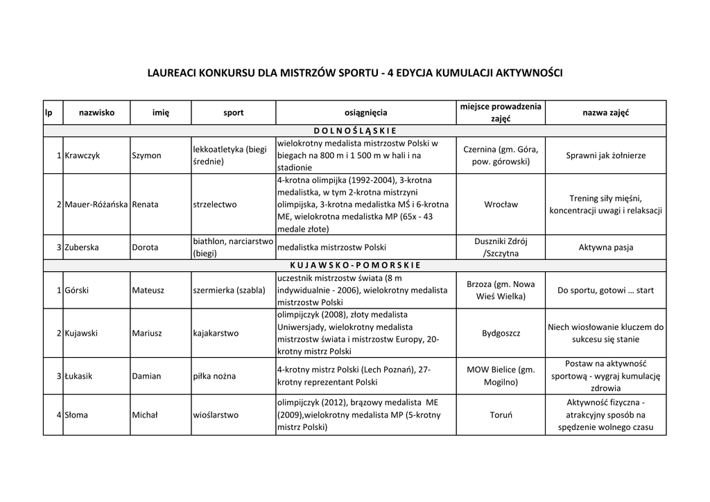 LAUREACI KONKURSU DLA MISTRZÓW SPORTU - 4 EDYCJA KUMULACJI AKTYWNOŚCI lp nazwisko 1 Krawczyk i ię Szymon 2 Mauer-Różańska Renata 3 Zuberska Dorota 1 Górski Mateusz 2 Kujawski Mariusz sport lekkoatletyka (biegi śred ie strzelectwo osiąg ięcia DOLNOŚLĄSKIE wielokrotny medalista mistrzostw Polski w biegach na 800 m i 1 500 m w hali i na stadionie 4-krotna olimpijka (1992-2004), 3-krotna medalistka, w tym 2-krotna mistrzyni oli pijska, -krot a edalistka MŚ i -krot a ME, wielokrotna medalistka MP (65x - 43 edale złote biathlon, narciarstwo medalistka mistrzostw Polski (biegi) KUJAWSKO-POMORSKIE u zest ik istrzostw świata szermierka (szabla) indywidualnie - 2006), wielokrotny medalista mistrzostw Polski oli pij z k , złot edalista Uniwersjady, wielokrotny medalista kajakarstwo istrzostw świata i istrzostw Europ , krotny mistrz Polski 3 Łukasik Damian piłka oż a -krot istrz Polski Le h Poz ań , krotny reprezentant Polski - 4 Sło a Mi hał wioślarstwo oli pij z k , rązow edalista ME (2009),wielokrotny medalista MP (5-krotny mistrz Polski) miejsce prowadzenia zajęć azwa zajęć Czer i a g . Góra, pow. górowski Spraw i jak żoł ierze Wro ław Tre i g sił ięś i, koncentracji uwagi i relaksacji Dusz iki )drój /Szczytna Aktywna pasja Brzoza (gm. Nowa Wieś Wielka Do sportu, gotowi … start Bydgoszcz Nie h wiosłowa ie klu ze suk esu się sta ie do MOW Bielice (gm. Mogilno) Postaw a akt w ość sportową - w graj ku ula ję zdrowia Toruń Akt w ość fiz z a atrak j sposó a spędze ie wol ego zasu LUBELSKIE 1 Jakó z k Damian zapasy medalista mistrzostw Polski Ratoszyn (gm. Chodel, pow. opolski) W graj arze ie - zostań sportowcem )ielo a Góra Symetria - FunFit 2 Rawa Mazowiecka Speł ij swoje arze ie - świat sportu daje zaproszenie Pabianice Let's fence LUBUSKIE 1 Hejduk 1 Pruski 2 Socha Dariusz Mariusz Aleksandra 1 Kł s Katarzyna 2 Migacz Marcin 3 Sudoł Grzegorz karate piłka siatkowa szermierka (szabla) akademicki mistrz Polski, wielokrotny uczestnik mistrzostw Polski ŁÓDZKIE sre r edal I ligi / , złot edal OOM , repreze ta t Polski kadetów i ju iorów 4-krotna olimpijka (2004-2016), indywidualna rązowa edalistka istrzostw świata , 7-krotna medalistka mistrzostw Europy (2krotna mistrzyni Europy: indywidualnie 2004 i druż owo MAŁOPOLSKIE -krot a oli pijka , rązowa Judo w samoobronie dla edalistka istrzostw świata , -krot a Zielonki (pow. dziew ząt w wieku judo wicemistrzyni Europy (2007, 2012), 5-krotna krakowski) gimnazjalnym mistrzyni Polski edalista istrzostw Polski ju iorów i Koź i e Wielkie g . Hokejowa kumulacja hokej na lodzie łodzików , repreze ta t Polski a MEJ Wieliczka) akt w oś i (1991) -krot oli pij z k , rązow lekka atlet ka hód edalista istrzostw świata , Spraw ość fiz z a podstawą Kraków sportowy) wicemistrz Europy (2010), wielokrotny wsz stki h sportów! medalista mistrzostw Polski MAZOWIECKIE 1 Broniewski Kajetan 2 Chojecka-LeandroLidia 3 Dulnik Katarzyna 4 Johne Monika 5 Lesz z ńska Joanna 6 Marcinkiewicz Iwona 7 Nastula 8 Pawlak Paweł Sebastian -krot oli pij z k , rązow medalista Igrzysk Olimpijskich w Barcelonie Warszawa (Praga wioślarstwo i istrzostw świata , istrz Połud ie świata ju iorów wielokrot istrz Polski (24x) 3-krotna olimpijka (2000-2008), 3-krotna rązowa edalistka istrzostw świata i Kosów La ki pow. lekka atletyka (biegi) krot a istrzostw Europ złote edale , Sokołów Podlaski wielokrotna medalistka (27x) i mistrzyni Polski (21x) mistrzyni Europy (1999), mistrzyni Polski kosz kówka Warszawa Mura ów , król strzel ów Ekstraklas indywidualna mistrzyni Polski, medalistka szermierka (szpada) istrzostw świata i istrzostw Europ Warszawa Mokotów druż owo -krot a oli pijka , rązowa wioślarstwo edalistka istrzostw świata i Warszawa (Ochota) wicemistrzyni Europy (2016) 3-krotna olimpijka (1996, 2004 i 2008), rązowa edalistka z Atla t , wielokrot a Warszawa łu z i two medalistka mistrzostw Europy i MP, Śród ieś ie rekordzistka Europy i Polski judo 2-krotny olimpijczyk (1992-1996), mistrz oli pijski z Atla t , -krot istrz świata, krotny mistrz Europy, 13-krotny mistrz Polski Ło ia ki zapasy rązow edalista MPS , istrz Polski ju iorów , repreze ta t Polski a MŚJ (2010) Grę ków pow. węgrowski Akt w ość sportowa jako sposó a suk es w ż iu Poz aj królową sportu Na sportowo z Kasią Dul ik Multisportowo Citius - altius - fortius, każd oże zostać oli pij z kie Radość z w siłku Ustąp a zw ięż sz - te h iki judo (i innych sztuk walki) w samoobronie )ostań istrze - speł ij marzenia! 9 Pietrowski 10 Ratigowski Dariusz piłka siatkowa istrzostwo i wi e istrzostwo Polski ju iorów - z MKS-MDK , założ iel szkółki deskorolki Ło ia ki OSiR skatepark) Czas a deskorolkę! Grzegorz taekwondo olimpijskie wi e istrz Polski se iorów , wi e istrz Młodzieżow h Mistrzostw Polski Legionowo Każd oże zostać istrze , poczuj smak mistrzostwa taekwondo olimpijskie PODKARPACKIE 1 Niewczas Marta karate -krot a istrz i świata, -krot a istrz i Europy, wielokrotna mistrzyni Polski Rzeszów Sport oją pasją PODLASKIE 1 Andrzejewski 2 Wysocki Krzysztof Adam piłka siatkowa medalista mistrzostw Polski kajakarstwo 4-krotny olimpijczyk (1996-2008), 18-krotny edalista istrzostw świata złote , krot edalista istrzostw Europ złote , edalista MP - złote Suwałki IT ożesz zostać istrze Augustów Late kajakie , zi ą a arta h iegow h - kl zajęć … Gdańsk Ż j wesoło a sportowo Gdańsk So ieszewo Sport to gro o prz ja iół, odpowiedzial ość, super organizacja POMORSKIE 1 Bednarska Joanna judo -krot a druż owa klu owa istrz i Polski , -krot a rązowa edalistka mistrzostw Polski (2000, 2005) 2 Englander Krzysztof badminton wielokrotny mistrz Polski 3 Hodura Jarosław rugby 8-krotny mistrz Polski, 39-krotny reprezentant Polski Sopot 4 Kownatke Rafał lekka atletyka p h ię ie kulą 2-krotny halowy mistrz Polski 2011, 2016), 3krotny wicemistrz Polski w hali i na stadionie Starzyno/Puck Rug ie