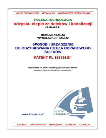 NOWE TECHNOLOGIE WYNALAZKI WZORNICTWO PRZEMYSŁOWE POLSKA TECHNOLOGIA odzysku ciepła ze ścieków i kanalizacji KRAMARZ PL DOKUMENTACJA WYNALAZKU P 345442 SPOSÓB I URZĄDZENIE DO ODZYSKIWANIA CIEPŁA ODPADOWEGO ŚCIEKÓW PATENT PL 198134 B1 Wynalazek PL345442 według systematyki WIPO ( Światowa Organizacja Własności Intelektualnej ) www.kramarz.pl BADANIA OPRACOWANIA WDROśENIA OCHRONA LICENCJE Przedmiotem wynalazków jest sposób i urządzenie do odzyskiwania ciepła SPOSÓB i URZĄDZENIE odpadowego ścieków zwłaszcza do odzyskiwania ciepła domowych i przemysłowych odprowadzan y ch do k an al i zacji odpadowego ścieków zbiorczych poprzez jego absorbcję, magazynowanie i zwrot do zimnego medium, zasilającego te urządzenia grzewcze w których wytwarzana jest ciepła woda uŜytkowa i inne przemysłowe z których po jej zuŜyciu i wykorzystaniu następuje zrzut do instalacji i kanalizacji a dalej oczyszczalni ścieków. Znane są urządzenia, jak na przykład z polskiego opisu patentowego PL 107019 w postaci i do celów, podgrzewacz spręŜonego powietrza lub europejskiego EP 0492799 ciśnieniowy wymiennik ciepła a takŜe amerykańskiego US 5522453 grzejnik płynu pralki automatycznej. JednakŜe Ŝadne z tych urządzeń nie słuŜy i nie nadaje się do celu odzyskiwania ciepła ścieku o ciśnieniu atmosferycznym w przedziale temperatur od 20 do 90 stopni Celsjusza bowiem pierwsze słuŜy do podgrzewania powietrza spręŜonego drugie wymiany ciepła pomiędzy dwoma płynami o róŜnym ciśnieniu a trzecie jako podgrzewacz liniowy płynu pralki automatycznej. Ujawnione teŜ jest urządzenie w polskim opisie wynalazku P. 341715 ściekowy absorber ciepła jako i do wstępnego liniowego odbioru ciepła odpadowego ścieku, słuŜące tak do recyklingu ciepła technologicznego charakterystyczne monoblokiem w którym w odwrotnych do siebie kierunkach płynie zrzucany ściek oraz zimna woda zasilająca urządzenia grzewcze. Celem wynalazku w sposobie odzyskiwania ciepła jest uzyskanie pełnego i efektywnego sposobu odbioru tego ciepła ścieku przy pomocy w/w urządzenia w postaci absorbera i dalszy oraz wcześniejszy jego odbiór a takŜe jego ujęcie poza w/w absorberem w warunkach zastosowania nowych środków technicznych rozdzielenia ścieku zaworem rozdzielającym oraz nowej instalacji do przepływu odrębnego ścieków ciepłych po ich rozdzieleniu zaworem i skierowaniu do instalacji odpływowej ciepłej tworzącej tak odrębny i osobny oraz zamknięty obieg tego ciepła. Istota PATENT sposobu odzyskiwania ciepła 198134 odpadowego ścieków polega na tym, Ŝe ściek poddany po zrzucie z urządzeń go wytwarzających pomiarowi temperatury zaworem inteligętnym zostaje w granicach uzyskanych pomiędzy 20 a 90 stopni Celsjusza skierowany do odrębnej instalacji zrzutu ścieków realizującej obieg zamknięty ciepła za pomocą kilku urządzeń z których w/w pełni rolę absorbera liniowego zaś przedmiotowe rolę absorbera grawitacyjnego oraz wymiennika i magazynu przejściowego ciepła a dwa końcowe rolę urządzeń absorbujących resztki ciepła oraz oczyszczających ten ściek przed zrzutem ostatecznym resztek materialnych tego ścieku do kanalizacji zbiorczych wewnętrznych budynku i zewnętrznych w gruncie czy oczyszczalni. Innymi słowy za pomocą nowych środków technicznych w postaci zaworu inteligentnego czy inaczej temperaturowego oraz nowej i częściowej instalacji zrzutu ścieku ciepłego, ściek jako ciekłe medium zostaje poddane selekcji termicznej i obróbce dalszej polegającej na absorpcji i odbiorze energii cieplnej niesionej grawitacyjnie wraz ze ściekiem przez dwa pierwsze urządzenia w części zasadniczej tego sposobu, dodatkowo wspomaganej tak dwoma nowymi urządzeniami. Selekcja i obróbka ścieku pozwala w części dwóch pierwszych urządzeń odzysk energii cieplnej i ciepła na poziomie minimum 50 procent co oznacza, Ŝe sposób tworzy alternatywne źródło tej energii zaś wykorzystanie dalsze dwóch nowych urządzeń przyczyni się do ochrony środowiska naturalnego. Korzystnie dla sposobu jest jeŜeli ciepło odebrane dwoma urządzeniami i zmagazynowane w jednym z nich trafia w tym samym zamkniętym obiegu do instalacji wody zimnej zasilającej urządzenia grzewcze dla urządzeń zuŜywających to ciepło i wytwarzających zrzucany, oczyszczany ściek. Korzystnie dla sposobu jest jeŜeli system odzyskujący ciepło na odcinku instalacji odpływowej ciepłej od zaworu rozdzielającego do wyjścia z systemu posiada izolację cieplną i termiczną. Istota urządzenia do odzyskiwania ciepła odpadowego ścieków polega na tym, Ŝe tunel, kanał zrzutowy ścieku umieszczony centralnie wewnątrz zbiornika i magazynu przez który płynie woda zimna zasilająca urządzenia grzewcze posiada u swej podstawy i na wyjściu ścieku z tego urządzenia zawór inteligętny ciśnieniowo-temperaturowy, który steruje przepływem ścieku przez to urządzenie w zakresie jego poziomu i wypełnienia zaleŜnego od temperatury oraz ilości zrzutu ścieku ciepłego - tak by max. móc ciepło ścieku odebrać do zbiornika i magazynu. Korzystnie dla urządzenia jest jeŜeli tunel na swoim wewnętrznym i zewnętrznym obwodzie posiada uŜebrowanie wchodzące kontaktowo w obszar obu cieplnych środowisk ścieku i wody. Korzystnie dla urządzenia jest jeŜeli posiada na swoim zewnętrznym obwodzie izolację termiczną chroniącą zbiornik przed nadmierną utratą ciepła juŜ zgromadzonego w jego wnętrzu. Korzystnie dla urządzenia jest jeŜeli moŜe pracować i być instalowane w pionie, poziomie lub pod innym dowolnym kątem pozwalającym na łączenie z zewnętrznymi instalacjami zrzutu tych ścieków lub bezpośrednio na istniejących instalacjach kanalizacyjnych obiektu i w gruncie. Korzystnie dla sposobu oraz urządzenia jest, Ŝe system odzyskujący ciepło w konfiguracji tak złoŜonej moŜe posiadać na odcinku od zaworu Wynalazki są dostępne rozdzielającego d