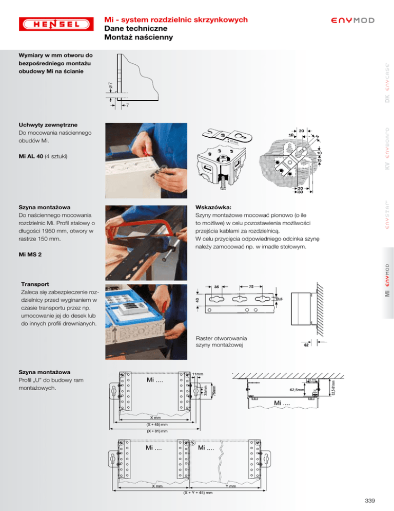 Mi - system rozdzielnic skrzynkowych Dane techniczne Montaż naścienny DK Wymiary w mm otworu do bezpośredniego montażu obudowy Mi na ścianie Uchwyty zewnętrzne Do mocowania naściennego obudów Mi. KV Mi AL 40 (4 sztuki) Szyna montażowa Do naściennego mocowania rozdzielnic Mi. Profil stalowy o długości 1950 mm, otwory w rastrze 150 mm. Wskazówka: Szyny montażowe mocować pionowo (o ile to możliwe) w celu pozostawienia możliwości przejścia kablami za rozdzielnicą. W celu przycięcia odpowiedniego odcinka szynę należy zamocować np. w imadle stołowym. Mi MS 2 Mi Transport Zaleca się zabezpieczenie rozdzielnicy przed wyginaniem w czasie transportu przez np. umocowanie jej do desek lub do innych profili drewnianych. Raster otworowania szyny montażowej Szyna montażowa Profil „U” do budowy ram montażowych. 339 Mi - system rozdzielnic skrzynkowych Dane techniczne Ramy montażowe Ramy montażowe DK Połączenie „T” KV Połączenie „T” Przedłużenie szyny montażowej Mocowanie naścienne Połączenie krzyżowe Mi Mocowanie naścienne regulowane w zakresie 18 mm Ramy montażowe Do stabilizacji dużych rozdzielnic w transporcie, do montażu na ścianie lub jako konstrukcja rozdzielnicy wolnostojącej. MX 0101 MX 0112 MX 0105 MX 0111 340