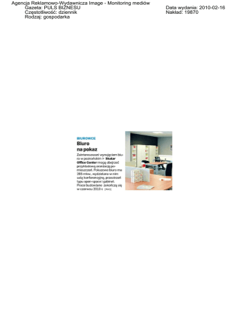 Agencja Reklamowo-Wydawnicza Image - Monitoring mediów Gazeta: PULS BIZNESU Czêstotliwo¶æ: dziennik Rodzaj: gospodarka BIUROWCE Biuro na pokaz Zainteresowani wynajęciem biu ra w poznańskim • Skalar Office Center mogą obejrzeć przykładową aranżację po mieszczeń. Pokazowe biuro ma 265 mkw., wydzielono w nim salę konferencyjną, przestrzeń typu open-space i gabinet. Prace budowlane zakończą się w czerwcu 2010 r. [MAS] Data wydania: 2010-02-16 Nak³ad: 19870