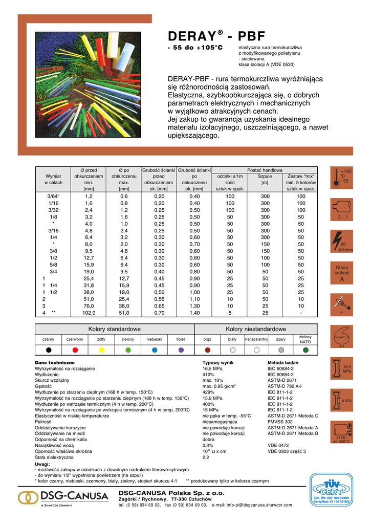 DERAY ® - PBF - 55 do +105°C elastyczna rura termokurczliwa z modyfikowanego polietylenu - sieciowana klasa izolacji A (VDE 0530) DERAY-PBF - rura termokurczliwa wyró˝niajàca si´ ró˝norodnoÊcià zastosowaƒ. Elastyczna, szybkoobkurczajàca si´, o dobrych parametrach elektrycznych i mechanicznych w wyjàtkowo atrakcyjnych cenach. Jej zakup to gwarancja uzyskania idealnego materia∏u izolacyjnego, uszczelniajàcego, a nawet upi´kszajàcego. Wymiar w calach 3/64" 1/16 3/32 1/8 * 3/16 1/4 * 3/8 1/2 5/8 3/4 1 1 1/4 1 1/2 2 3 4 ** Ø przed obkurczeniem min. [mm] Ø po obkurczeniu max. [mm] 1,2 1,6 2,4 3,2 4,0 4,8 6,4 8,0 9,5 12,7 15,9 19,0 25,4 31,8 38,0 51,0 76,0 102,0 0,6 0,8 1,2 1,6 1,0 2,4 3,2 2,0 4,8 6,4 6,4 9,5 12,7 15,9 19,0 25,4 38,0 51,0 GruboÊç Êcianki GruboÊç Êcianki przed po obkurczeniem obkurczeniu ok. [mm] ok. [mm] 0,20 0,20 0,25 0,25 0,25 0,25 0,30 0,30 0,30 0,30 0,30 0,40 0,45 0,45 0,50 0,55 0,65 0,70 odcinki a'1m iloÊç sztuk w opak. 0,40 0,40 0,50 0,50 0,50 0,50 0,60 0,70 0,60 0,60 0,60 0,80 0,90 0,90 1,00 1,10 1,30 1,40 100 100 100 50 50 50 50 50 50 50 50 50 25 25 25 10 10 5 Kolory standardowe czarny czerwony ˝ó∏ty zielony Postaç handlowa Szpule Zestaw "mix" [m] min. 5 kolorów sztuk w opak. 300 300 300 300 300 300 300 150 150 100 100 50 50 50 50 50 25 25 100 100 100 50 50 50 50 50 50 50 50 50 25 25 25 10 10 - Kolory niestandardowe niebieski fiolet Dane techniczne Wytrzyma∏oÊç na rozciàganie Wyd∏u˝enie Skurcz wzd∏u˝ny G´stoÊç Wyd∏u˝enie po starzeniu cieplnym (168 h w temp. 150°C) Wytrzyma∏oÊç na rozciàganie po starzeniu cieplnym (168 h w temp. 150°C) Wyd∏u˝enie po wstrzàsie termicznym (4 h w temp. 200°C) Wytrzyma∏oÊç na rozciàganie po wstrzàsie termicznym (4 h w temp. 200°C) ElastycznoÊç w niskiej temperaturze PalnoÊç Oddzia∏ywanie korozyjne Oddzia∏ywanie na miedê OdpornoÊç na chemikalia NasiàkliwoÊç wodà OpornoÊç w∏aÊciwa skroÊna Sta∏a dielektryczna bràz bia∏y transparentny Typowy wynik 16,5 MPa 410% max. 10% max. 0,95 g/cm3 429% 15,9 MPa 400% 15 MPa nie p´ka w temp. -55°C niesamogasnàca nie powoduje korozji nie powoduje korozji dobra 0,3% 1014 Ω x cm 2,2 szary zielony NATO Metoda badaƒ IEC 60684-2 IEC 60684-2 ASTM-D 2671 ASTM-D 792,A-I IEC 811-1-2 IEC 811-1-2 IEC 811-1-2 IEC 811-1-2 ASTM-D 2671 Metoda C FMVSS 302 ASTM-D 2671 Metoda A ASTM-D 2671 Metoda B VDE 0472 VDE 0303 cz´Êç 3 Uwagi: - mo˝liwoÊç zakupu w odcinkach z dowolnym nadrukiem literowo-cyfrowym - do wymiaru 1/2" wype∏niona powietrzem (na szpuli) * kolor czarny, niebieski, czerwony, bia∏y, zielony, stopieƒ skurczu 4:1 ** produkowany tylko w kolorze czarnym DSG-CANUSA Polska Sp. z o.o. Zagórki / Rychnowy, 77-300 Cz∏uchów tel. (0 59) 834 69 02, fax (0 59) 834 69 03, e-mail: [email protected]
