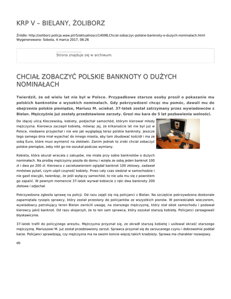 KRP V – BIELANY, ŻOLIBORZ Źródło: http://zoliborz.policja.waw.pl/r5/aktualnosci/14098,Chcial-zobaczyc-polskie-banknoty-o-duzych-nominalach.html Wygenerowano: Sobota, 4 marca 2017, 06:26 Strona znajduje się w archiwum. CHCIAŁ ZOBACZYĆ POLSKIE BANKNOTY O DUŻYCH NOMINAŁACH Twierdził, że od wielu lat nie był w Polsce. Przypadkowe starsze osoby prosił o pokazanie mu polskich banknotów o wysokich nominałach. Gdy pokrzywdzeni chcąc mu pomóc, dawali mu do obejrzenia polskie pieniądze, Mariusz M. uciekał. 37-latek został zatrzymany przez wywiadowców z Bielan. Mężczyźnie już zostały przedstawione zarzuty. Grozi mu kara do 5 lat pozbawienia wolności. Do idącej ulicą Kleczewską, kobiety, podjechał samochód, którym kierował młody mężczyzna. Kierowca zaczepił kobietę, mówiąc jej, że kilkanaście lat nie był już w Polsce, niedawno przyjechał i nie wie jak wyglądają teraz polskie banknoty. Jeszcze tego samego dnia miał wyjechać do innego miasta, aby tam zbudować kościół i ma ze sobą Euro, które musi wymienić na złotówki. Zanim jednak to zrobi chciał zobaczyć polskie pieniądze, żeby nikt go nie oszukał podczas wymiany. Kobieta, która akurat wracała z zakupów, nie miała przy sobie banknotów o dużych nominałach. Na prośbę mężczyzny poszła do domu i wzięła ze sobą jeden banknot 100 zł i dwa po 200 zł. Kierowca z zaciekawieniem oglądał banknot 100 złotowy, zadawał mnóstwo pytań, czym uśpił czujność kobiety. Przez cały czas siedział w samochodzie i nie gasił stacyjki, twierdząc, że jeśli wyłączy samochód, to nie uda mu się z powrotem go zapalić. W pewnym momencie 37-latek wyrwał kobiecie z ręki dwa banknoty 200 złotowe i odjechał. Pokrzywdzona zgłosiła sprawę na policji. Od razu zajęli się nią policjanci z Bielan. Na szczęście pokrzywdzona doskonale zapamiętała rysopis sprawcy, który został przesłany do policjantów ze wszystkich pionów. W poniedziałek wieczorem, wywiadowcy patrolujący teren Bielan zwrócili uwagę, na starszego mężczyznę, który stał obok samochodu i podawał kierowcy jakiś banknot. Od razu skojarzyli, że to ten sam sprawca, który oszukał starszą kobietę. Policjanci zareagowali błyskawicznie. 37-latek trafił do policyjnego aresztu. Mężczyzna przyznał się, ze okradł starszą kobietę i usiłował okraść starszego mężczyznę. Mariuszowi M. już został przedstawiony zarzut. Sprawca przyznał się do zarzucanego czynu i dobrowolnie poddał karze. Policjanci sprawdzają, czy mężczyzna ma na swoim koncie więcej takich kradzieży. Sprawa ma charakter rozwojowy. eb Ocena: 0/5 (0) Tweetnij
