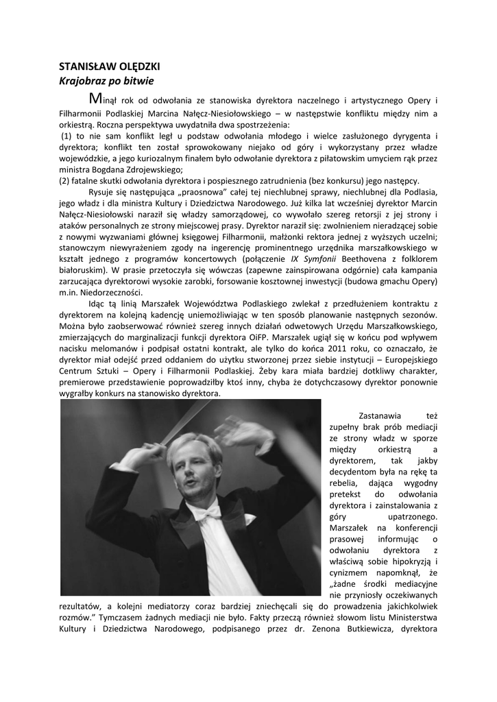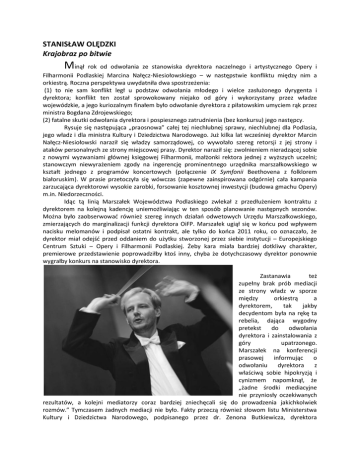 STANISŁAW OLĘDZKI Krajobraz po bitwie Minął rok od odwołania ze stanowiska dyrektora naczelnego i artystycznego Opery i Filharmonii Podlaskiej Marcina Nałęcz-Niesiołowskiego – w następstwie konfliktu między nim a orkiestrą. Roczna perspektywa uwydatniła dwa spostrzeżenia: (1) to nie sam konflikt legł u podstaw odwołania młodego i wielce zasłużonego dyrygenta i dyrektora; konflikt ten został sprowokowany niejako od góry i wykorzystany przez władze wojewódzkie, a jego kuriozalnym finałem było odwołanie dyrektora z piłatowskim umyciem rąk przez ministra Bogdana Zdrojewskiego; (2) fatalne skutki odwołania dyrektora i pospiesznego zatrudnienia (bez konkursu) jego następcy. Rysuje się następująca „praosnowa” całej tej niechlubnej sprawy, niechlubnej dla Podlasia, jego władz i dla ministra Kultury i Dziedzictwa Narodowego. Już kilka lat wcześniej dyrektor Marcin Nałęcz-Niesiołowski naraził się władzy samorządowej, co wywołało szereg retorsji z jej strony i ataków personalnych ze strony miejscowej prasy. Dyrektor naraził się: zwolnieniem nieradzącej sobie z nowymi wyzwaniami głównej księgowej Filharmonii, małżonki rektora jednej z wyższych uczelni; stanowczym niewyrażeniem zgody na ingerencję prominentnego urzędnika marszałkowskiego w kształt jednego z programów koncertowych (połączenie IX Symfonii Beethovena z folklorem białoruskim). W prasie przetoczyła się wówczas (zapewne zainspirowana odgórnie) cała kampania zarzucająca dyrektorowi wysokie zarobki, forsowanie kosztownej inwestycji (budowa gmachu Opery) m.in. Niedorzeczności. Idąc tą linią Marszałek Województwa Podlaskiego zwlekał z przedłużeniem kontraktu z dyrektorem na kolejną kadencję uniemożliwiając w ten sposób planowanie następnych sezonów. Można było zaobserwować również szereg innych działań odwetowych Urzędu Marszałkowskiego, zmierzających do marginalizacji funkcji dyrektora OiFP. Marszałek ugiął się w końcu pod wpływem nacisku melomanów i podpisał ostatni kontrakt, ale tylko do końca 2011 roku, co oznaczało, że dyrektor miał odejść przed oddaniem do użytku stworzonej przez siebie instytucji – Europejskiego Centrum Sztuki – Opery i Filharmonii Podlaskiej. Żeby kara miała bardziej dotkliwy charakter, premierowe przedstawienie poprowadziłby ktoś inny, chyba że dotychczasowy dyrektor ponownie wygrałby konkurs na stanowisko dyrektora. Zastanawia też zupełny brak prób mediacji ze strony władz w sporze między orkiestrą a dyrektorem, tak jakby decydentom była na rękę ta rebelia, dająca wygodny pretekst do odwołania dyrektora i zainstalowania z góry upatrzonego. Marszałek na konferencji prasowej informując o odwołaniu dyrektora z właściwą sobie hipokryzją i cynizmem napomknął, że „żadne środki mediacyjne nie przyniosły oczekiwanych rezultatów, a kolejni mediatorzy coraz bardziej zniechęcali się do prowadzenia jakichkolwiek rozmów.” Tymczasem żadnych mediacji nie było. Fakty przeczą również słowom listu Ministerstwa Kultury i Dziedzictwa Narodowego, podpisanego przez dr. Zenona Butkiewicza, dyrektora Departamentu Narodowych Instytucji Kultury („Minister Kultury i Dziedzictwa Narodowego wielokrotnie interweniował w momencie narastania konfliktu w OiFP, zarówno korespondując w tej sprawie z Marszałkiem Jarosławem Dworzańskim, jak i organizując spotkania mediacyjne, w których uczestniczył osobiście bądź do których delegował upoważnione osoby z resortu. Interwencje oraz mediacje zakończone zostały dopiero w momencie, w którym stała się zupełnie niemożliwa dalsza praca pana Marcina Nałęcza-Niesiołowskiego z orkiestrą OiFP.”) Dążono również do ukarania Marcina NałęczNiesiołowskiego w inny sposób – wytaczając mu sprawy sądowe. Najpierw zawiadomiono prokuraturę o podejrzeniu popełnienia przestępstw formułując 12 zarzutów dotyczących m.in. naruszenia praw pracowniczych przez podpisanie kontraktów artystycznych, nieudzielenie urlopu ojcowskiego, obniżenie premii, niewypłacenie dodatkowego wynagrodzenia. Prokurator umorzył to postępowanie nie dopatrując się znamion czynu zabronionego. Sprawa jednak ciągnęła się dalej i w czerwcu ub. R. Sąd Rejonowy w Białymstoku, XIII Wydział Karny, wydał wyrok skazujący Marcina Nałęcz-Niesiołowskiego, na trzy tysiące złotych grzywny. Po roku Sąd Okręgowy w Białymstoku prawomocnym wyrokiem uniewinniającym zakończył ten spór uznając, że Marcin Nałęcz-Niesiołowski miał prawo do podjętych decyzji. Podobnie zakończyła się sprawa, w której prokuraturę zawiadomił Zarząd Województwa Podlaskiego zarzucając Marcinowi Nałęcz-Niesiołowskiemu narażenie instytucji na straty finansowe od 13 marca do 6 kwietnia ubiegłego roku, czyli w czasie procedury odwoływania go z funkcji dyrektora opery. I w tym wypadku władze podlaskie ośmieszyły się, ponieważ byłemu dyrektorowi prokuratora nie postawiła żadnych zarzutów. Co więcej Wojewódzki Sąd Administracyjny w Białymstoku w prawomocnym wyroku uznał, że odwołanie Marcina Nałęcz-Niesiołowskiego z funkcji dyrektora Opery i Filharmonii Podlaskiej było naruszeniem prawa [podkr. Autora]. Może to mieć ogromne znaczenie dla sprawy, która toczy się przed innym organem – Sądem Pracy. Tam były dyrektor OiFP domaga się przywrócenia na stanowisko. Jednocześnie z Urzędu Marszałkowskiego biegły nieustannie cyniczne komunikaty o mającym się odbyć konkursie i że dotychczasowy jej dyrektor może przecież wziąć w nim udział, a nawet go wygrać. Określam te informacje jako cyniczne, bo od samego początku chodziło o tradycyjne rozwiązanie: „murzyn zrobił swoje…” Dyrektor za wcześnie też wyrósł ponad przeciętność, a za to w podlaskim piekiełku płaci się najwyższą cenę. Już samo sugerowanie, by tak zasłużony dyrektor i dyrygent stawał do konkursu, by móc dalej prowadzić stworzoną 