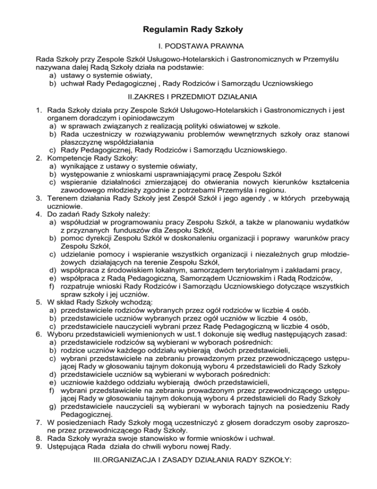 Regulamin Rady Szkoły I. PODSTAWA PRAWNA Rada Szkoły przy Zespole Szkół Usługowo-Hotelarskich i Gastronomicznych w Przemyślu nazywana dalej Radą Szkoły działa na podstawie: a) ustawy o systemie oświaty, b) uchwał Rady Pedagogicznej , Rady Rodziców i Samorządu Uczniowskiego II.ZAKRES I PRZEDMIOT DZIAŁANIA 1. Rada Szkoły działa przy Zespole Szkół Usługowo-Hotelarskich i Gastronomicznych i jest organem doradczym i opiniodawczym a) w sprawach związanych z realizacją polityki oświatowej w szkole. b) Rada uczestniczy w rozwiązywaniu problemów wewnętrznych szkoły oraz stanowi płaszczyznę współdziałania c) Rady Pedagogicznej, Rady Rodziców i Samorządu Uczniowskiego. 2. Kompetencje Rady Szkoły: a) wynikające z ustawy o systemie oświaty, b) występowanie z wnioskami usprawniającymi pracę Zespołu Szkół c) wspieranie działalności zmierzającej do otwierania nowych kierunków kształcenia zawodowego młodzieŜy zgodnie z potrzebami Przemyśla i regionu. 3. Terenem działania Rady Szkoły jest Zespół Szkół i jego agendy , w których przebywają uczniowie. 4. Do zadań Rady Szkoły naleŜy: a) współudział w programowaniu pracy Zespołu Szkół, a takŜe w planowaniu wydatków z przyznanych funduszów dla Zespołu Szkół, b) pomoc dyrekcji Zespołu Szkół w doskonaleniu organizacji i poprawy warunków pracy Zespołu Szkół, c) udzielanie pomocy i wspieranie wszystkich organizacji i niezaleŜnych grup młodzieŜowych działających na terenie Zespołu Szkół, d) współpraca z środowiskiem lokalnym, samorządem terytorialnym i zakładami pracy, e) współpraca z Radą Pedagogiczną, Samorządem Uczniowskim i Radą Rodziców, f) rozpatruje wnioski Rady Rodziców i Samorządu Uczniowskiego dotyczące wszystkich spraw szkoły i jej uczniów. 5. W skład Rady Szkoły wchodzą: a) przedstawiciele rodziców wybranych przez ogół rodziców w liczbie 4 osób. b) przedstawiciele uczniów wybranych przez ogół uczniów w liczbie 4 osób, c) przedstawiciele nauczycieli wybrani przez Radę Pedagogiczną w liczbie 4 osób, 6. Wyboru przedstawicieli wymienionych w ust.1 dokonuje się według następujących zasad: a) przedstawiciele rodziców są wybierani w wyborach pośrednich: b) rodzice uczniów kaŜdego oddziału wybierają dwóch przedstawicieli, c) wybrani przedstawiciele na zebraniu prowadzonym przez przewodniczącego ustępującej Rady w głosowaniu tajnym dokonują wyboru 4 przedstawicieli do Rady Szkoły d) przedstawiciele uczniów są wybierani w wyborach pośrednich: e) uczniowie kaŜdego oddziału wybierają dwóch przedstawicieli, f) wybrani przedstawiciele na zebraniu prowadzonym przez przewodniczącego ustępującej Rady w głosowaniu tajnym dokonują wyboru 4 przedstawicieli do Rady Szkoły g) przedstawiciele nauczycieli są wybierani w wyborach tajnych na posiedzeniu Rady Pedagogicznej. 7. W posiedzeniach Rady Szkoły mogą uczestniczyć z głosem doradczym osoby zaproszone przez przewodniczącego Rady Szkoły. 8. Rada Szkoły wyraŜa swoje stanowisko w formie wniosków i uchwał. 9. Ustępująca Rada działa do chwili wyboru nowej Rady. III.ORGANIZACJA I ZASADY DZIAŁANIA RADY SZKOŁY: 1. W skład Rady Szkoły wchodzą: a) przedstawiciele rodziców wybranych przez ogół rodziców w liczbie 4 osoby, b) przedstawiciele uczniów wybranych przez ogół uczniów w liczbie 4 osoby, c) nauczyciele wybrani przez Radę Pedagogiczną w liczbie 4 osoby. 2. W posiedzeniach Rady Szkoły mogą uczestniczyć z głosem doradczym osoby zaproszone przez przewodniczącego Rady Szkoły. 3. Rada Szkoły wyraŜa swoje stanowisko w formie uchwał. 4. Uchwały zapadają po dyskusji są przedstawiane przez przewodniczącego Rady Szkoły, stanowisko to jest wiąŜące dla wszystkich członków Rady Szkoły. 5. Wnioski zawarte z podjętych uchwał kieruje się do kompetentnych czynników. 6. Decyzje Rady Szkoły są podawane do wiadomości ogółu Zespołu Szkół . 7. Skład Rady Szkoły trwa trzy lata. 1 8. Skład Rady Szkoły w kaŜdym roku szkolnym moŜe być zmieniany składu Rady. 3 9. Członkowie Rady Szkoły są zobowiązani do zachowania tajemnicy obrad. 10. Członek Rady Szkoły nie wywiązujący się z przyjętych na siebie obowiązków moŜe być na wniosek Rady usunięty z członkostwa . 11. Zebrania Rady Szkoły odbywają się w miarę potrzeb nie rzadziej jednak niŜ dwa razy w semestrze . 12. Zebrania Rady Szkoły zwołuje jej przewodniczący. 13. Ustępująca Rada działa do chwili wyboru i ukonstytuowania się nowej Rady. 14. Obowiązkiem członka Rady Szkoły jest czynne uczestnictwo we wszystkich posiedzeniach Rady. 15. Członek Rady Szkoły jest zobowiązany do usprawiedliwienia swojej nieobecności i wcześniejszej jej zgłoszenia przewodniczącemu. IV.ORGANA RADY SZKOŁY 1. Rada Szkoły na pierwszym zebraniu wybiera: przewodniczącego, zastępcę przewodniczącego i sekretarza Rady Szkoły. 2. Przewodniczącego Rady Szkoły wybiera się w tajnym głosowaniu ilością głosów 50% +1głos. 3. Przewodniczący Radu Szkoły kieruje i reprezentuje Radę w Zespole i na zewnątrz. 4. W przypadku zmiany przepisów oświatowych w niniejszym regulaminie zostaną wprowadzone korekty. 5. Rada Szkoły ma prawo wnosić zmiany w regulaminie Rady. V.WYBORY UZUPEŁNIAJĄCE DO RADY SZKOŁY Wybory uzupełniające przedstawicieli uczniów w Radzie Szkoły: 1. Ogłoszenie wyborów uzupełniających do Rady Szkoły. 2. KaŜda klasa podaje co najmniej jednego kandydata. 3. Kandydaci na zebraniu, w tajnym głosowaniu wybierają swoich przedstawicieli w Radzie Szkoły. Wybory uzupełniające przedstawicieli rodziców w Radzie Szkoły: 1. Ogłoszenie wyborów uzupełniających do Rady Szkoły. 2. Wyłonienie kandydatów. 3. Kandydaci na zebraniu, w tajnym głosowaniu wybierają swoich przedstawicieli w Radzie Szkoły. Wybory uzupełniające przedstawicieli nauczycieli w Radzie Szkoły : 1. wyłonienie kandydatów ( na Radzie Pedagogicznej). 2. wybranie spośród kandydat