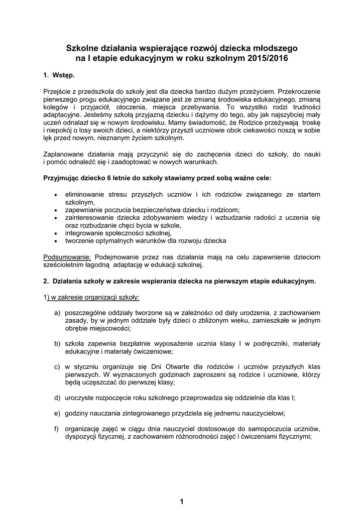 Szkolne działania wspierające rozwój dziecka młodszego na I etapie edukacyjnym w roku szkolnym 2015/2016 1. Wstęp. Przejście z przedszkola do szkoły jest dla dziecka bardzo dużym przeżyciem. Przekroczenie pierwszego progu edukacyjnego związane jest ze zmianą środowiska edukacyjnego, zmianą kolegów i przyjaciół, otoczenia, miejsca przebywania. To wszystko rodzi trudności adaptacyjne. Jesteśmy szkołą przyjazną dziecku i dążymy do tego, aby jak najszybciej mały uczeń odnalazł się w nowym środowisku. Mamy świadomość, że Rodzice przeżywają troskę i niepokój o losy swoich dzieci, a niektórzy przyszli uczniowie obok ciekawości noszą w sobie lęk przed nowym, nieznanym życiem szkolnym. Zaplanowane działania mają przyczynić się do zachęcenia dzieci do szkoły, do nauki i pomóc odnaleźć się i zaadoptować w nowych warunkach. Przyjmując dziecko 6 letnie do szkoły stawiamy przed sobą ważne cele: eliminowanie stresu przyszłych uczniów i ich rodziców związanego ze startem szkolnym, zapewnianie poczucia bezpieczeństwa dziecku i rodzicom; zainteresowanie dziecka zdobywaniem wiedzy i wzbudzanie radości z uczenia się oraz rozbudzanie chęci bycia w szkole, integrowanie społeczności szkolnej, tworzenie optymalnych warunków dla rozwoju dziecka Podsumowanie: Podejmowanie przez nas działania mają na celu zapewnienie dzieciom sześcioletnim łagodną adaptację w edukacji szkolnej. 2. Działania szkoły w zakresie wspierania dziecka na pierwszym etapie edukacyjnym. 1) w zakresie organizacji szkoły: a) poszczególne oddziały tworzone są w zależności od daty urodzenia, z zachowaniem zasady, by w jednym oddziale były dzieci o zbliżonym wieku, zamieszkałe w jednym obrębie miejscowości; b) szkoła zapewnia bezpłatnie wyposażenie ucznia klasy I w podręczniki, materiały edukacyjne i materiały ćwiczeniowe; c) w styczniu organizuje się Dni Otwarte dla rodziców i uczniów przyszłych klas pierwszych. W wyznaczonych godzinach zaproszeni są rodzice i uczniowie, którzy będą uczęszczać do pierwszej klasy; d) uroczyste rozpoczęcie roku szkolnego przeprowadza się oddzielnie dla klas I; e) godziny nauczania zintegrowanego przydziela się jednemu nauczycielowi; f) organizację zajęć w ciągu dnia nauczyciel dostosowuje do samopoczucia uczniów, dyspozycji fizycznej, z zachowaniem różnorodności zajęć i ćwiczeniami fizycznymi; 1 g) wyposażenie pomieszczenia klasowego (stoliki, ławeczki, szafki, pomoce dydaktyczne) posiadają właściwe atesty i zapewniają ergonomiczne warunki nauki i zabawy; h) sale lekcyjne dla klas pierwszych ulokowane są na parterze szkoły głównej; i) nauczyciel sam określa przerwy w zajęciach i w czasie ich trwania organizuje zabawy i pozostaje z dziećmi, oprócz przerw szkolnych, podczas których nauczyciel pełni dyżur zgodnie z harmonogramem; j) świetlica dla dzieci najmłodszych jest zorganizowana w osobnym budynku. Zajęcia w świetlicy szkolnej zapewniają dzieciom pełne bezpieczeństwo. Rozbudzają szereg zainteresowań z dziedziny sztuk plastycznych, czytelnictwa, wzmacniają zachowania społeczne. Umożliwiają odpoczynek na świeżym powietrzu oraz odrobienie pracy domowej. Świetlica jest czynna od godz. 6.45 – do 16.30. 2) w zakresie sprawowania opieki: a) w szkole zorganizowany jest stały dyżur pracowników obsługi przy drzwiach wejściowych uniemożliwiający przebywanie osób postronnych w budynku szkolnym; b) w pierwszym miesiącu nauki rodzice mogą odprowadzić dziecko do miejsca przebierania się dzieci-szafek mieszczących się na korytarzu obok przydzielonych sal lekcyjnych; c) w pozostałych miesiącach opiekę nad przychodzącymi dziećmi pełni nauczyciel dyżurujący; d) w przypadku, gdy dziecko przed zajęciami przebywało w świetlicy, na zajęcia dydaktyczne odprowadza je nauczyciel świetlicy lub specjalnie wyznaczony nauczyciel dyżurny; e) nauczyciel prowadzący ostatnią lekcję każdego dnia z pierwszoklasistami dopilnowuje, aby dzieci spakowały swoje rzeczy do plecaków lub indywidualnych szafek oraz pilnuje, aby dzieci właściwie się ubrały idąc do domu; f) w czasie pory obiadowej nauczyciele pełnią dyżury na stołówce otaczając opieką uczniów klas I-III, w tym pierwszoklasistów, aby umożliwić dzieciom spożywanie posiłku w atmosferze spokoju i bez pośpiechu; g) dzieciom z klas młodszych, w tym również 6-latkom szkoła zapewnia napoje mleczne i owocowe oraz warzywne przekąski, a także wodę lub ciepłą herbatę przez cały rok szkolny; h) dla wszystkich uczniów w szkole (w tym uczniów klas I-III) ustalona jest przerwa śniadaniowa podczas, której spożywają posiłek w salach lekcyjnych. Wychowawca lub inny nauczyciel zapewnia właściwą opiekę i dba o higienę i estetykę jedzenia; i) każdy nauczyciel w szkole (nie tylko uczący w kl.1 i dyżurujący) oraz każdy pracownik niepedagogiczny szkoły ma za zadanie zwracać szczególną uwagę na najmłodszych uczniów, na ich potrzeby, zachowanie i reagować w sposób adekwatny do sytuacji. 2 3) w zakresie prowadzenia procesu dydaktyczno- wychowawczego: a) wyboru materiałów ćwiczeniowych dokonuje nauczyciel edukacji wczesnoszkolnej z zachowaniem, że materiały ćwiczeniowe są skorelowane z przyjętym programem nauczania, a wartość kwotowa mieści się w dotacji celowej; b) na podstawie dostarczonej przez rodziców dokumentacji przedszkolnej oraz zaświadczeń z poradni psychologiczno-pedagogicznej nauczyciel opracowuje plan pracy dydaktycznej oraz dostosowuje wymagania edukacyjne do potrzeb i możliwości uczniów ze specjalnymi potrzebami edukacyjnymi; c) realizacja programu nauczania skoncentrowana jest na indywidualnym tempie rozwoju i możliwościach uczenia się; dziecku, na jego d) każdy nauczyciel uczący w klasie pierwszej indywidualizuje proces dydaktyczny różnicując poziom trudności ćwiczeń realizowanych nie tylko na zajęciach, ale również zadań domowych; e