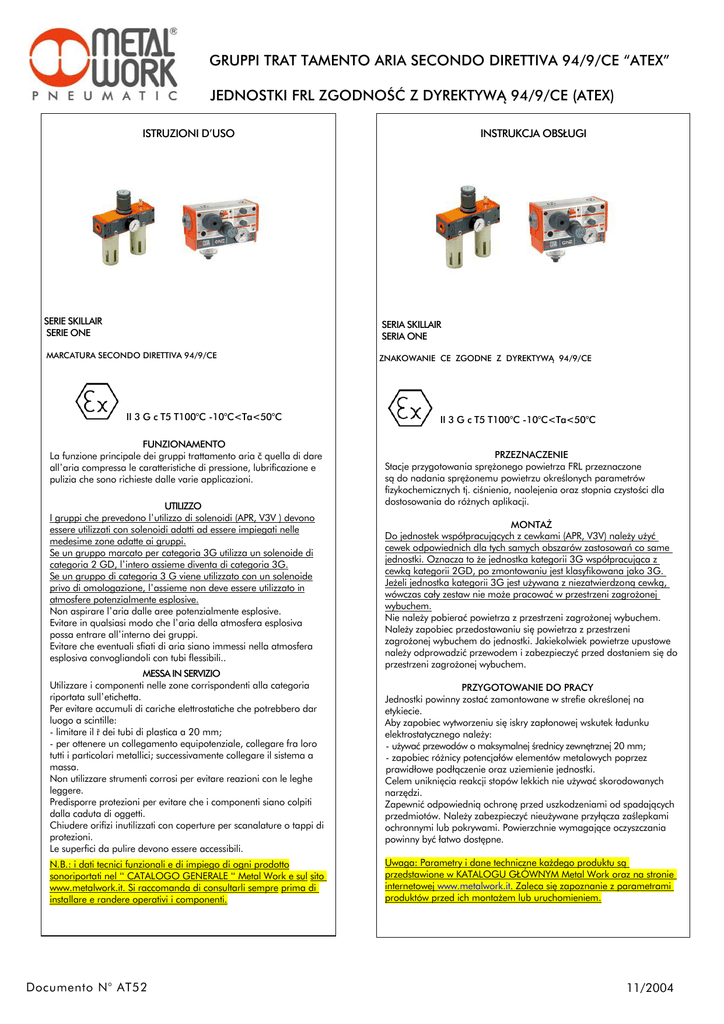 GRUPPI TRAT TAMENTO ARIA SECONDO DIRETTIVA 94/9/CE “ATEX” JEDNOSTKI FRL ZGODNOŚĆ Z DYREKTYWĄ 94/9/CE (ATEX) ISTRUZIONI D’USO INSTRUKCJA OBSŁUGI SERIE SKILLAIR SERIE ONE SERIA SKILLAIR SERIA ONE MARCATURA SECONDO DIRETTIVA 94/9/CE ZNAKOWANIE CE ZGODNE Z DYREKTYWĄ 94/9/CE II 3 G c T5 T100°C -10°C<Ta<50°C FUNZIONAMENTO La funzione principale dei gruppi trattamento aria č quella di dare all’aria compressa le caratteristiche di pressione, lubrificazione e pulizia che sono richieste dalle varie applicazioni. UTILIZZO I gruppi che prevedono l’utilizzo di solenoidi (APR, V3V ) devono essere utilizzati con solenoidi adatti ad essere impiegati nelle medesime zone adatte ai gruppi. Se un gruppo marcato per categoria 3G utilizza un solenoide di categoria 2 GD, l’intero assieme diventa di categoria 3G. Se un gruppo di categoria 3 G viene utilizzato con un solenoide privo di omologazione, l’assieme non deve essere utilizzato in atmosfere potenzialmente esplosive. Non aspirare l’aria dalle aree potenzialmente esplosive. Evitare in qualsiasi modo che l’aria della atmosfera esplosiva possa entrare all’interno dei gruppi. Evitare che eventuali sfiati di aria siano immessi nella atmosfera esplosiva convogliandoli con tubi flessibili.. MESSA IN SERVIZIO Utilizzare i componenti nelle zone corrispondenti alla categoria riportata sull’etichetta. Per evitare accumuli di cariche elettrostatiche che potrebbero dar luogo a scintille: - limitare il ř dei tubi di plastica a 20 mm; - per ottenere un collegamento equipotenziale, collegare fra loro tutti i particolari metallici; successivamente collegare il sistema a massa. Non utilizzare strumenti corrosi per evitare reazioni con le leghe leggere. Predisporre protezioni per evitare che i componenti siano colpiti dalla caduta di oggetti. Chiudere orifizi inutilizzati con coperture per scanalature o tappi di protezioni. Le superfici da pulire devono essere accessibili. N.B.: i dati tecnici funzionali e di impiego di ogni prodotto sonoriportati nel “ CATALOGO GENERALE “ Metal Work e sul sito www.metalwork.it. Si raccomanda di consultarli sempre prima di installare e randere operativi i componenti. Documento N° AT52 II 3 G c T5 T100°C -10°C<Ta<50°C PRZEZNACZENIE Stacje przygotowania sprężonego powietrza FRL przeznaczone są do nadania sprężonemu powietrzu określonych parametrów fizykochemicznych tj. ciśnienia, naolejenia oraz stopnia czystości dla dostosowania do różnych aplikacji. MONTAŻ Do jednostek współpracujących z cewkami (APR, V3V) należy użyć cewek odpowiednich dla tych samych obszarów zastosowań co same jednostki. Oznacza to że jednostka kategorii 3G współpracująca z cewką kategorii 2GD, po zmontowaniu jest klasyfikowana jako 3G. Jeżeli jednostka kategorii 3G jest używana z niezatwierdzoną cewką, wówczas cały zestaw nie może pracować w przestrzeni zagrożonej wybuchem. Nie należy pobierać powietrza z przestrzeni zagrożonej wybuchem. Należy zapobiec przedostawaniu się powietrza z przestrzeni zagrożonej wybuchem do jednostki. Jakiekolwiek powietrze upustowe należy odprowadzić przewodem i zabezpieczyć przed dostaniem się do przestrzeni zagrożonej wybuchem. PRZYGOTOWANIE DO PRACY Jednostki powinny zostać zamontowane w strefie określonej na etykiecie. Aby zapobiec wytworzeniu się iskry zapłonowej wskutek ładunku elektrostatycznego należy: - używać przewodów o maksymalnej średnicy zewnętrznej 20 mm; - zapobiec różnicy potencjałów elementów metalowych poprzez prawidłowe podłączenie oraz uziemienie jednostki. Celem uniknięcia reakcji stopów lekkich nie używać skorodowanych narzędzi. Zapewnić odpowiednią ochronę przed uszkodzeniami od spadających przedmiotów. Należy zabezpieczyć nieużywane przyłącza zaślepkami ochronnymi lub pokrywami. Powierzchnie wymagające oczyszczania powinny być łatwo dostępne. Uwaga: Parametry i dane techniczne każdego produktu są przedstawione w KATALOGU GŁÓWNYM Metal Work oraz na stronie internetowej www.metalwork.it. Zaleca się zapoznanie z parametrami produktów przed ich montażem lub uruchomieniem. 11/2004 REGOLATORI INCONVENIENTI Il regolatore scarica aria dal relieving ZAWORY REDUKCYJNE CAUSE Il regolatore č montato al contrario RIMEDI Verificare le frecce che indicano la direzione del flusso ed eventualmente collegare correttamente il regolatore Pressione di valle superiore alla pressione impostata Al raggiungimento dell’equilibrio delle due pressioni lo scarico dal relieving cessa La pressione di monte č piů bassa di quella impostata Adeguare la pressione di monte Pressione di targa troppo bassa Verificare i dati di targa del regolatore Eccessivo prelievo d’aria Verificare sul catalogo i grafici pressione /portata relativi al regolatore Regolazione poco sensibile Pressione di targa troppo alta Dopo un prelievo di aria la pressione risulta minore di quella impostata in precedenza Il regolatore č stato impostato in discesa (da una pressione piů alta ad una piů bassa) La manopola č in posizione lock Per ottenere una maggiore sensibilitŕ, utilizzare un reg. con pressione di targa il piů vicino possibile alla pressione desiderata La pressione deve sempre essere impostata in salita (da una pressione piů bassa ad una piů alta) Il regolatore non raggiunge la pressione voluta La manopola non gira Sbloccare la manopola tirandola verso l’alto e quindi effettuare la regolazione FILTRO INCONVENIENTI Il filtro non scarica la condensa accumulata Zawór redukcyjny nie osiąga wymaganego ciśnienia wyjściowego PRZYCZYNA Odwrotne podłączenie zaworu redukcyjnego ROZWIĄZANIE Sprawdzenie strzałek na korpusie z kierunkiem przepływu i poprawne podłączenie zaworu. Ciśnienie wyjściowe wyższe od zadanego Samoczynne zatrzymanie upustu powietrza po wyrównaniu ciśnień. Ciśnienie wejściowe niższe niż zadane Regulacja ciśnienia zasilającego. Zbyt mały zakres Sprawdzenie zakresu ciśnień regulacji wyjściowy