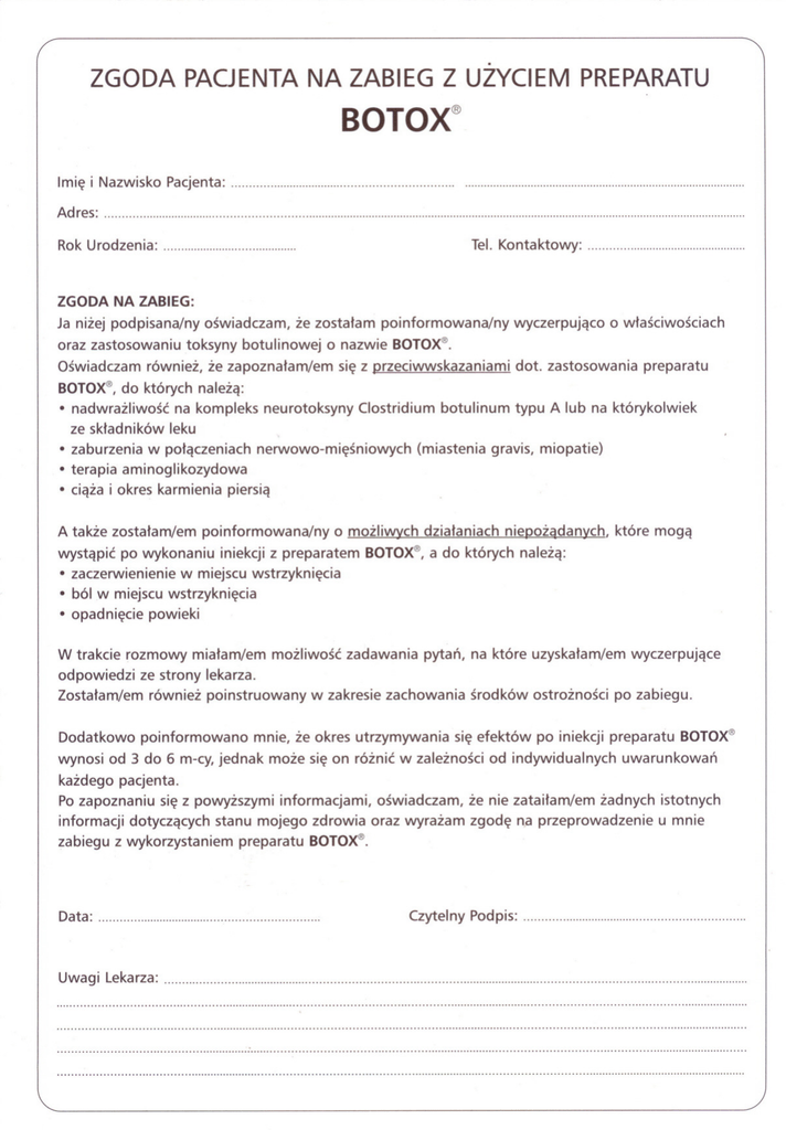 · ZGODA PACJENTA NA ZABIEG Z UZYCIEM PREPARATU BOTOX® Imie i Nazwisko Pacjenta: . Ad res: . Rok Urodzenia: ZGODA . Tel. Kontaktowy: . NA ZABIEG: Ja nizej podpisana/ny oraz zastosowaniu Oswiadczam oswiadczam, ze zostalam toksyny botulinowej równiez, poinformowana/ny wyczerpujaco o wlasciwosciach o nazwie BOTOX®. ze zapoznalam/em sie z przeciwwskazaniami dot. zastosowania preparatu BOTOX®, do których naleza: • nadwrazliwosc na kompleks neurotoksyny ze skladników leku • zaburzenia w polaczeniach Clostridium nerwowo-miesniowych botulinum (miastenia typu A lub na którykolwiek gravis, miopatie) • terapia aminoglikozydowa • ciaza i okres karmienia A takze zostalam/em piersia poinformowana/ny wystapic po wykonaniu • zaczerwienienie o mozliwych iniekcji z preparatem dzialaniach niepozadanych, które moga BOTOX®, a do których naleza: w miejscu wstrzykniecia • ból w miejscu wstrzykniecia • opadniecie powieki W trakcie rozmowy odpowiedzi Zostalam/em Dodatkowo mialam/em mozliwosc zadawania pytan, na które uzyskalam/em wyczerpujace ze strony lekarza. równiez poinstruowany poinformowano w zakresie zachowania mnie, ze okres utrzymywania srodków ostroznosci po zabiegu. sie efektów po iniekcji preparatu wynosi od 3 do 6 m-cy, jednak moze sie on róznic w zaleznosci od indywidualnych BOTOX® uwarunkowan kazdego pacjenta. Po zapoznaniu informacji sie z powyzszymi dotyczacych informacjami, oswiadczam, stanu mojego zdrowia oraz wyrazam zabiegu z wykorzystaniem Data: Uwag i leka rza: preparatu ze nie zatailam/em zadnych istotnych zgode na przeprowadzenie u mnie BOTOX®. . Czytel ny Pod pis: . .