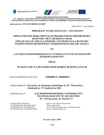 Projekt nr WND-POIG.02.02.00-32-001/08-00 pn.: „Budowa i wyposaŜenie Centrum Bioimmobilizacji i Innowacyjnych Materiałów Opakowaniowych” jest współfinansowany przez Unię Europejską ze środków Europejskiego Funduszu Rozwoju Regionalnego znak sprawy: ZP/ATI/CBiIMO/16/2009 Załącznik nr 1 specyfikacji PROGRAM FUNKCJONALNO - UśYTKOWY OPRACOWANIE DOKUMENTACJI PROJEKTOWEJ PRZEBUDOWY BUDYNKU NR 9 i BUDOWLI NR 60 (ZWIĄZANEJ ZE ZMIANĄ SPOSOBU UśYTKOWANIA Z BUDYNKU WARSZTATOWO-BIUROWEGO I PODZIEMNEGO SKŁADU OPAŁU) NA „CENTRUM BIOIMMOBILIZACJI I INNOWACYJNYCH MATERIAŁÓW OPAKOWANIOWYCH” ORAZ WYKONANIE NA JEJ PODSTAWIE ROBÓT BUDOWLANYCH KOD ZAMÓWIENIA WG CPV: 74000000-9; 45000000-7 ADRES OBIEKTU: Szczecin, ul. Klemensa Janickiego nr 35 / Wernyhory, (budynek nr 9 i budowla nr 60) ZAMAWIAJĄCY: ZACHODNIOPOMORSKI UNIWERSYTET TECHNOLOGICZNY W SZCZECINIE 70 - 310 Szczecin, Al. Piastów 17 AUTOR OPRACOWANIA: AUTOR BRANZY BUDOWLANEJ: AUTOR BRANZY SANITARNEJ: AUTOR BRANZY ELEKTRYCZNEJ: mgr inŜ. arch. Robert Dawidowski Tomasz Jackowski dr inŜ. Adam Krupiński, Krzysztof Dobrowolski mgr inŜ. Sebastian Krawiec Szczecin, lipiec 2009 1/100 Projekt nr WND-POIG.02.02.00-32-001/08-00 pn.: „Budowa i wyposaŜenie Centrum Bioimmobilizacji i Innowacyjnych Materiałów Opakowaniowych” jest współfinansowany przez Unię Europejską ze środków Europejskiego Funduszu Rozwoju Regionalnego znak sprawy: ZP/ATI/CBiIMO/16/2009 SPIS ZAWARTOŚCI 1. Strona tytułowa Spis zawartości programu funkcjonalno – uŜytkowego Klasyfikacja usług projektowych wg słownika CPC Klasyfikacja robót budowlanych wg słownika CPV 2. Część opisowa 2.1 Opis ogólny przedmiotu zamówienia 2.1.1. Charakterystyczne parametry określające wielkość obiektu 2.1.2. Aktualne uwarunkowania wykonania przedmiotu zamówienia 2.1.3. Ogólne właściwości funkcjonalno – uŜytkowe 2.1.4. Szczegółowe właściwości funkcjonalno – uŜytkowe 2.2 Opis wymagań Zamawiającego w stosunku do przedmiotu zamówienia 2.2.1. Przygotowanie terenu budowy 2.2.2. Wymagania dotyczące architektury 2.2.3. Wymagania dotyczące konstrukcji 2.2.4. Wymagania dotyczące instalacji 2.2.4.1 Wymagania dotyczące instalacji sanitarnych 2.2.4.2 Wymagania dotyczące instalacji elektrycznych i teletechnicznych 2.2.5. Wymagania dotyczące wykończenia 2.2.6. Wymagania dotyczące zagospodarowania terenu 2.2.7. Warunki wykonania i odbioru robót budowlanych (Specyfikacja Techniczna) 3. Część informacyjna 3.1 Dokumenty potwierdzające zgodność zamierzenia budowlanego z wymaganiami wynikającymi z odrębnych przepisów 3.2 Oświadczenie Zamawiającego stwierdzające jego prawo do dysponowania nieruchomością na cele budowlane 3.3 Przepisy prawne i normy związane z projektowaniem i wykonaniem zamówienia budowlanego 3.4 Inne informacje i dokumenty niezbędne do zaprojektowania robót budowlanych 3.5 Ogólna Inwentaryzacja 4. Wykaz załączników 2/100 Projekt nr WND-POIG.02.02.00-32-001/08-00 pn.: „Budowa i wyposaŜenie Centrum Bioimmobilizacji i Innowacyjnych Materiałów Opakowaniowych” jest współfinansowany przez Unię Europejską ze środków Europejskiego Funduszu Rozwoju Regionalnego znak sprawy: ZP/ATI/CBiIMO/16/2009 KLASYFIKACJA USŁUG PROJEKTOWYCH WG SŁOWNIKA CPV DZIAŁ 74000000-9 Usługi profesjonalne w zakresie architektury i inŜynierii GRUPA 74200000-1 Usługi doradcze dotyczące architektury i inŜynierii KLASA 74220000-7 Usługi architektoniczne i podobne 74230000-0 Usługi inŜynieryjne KATEGORIA 74222000-1 Usługi projektowania architektonicznego 74232000-4 Usługi inŜynieryjne w zakresie projektowania 3/100 Projekt nr WND-POIG.02.02.00-32-001/08-00 pn.: „Budowa i wyposaŜenie Centrum Bioimmobilizacji i Innowacyjnych Materiałów Opakowaniowych” jest współfinansowany przez Unię Europejską ze środków Europejskiego Funduszu Rozwoju Regionalnego znak sprawy: ZP/ATI/CBiIMO/16/2009 KLASYFIKACJA ROBÓT BUDOWLANYCH WG SŁOWNIKA CPV DZIAŁ 45000000-7 Prace budowlane GRUPA 452000009 Wznoszenie kompletnych obiektów budowlanych 45300000-0 Roboty w zakresie instalacji budowlanych 45400000-1 Roboty wykończeniowe w zakresie obiektów budowlanych KLASA 45210000-2 45310000-3 45320000-6 45330000-9 45340000-2 45410000-4 45420000-7 45430000-0 45440000-3 45450000-6 Roboty budowlane w zakresie budynków Roboty w zakresie instalacji elektrycznych Roboty izolacyjne Hydraulika i roboty sanitarne Instalowanie sprzętu ochronnego Tynkowanie Roboty w zakresie zakładania stolarki budowlanej Pokrywanie podłóg i ścian Roboty malarskie i szklarskie Roboty budowlane wykończeniowe KATEGORIA 45214000-0 Roboty budowlane w zakresie budowy obiektów budowlanych związanych z edukacją i badaniami 45311000-0 Roboty w zakresie przewodów instalacji elektrycznych oraz opraw elektrycznych 45312000-7 Instalowanie systemów alarmowych i anten 45313000-4 Instalowanie wind 45314000-1 Instalowanie sprzętu telekomunikacyjnego 45316000-5 Instalowanie systemów oświetleniowych i sygnalizacyjnych 45316200-7 Instalowanie sprzętu sygnalizacyjnego 45317000-2 Inne instalacje elektryczne 45321000-3 Izolacja cieplna 45323000-7 Izolacja dźwiękoszczelna 45324000-4 Tynkowanie 45331000-6 Instalacje cieplne, wentylacyjne i konfekcjonowania powietrza 45333000-0 Roboty instalacyjne gazowe 45343000-3 Roboty instalacyjne przeciwpoŜarowe 45421000-4 Roboty w zakresie stolarki budowlanej 45431000-7 Kładzenie płytek 45432000-4 Kładzenie i układanie podłóg, ścian i tapetowanie ścian 45441000-0 Roboty szklarskie 45442000-7 Nakładanie powierzchni kryjących 45452000-0 Zewnętrzne czyszczenie budynków 4/100 Projekt nr WND-POIG.02.02.00-32-001/08-00 pn.: „Budowa i wyposaŜenie Centrum Bioimmobilizacji i Innowacyjnych Materiałów Opakowaniowych” jest współfinansowany przez Unię Europejską ze środków Europejskiego Funduszu Rozwoju Regionalnego znak sprawy: ZP/ATI/CBiIMO/16/2009 MEBLE 39173000-5 - Meble do przechowywania 39180000-7 - Meble labora